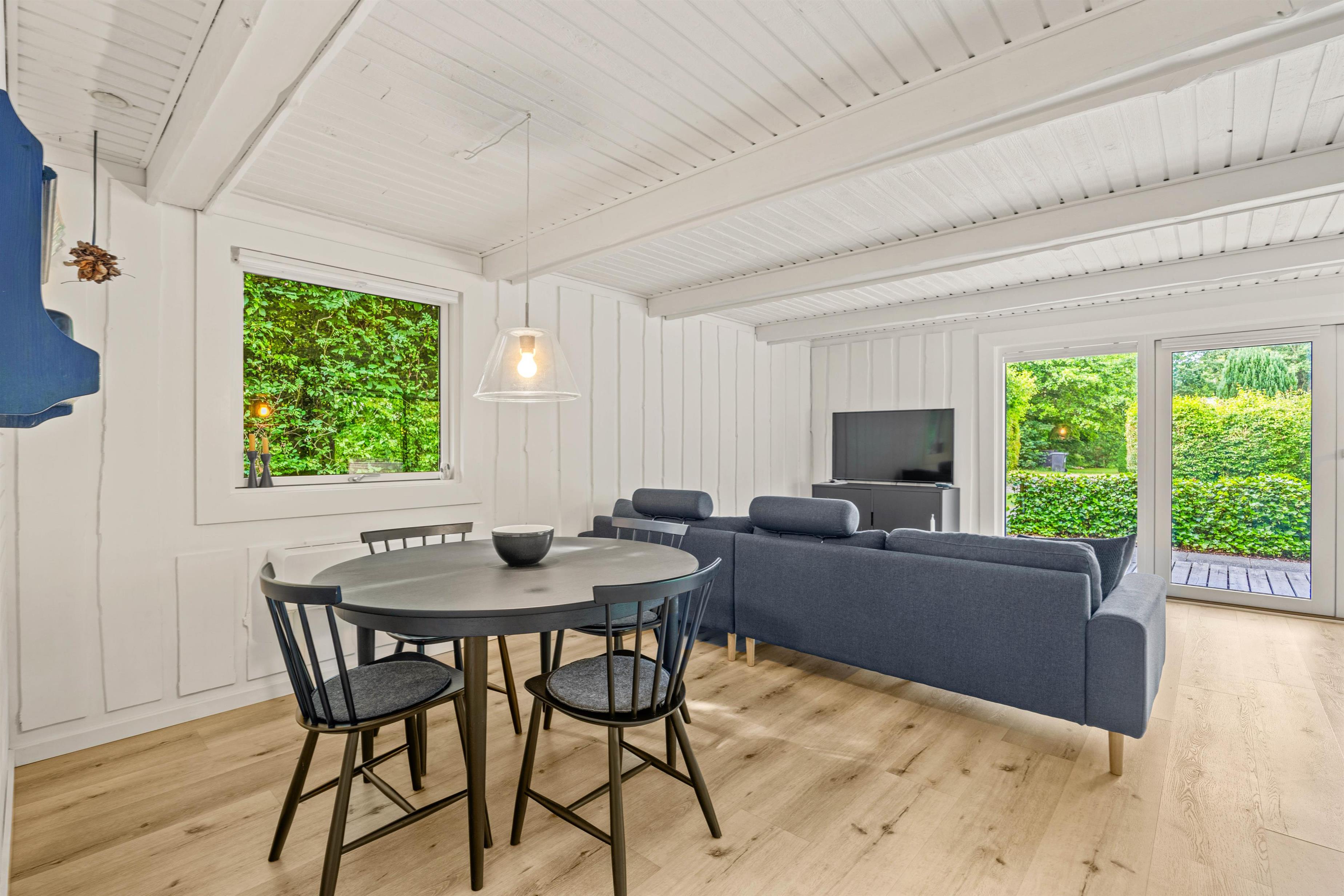 Indenfor mødes I af en indretning, der kombinerer funktionalitet med hjemlig hygge. Her kan op til 5 personer slå sig løs på sommerhusets i alt 54 kvadratmeter. Af de 2 soveværelser er det første udstyret med en dobbeltseng, der er 140 centimeter bred og det andet soveværelse har både en dobbeltseng på 140 centimeter og en praktisk køjeseng - perfekt til både børn og voksne. I køjerummet er der lille tv med tilslutning kun til DVD. Køkkenet er godt udstyret med en effektiv opvaskemaskine, der lader jer fokusere på afslapning i stedet for de huslige pligter. Med den moderne og energibesparende luft-til-luft varmepumpe er klimaet og temperaturen i sommerhuset altid behageligt, uanset årstid.
