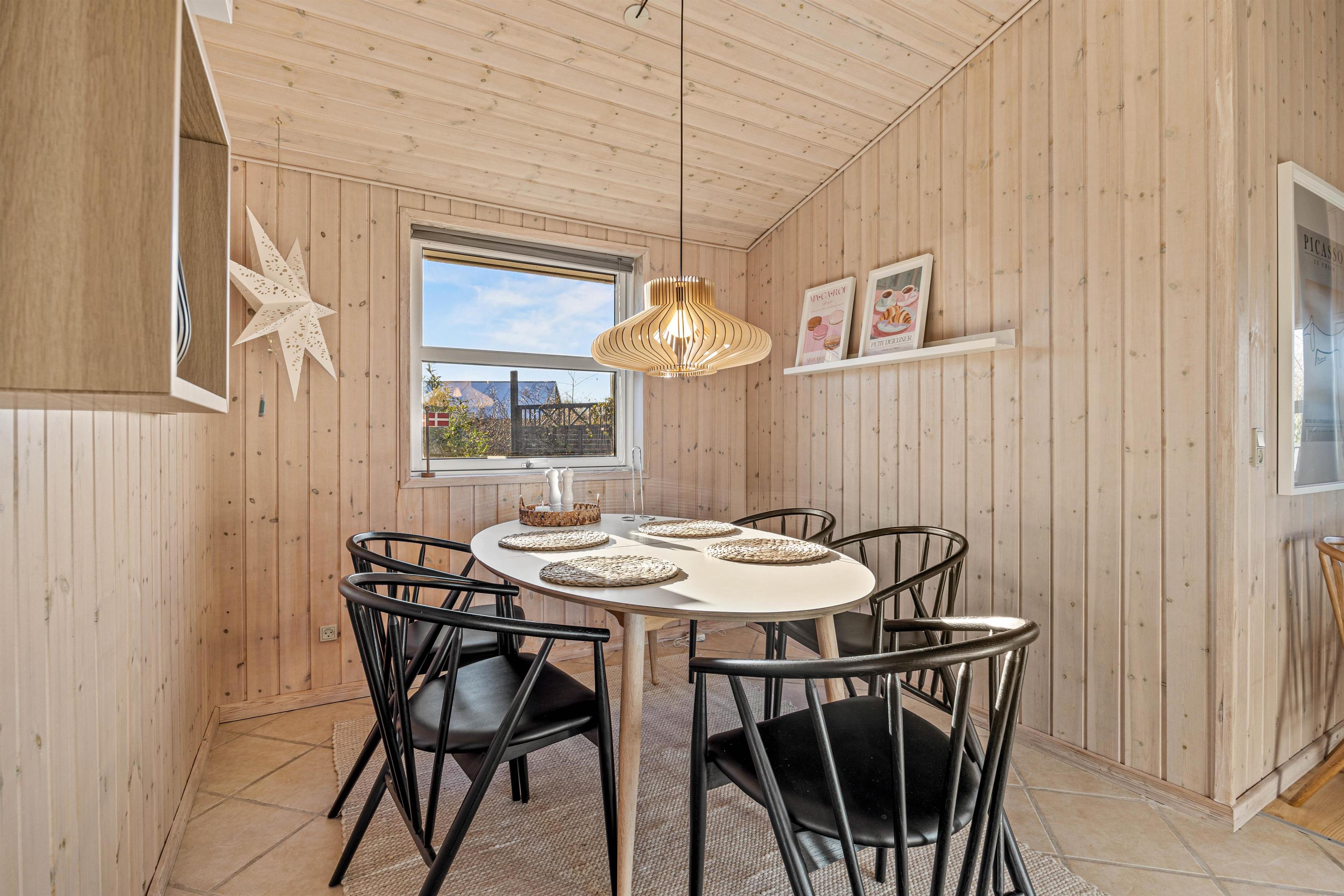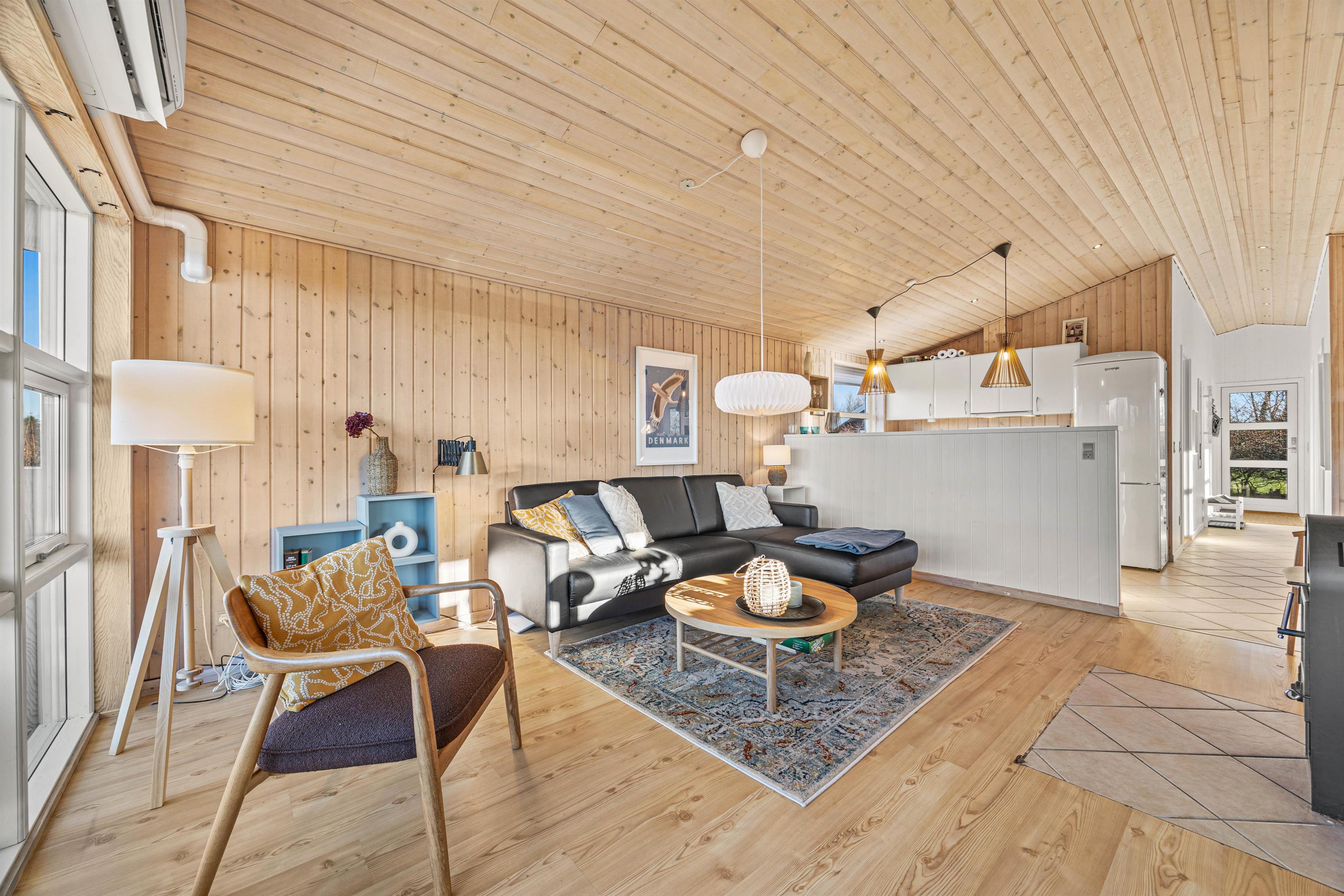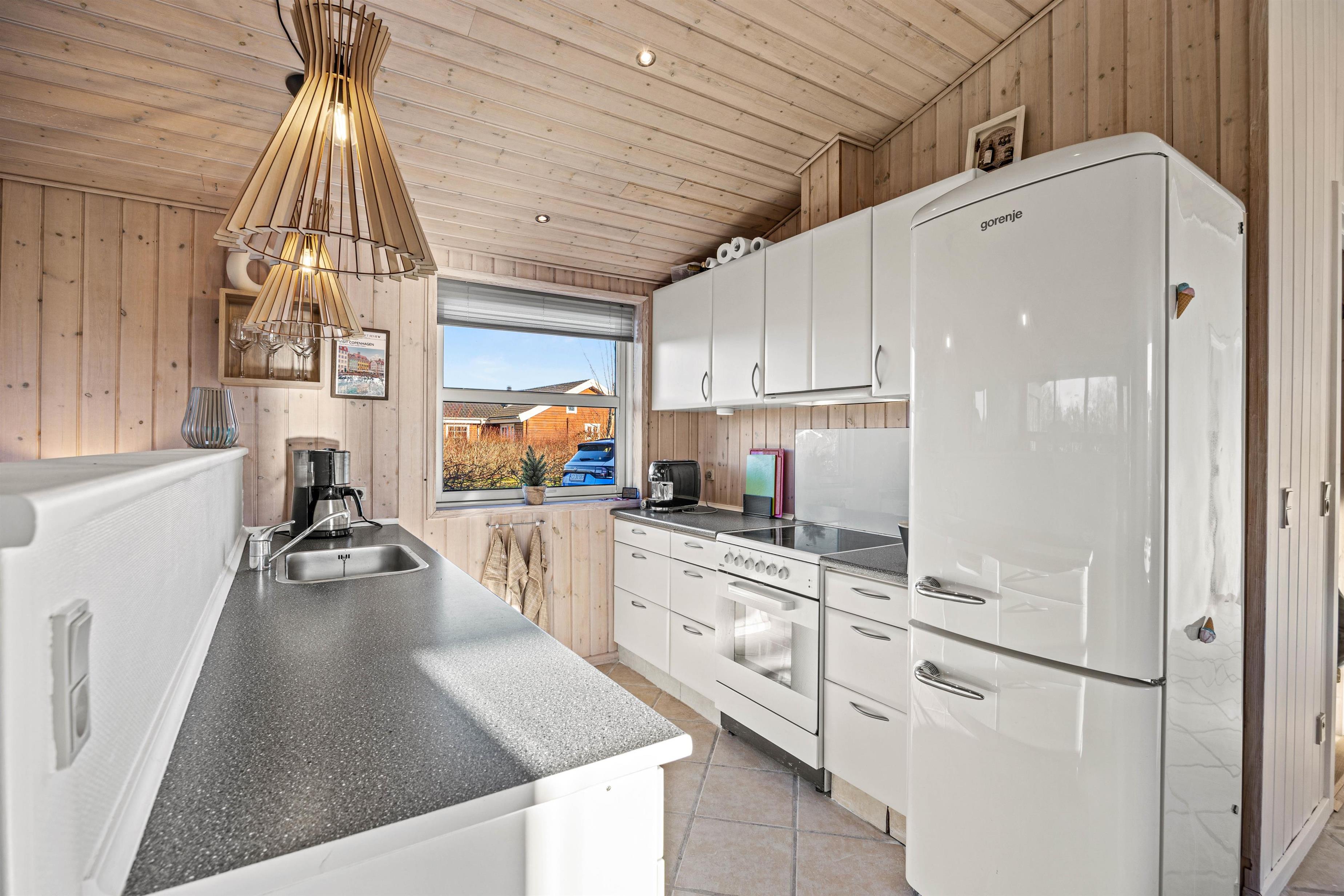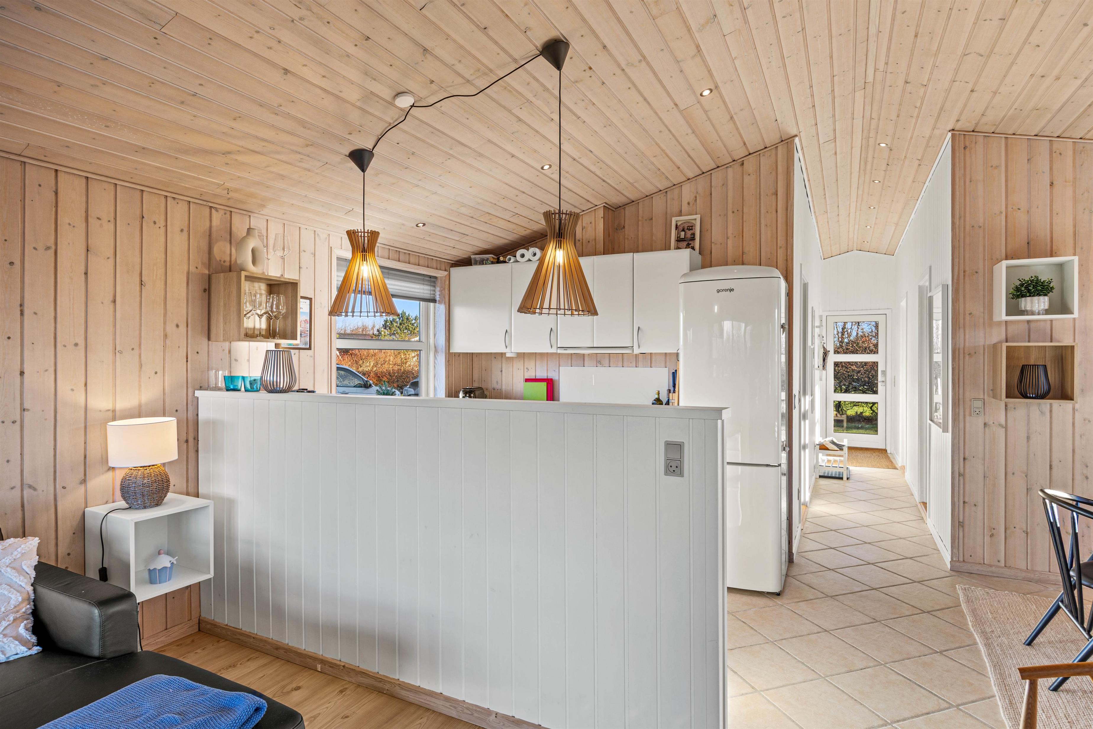 Indenfor finder I et smagfuldt indrettet feriehus med alle moderne faciliteter, der sikrer et behageligt ophold. Den åbne planløsning samler køkken, stue og spiseområde, og i stuen kan I slappe af på sofaen foran brændeovnen eller nyde underholdning på fladskærms-TV. En energibesparende varmepumpe sørger hele året for en behagelig temperatur, og både badeværelse og køkken har gulvvarme.