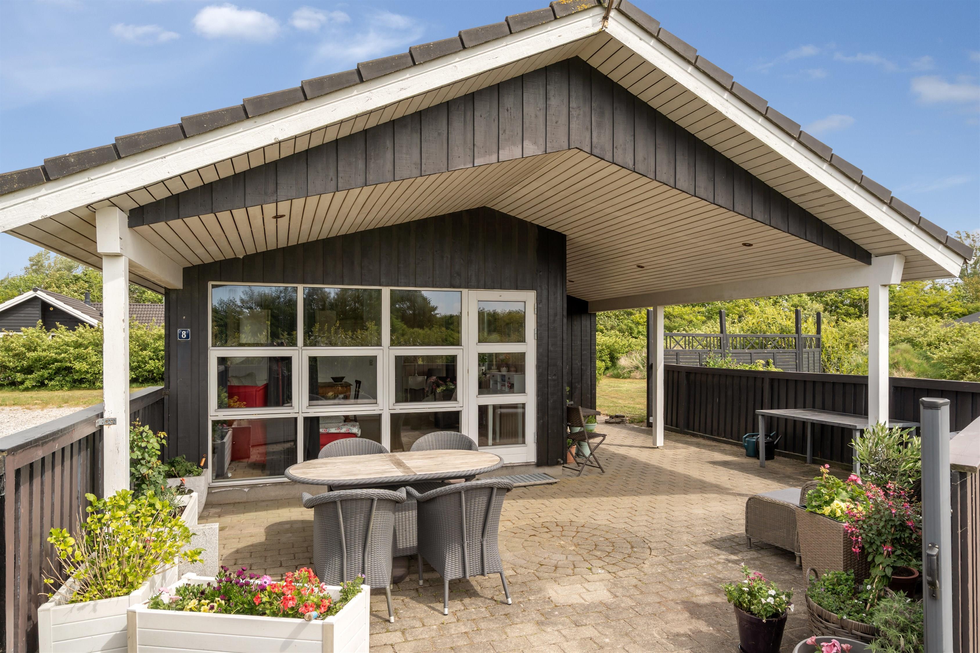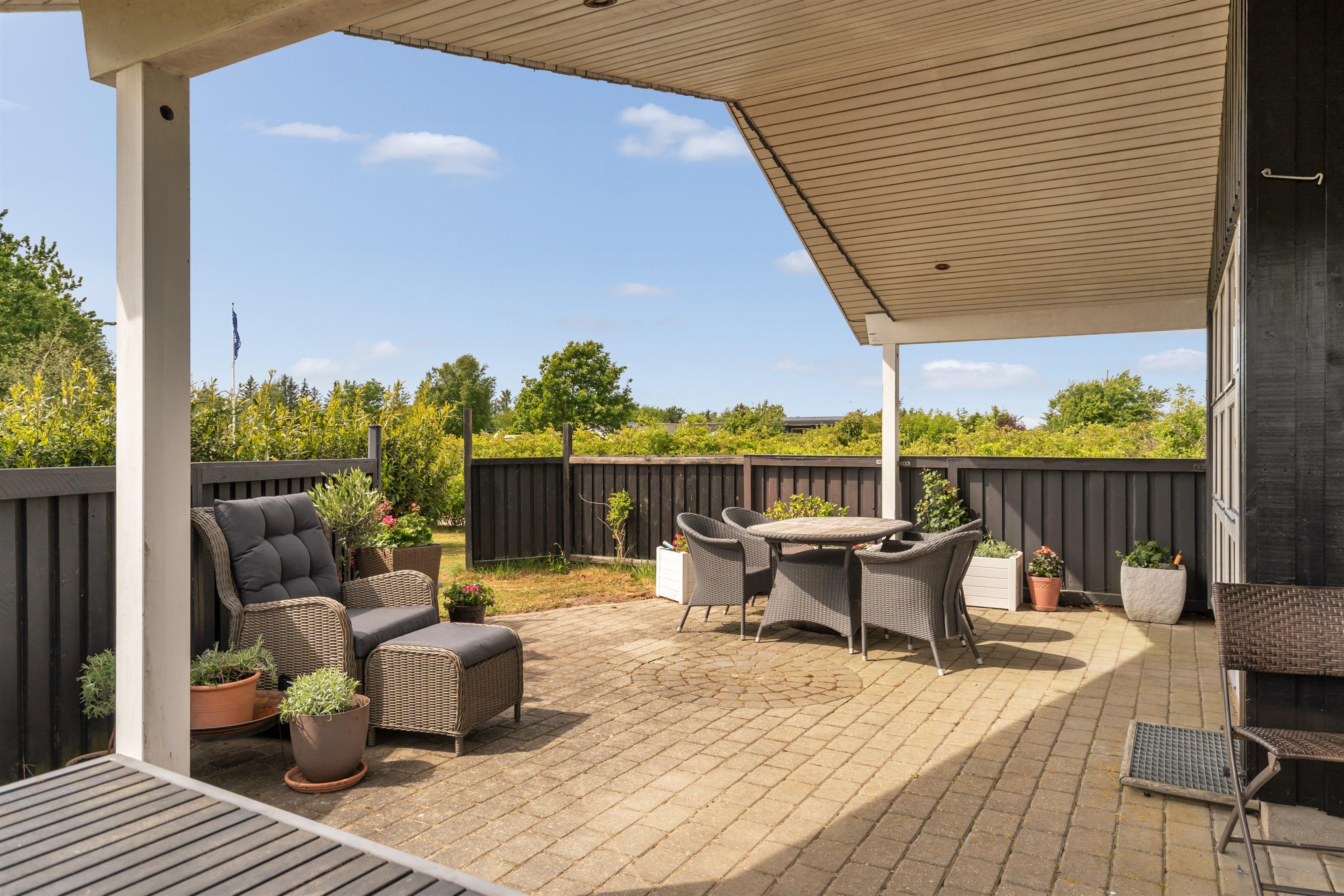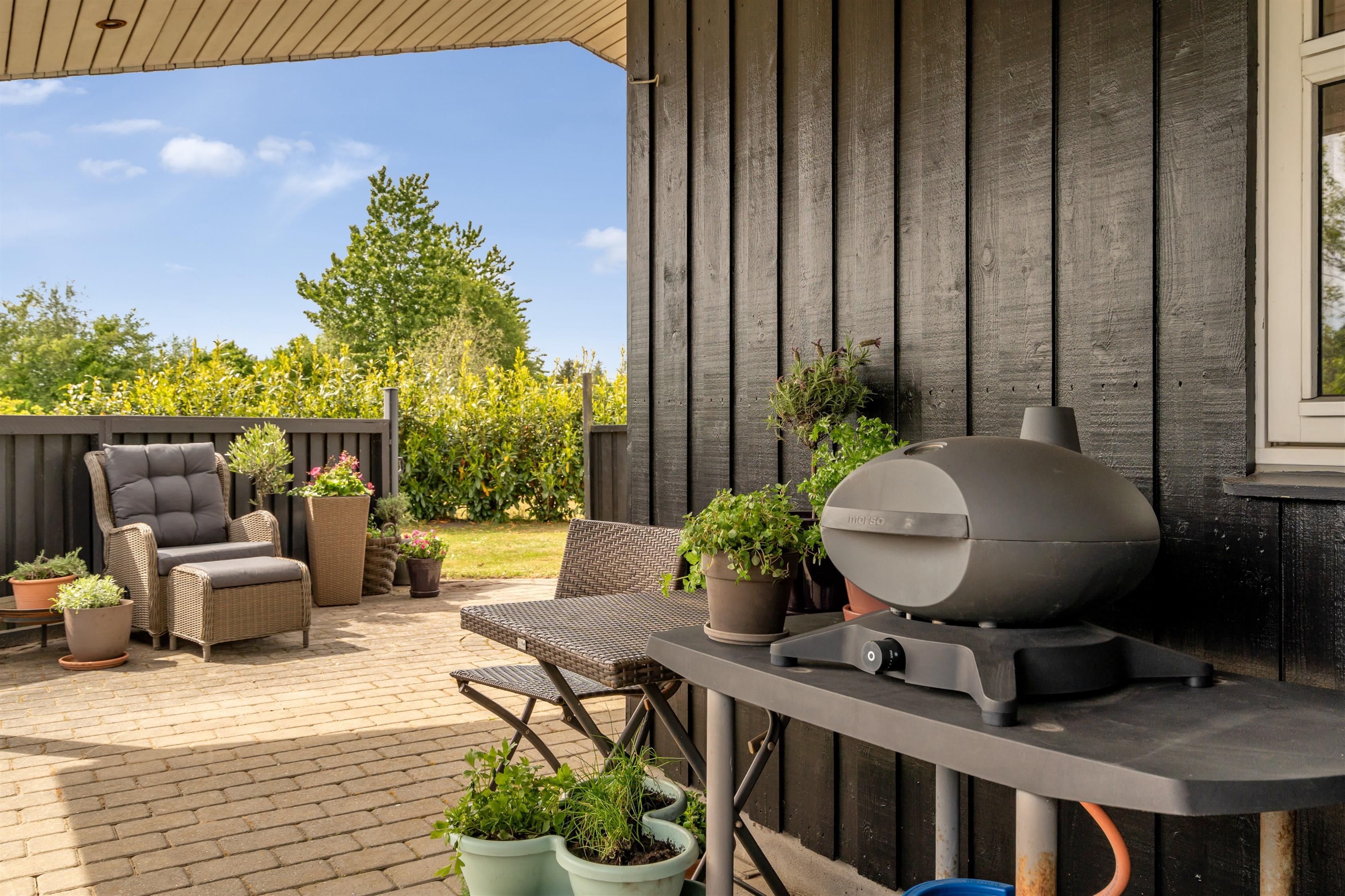 Den rummelige, delvist indhegnede have på 1256 m² giver masser af plads til afslapning, leg og solbadning. På den delvist overdækkede terrasse kan I nyde solen i liggestole eller sidde komfortabelt i havemøblerne. Til hyggelige grillaftener findes en gasgrill, og lige overfor sommerhuset ligger en legeplads, som skaber ekstra sjov for børnene. Haven er sikker for både børn og hunde, så alle kan boltre sig frit.