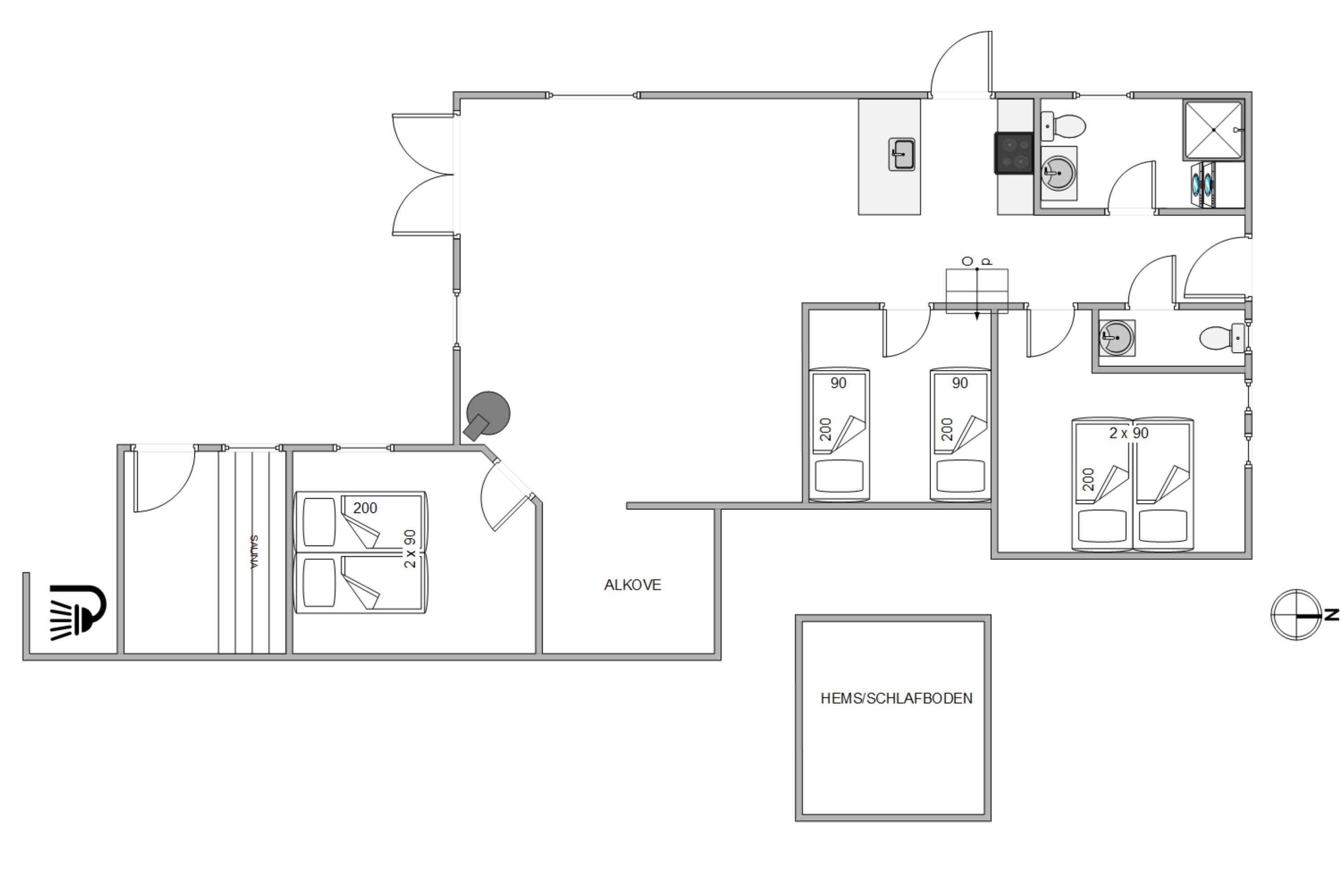 Ferieboligen byder på tre skønne soveværelser: to rum er indrettet med komfortable dobbeltsenge, mens det tredje værelse har to enkeltsenge, hvilket giver fleksible og komfortable sovepladser til alle gæster. Morgenrutinerne bliver nemme og behagelige med både et hovedbadeværelse og et gæstetoilet til rådighed, begge udstyret med gulvvarme for en varm og behagelig start på dagen uden kolde fødder.