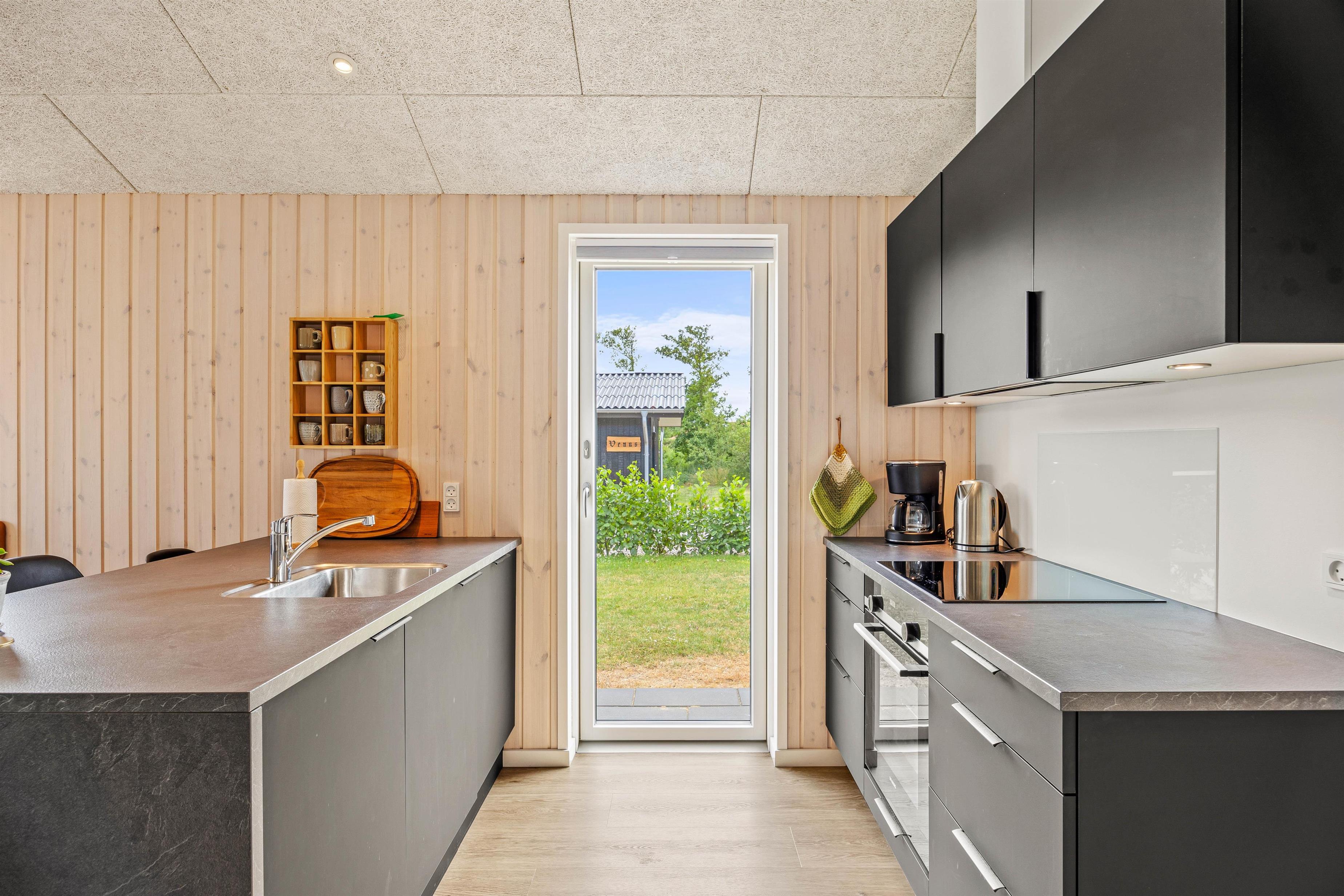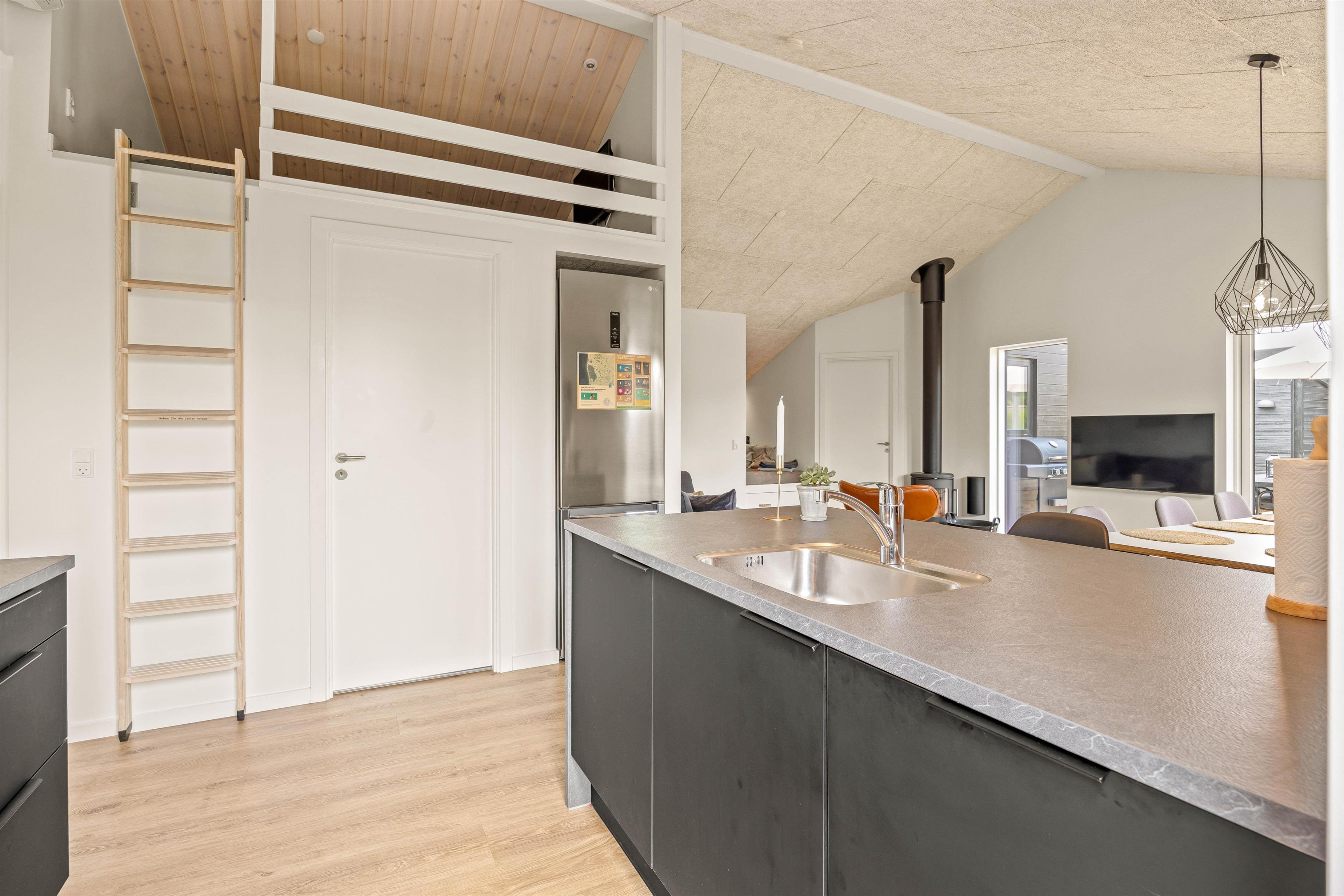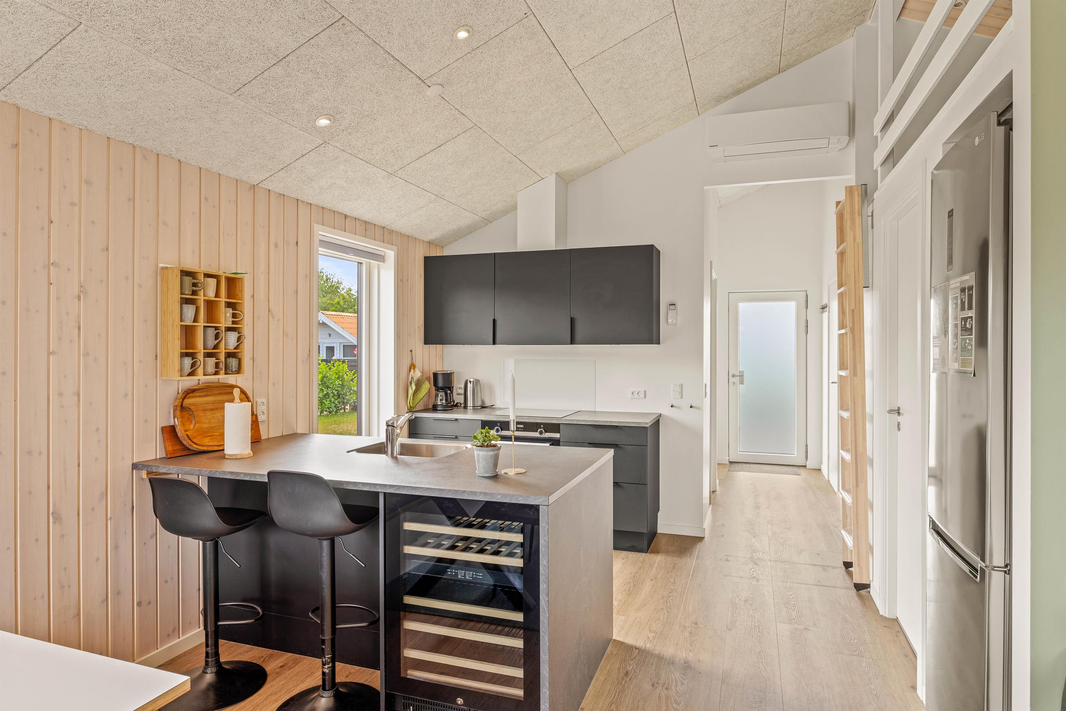 Indgangen til ferieboligen åbner op til en lys og indbydende indretning, som straks får jer til at føle jer hjemme. Med rummets lyse og moderne design skabes en elegant og bekvem atmosfære, der passer perfekt til jeres ferie. I hjertet af sommerhuset ligger det åbne alrum, hvor køkkenet, spiseområdet og stuen forenes, så I kan tilbringe hyggelige stunder sammen, uanset om det er til madlavning, spil eller filmaftener.