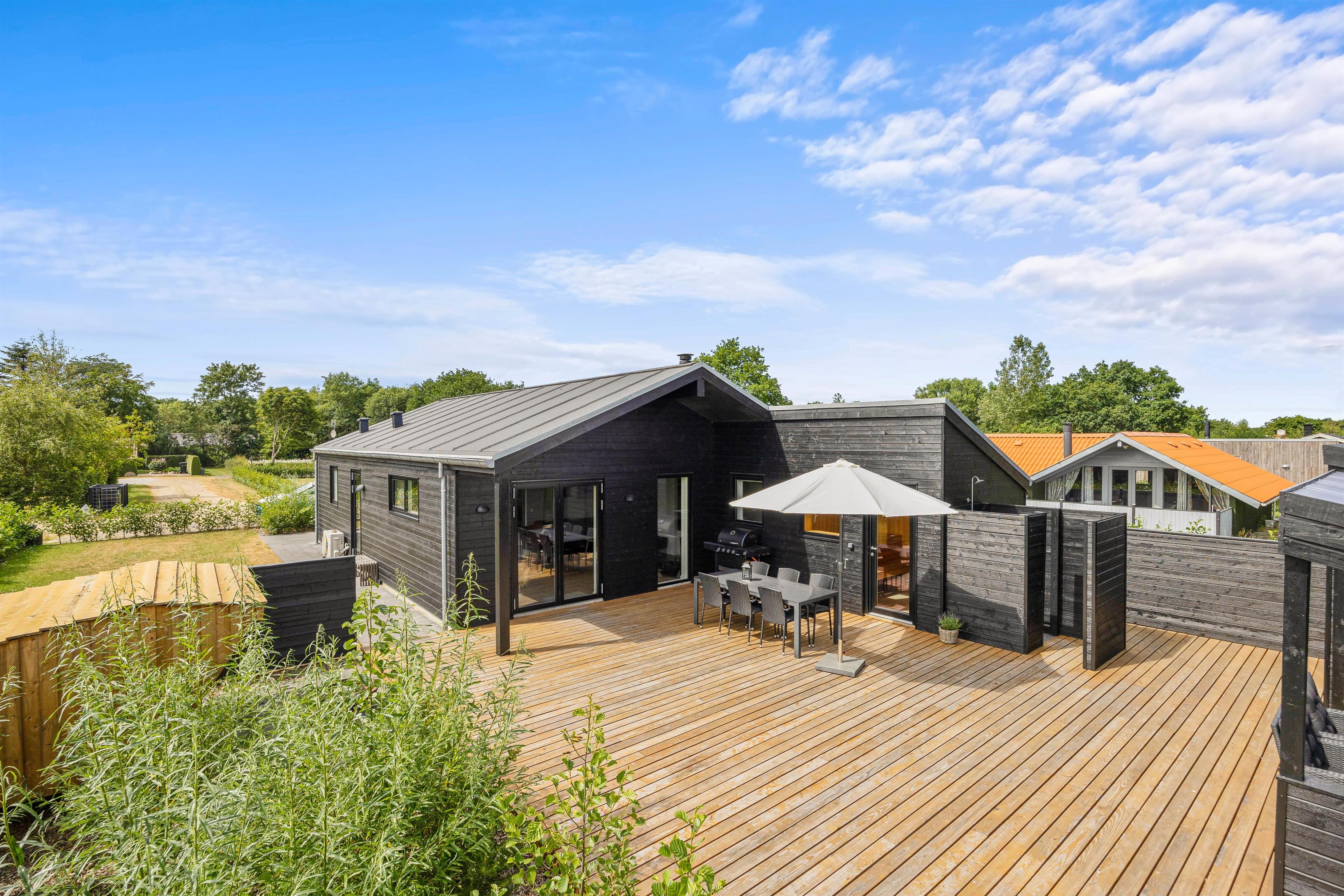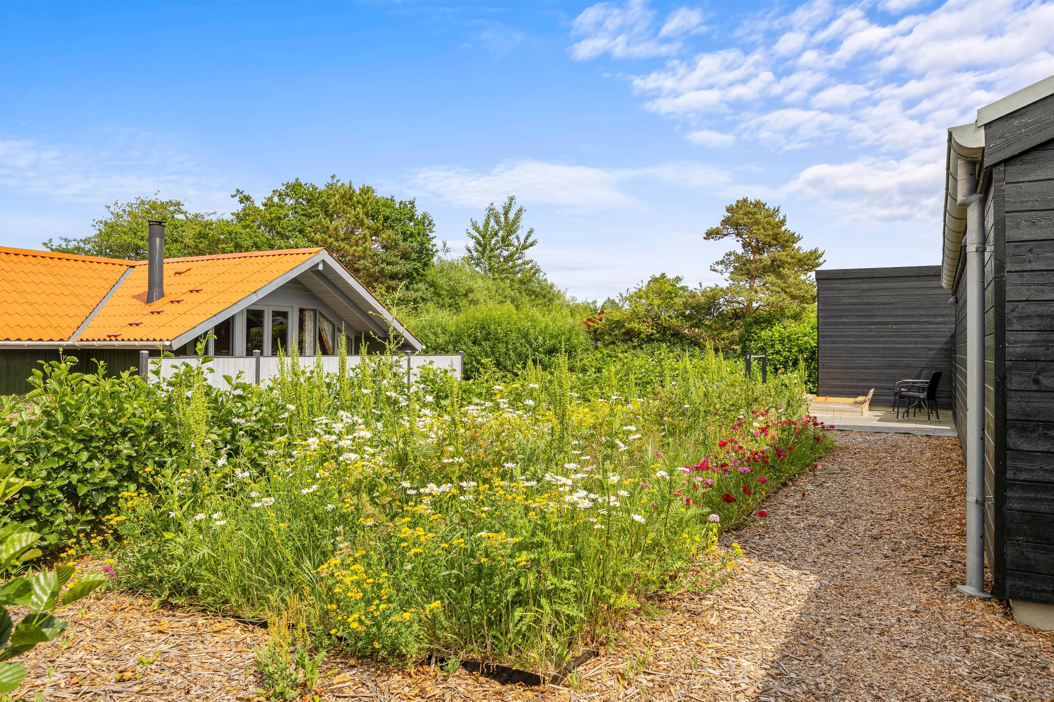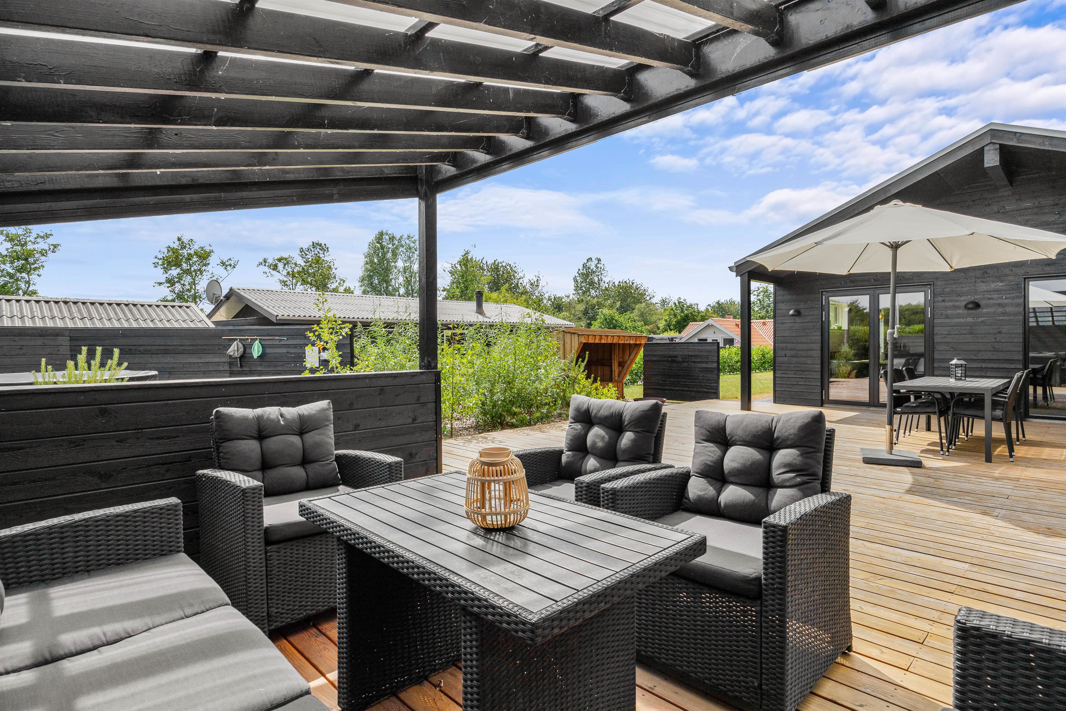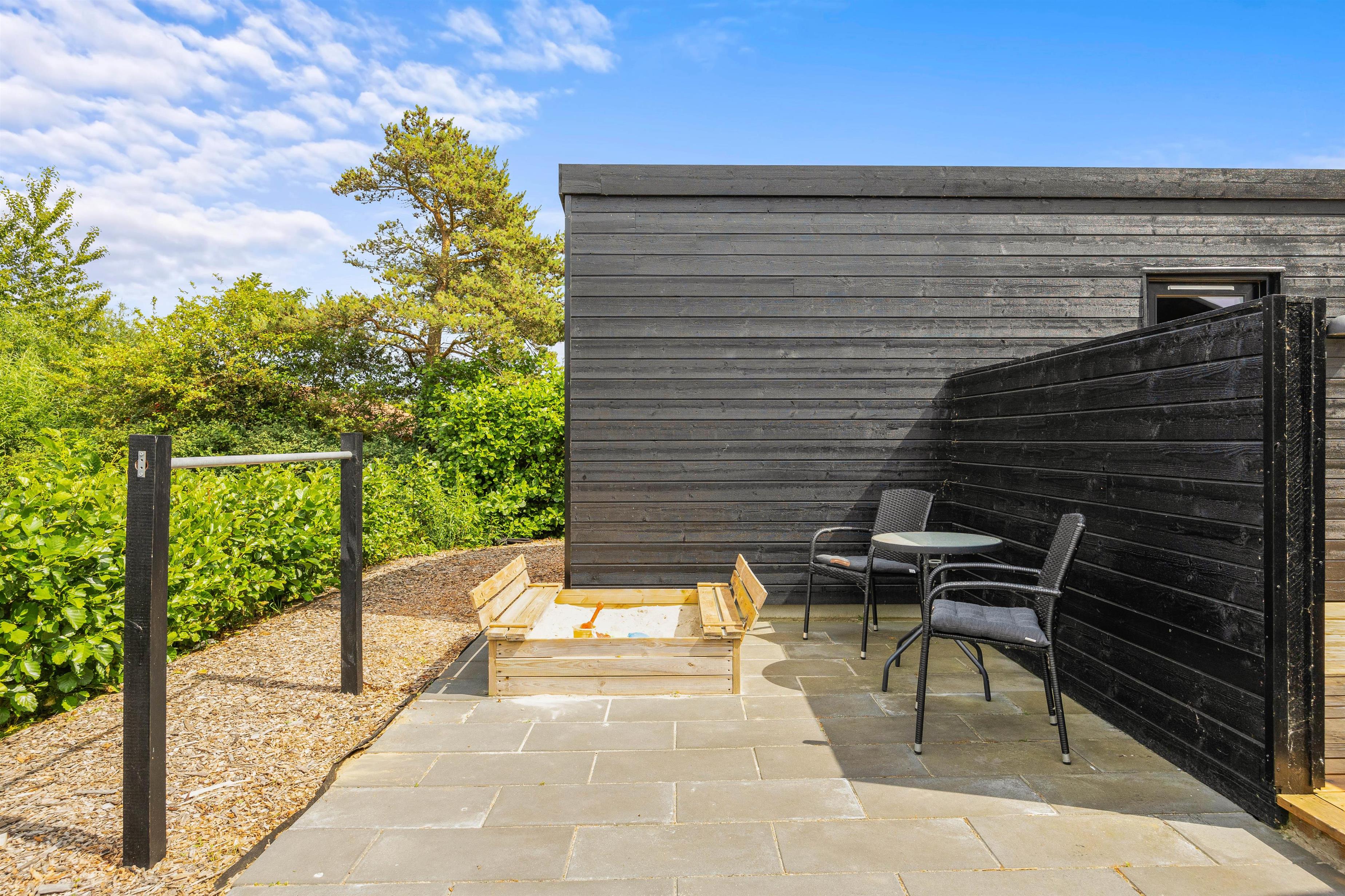 Når I bevæger jer ud på de skønne udendørs områder, vil I blive mødt af en imponerende stor terrasse, der er som skabt til at nyde feriens dejlige vejr. Terrassen kombinerer åben plads med en delvist overdækket og afskærmet sektion, hvilket giver jer mulighed for at vælge det helt rigtige spot, uanset solens position. Her kan I slå jer ned i de komfortable havemøbler og liggestole, mens børnene leger trygt i sandkassen tæt ved.