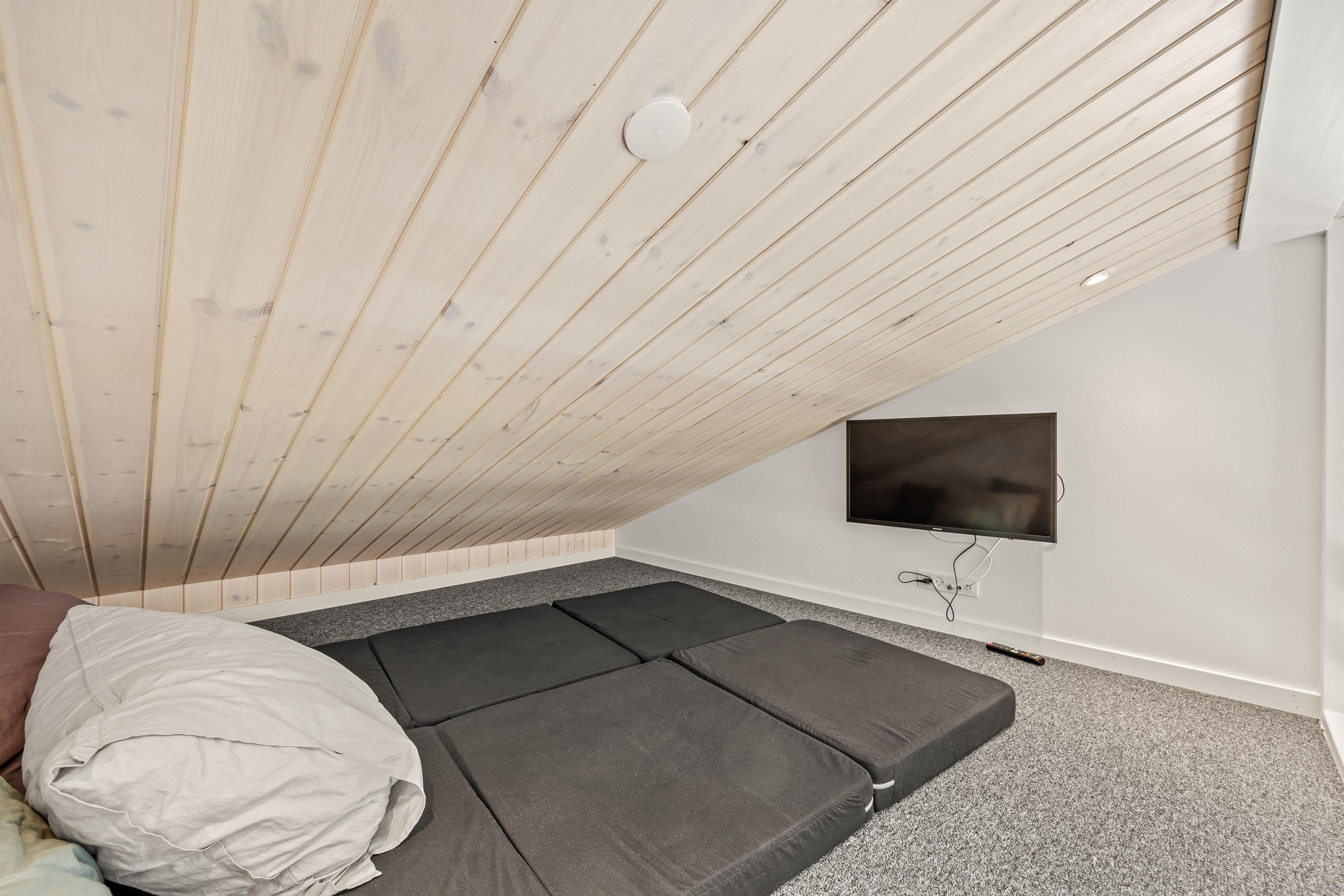 En brændeovn tilfører en hyggelig varme, mens den energivenlige varmepumpe sikrer, at komforten er i top året rundt. Fra alrummet er der adgang til en charmerende hems, som børnene vil finde spændende og sjov.