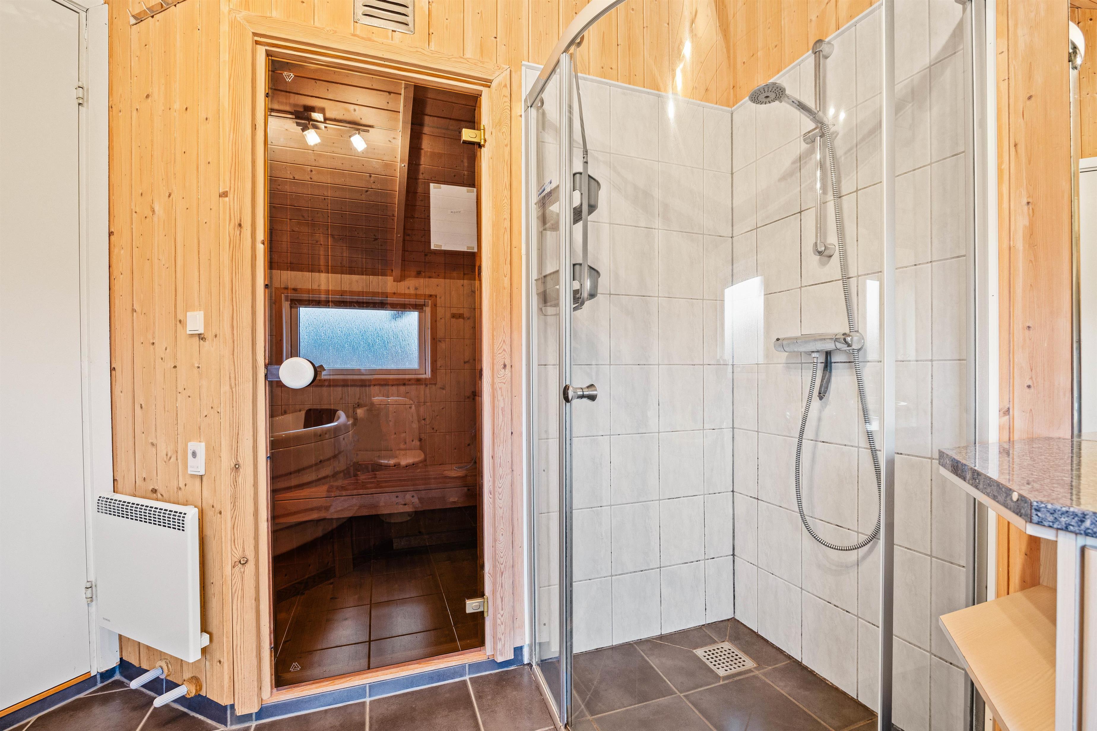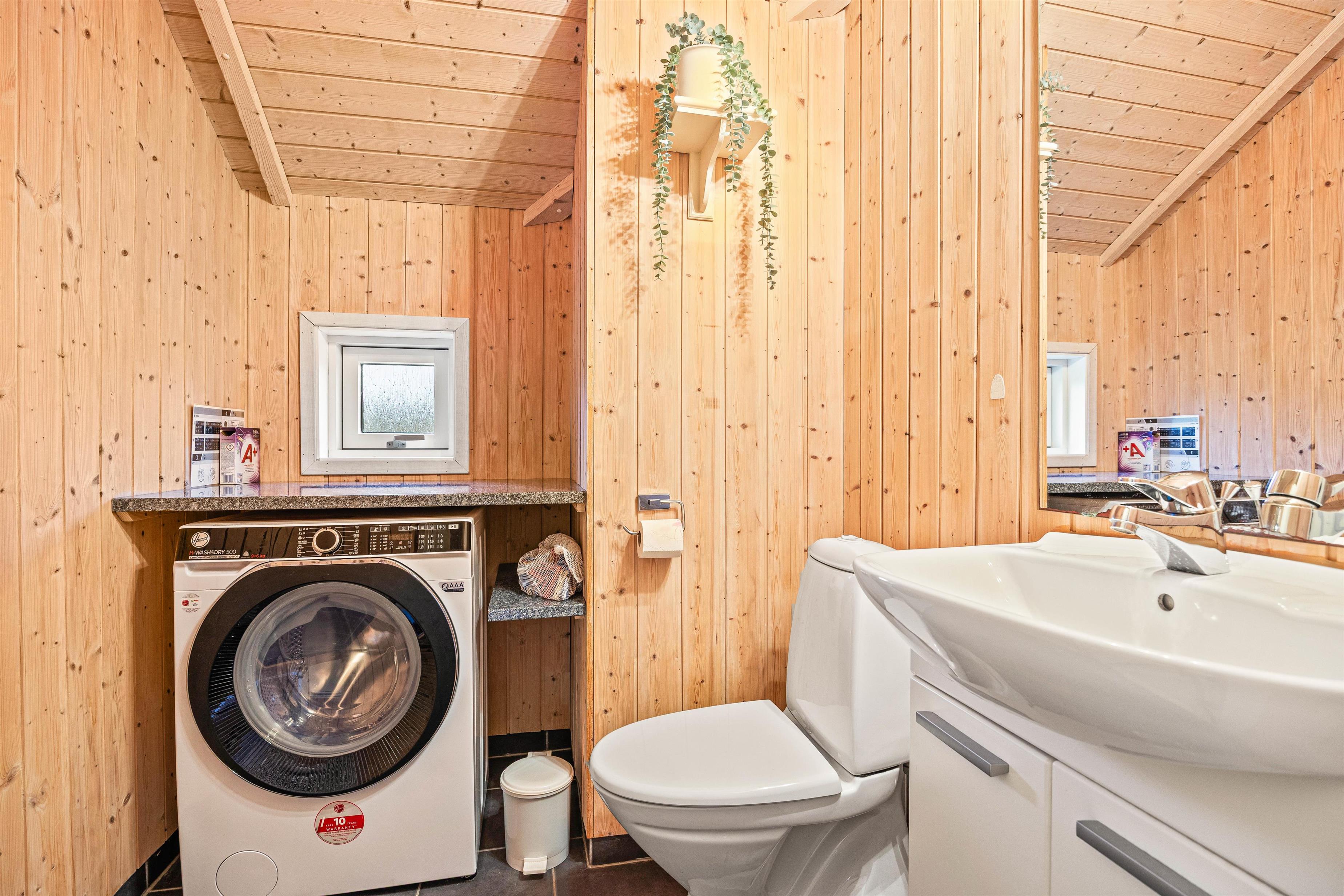 Det store badeværelse og gæstetoilettet har begge gulvvarme, hvilket giver ekstra komfort. Derudover står vaskemaskine og tørretumbler til rådighed – særligt praktisk, når I rejser med små børn. I det store badeværelse finder I jeres eget wellnessområde med sauna og tømmespa. Slap af i det varme vand, eller lad hverdagens stress forsvinde under et saunabesøg.