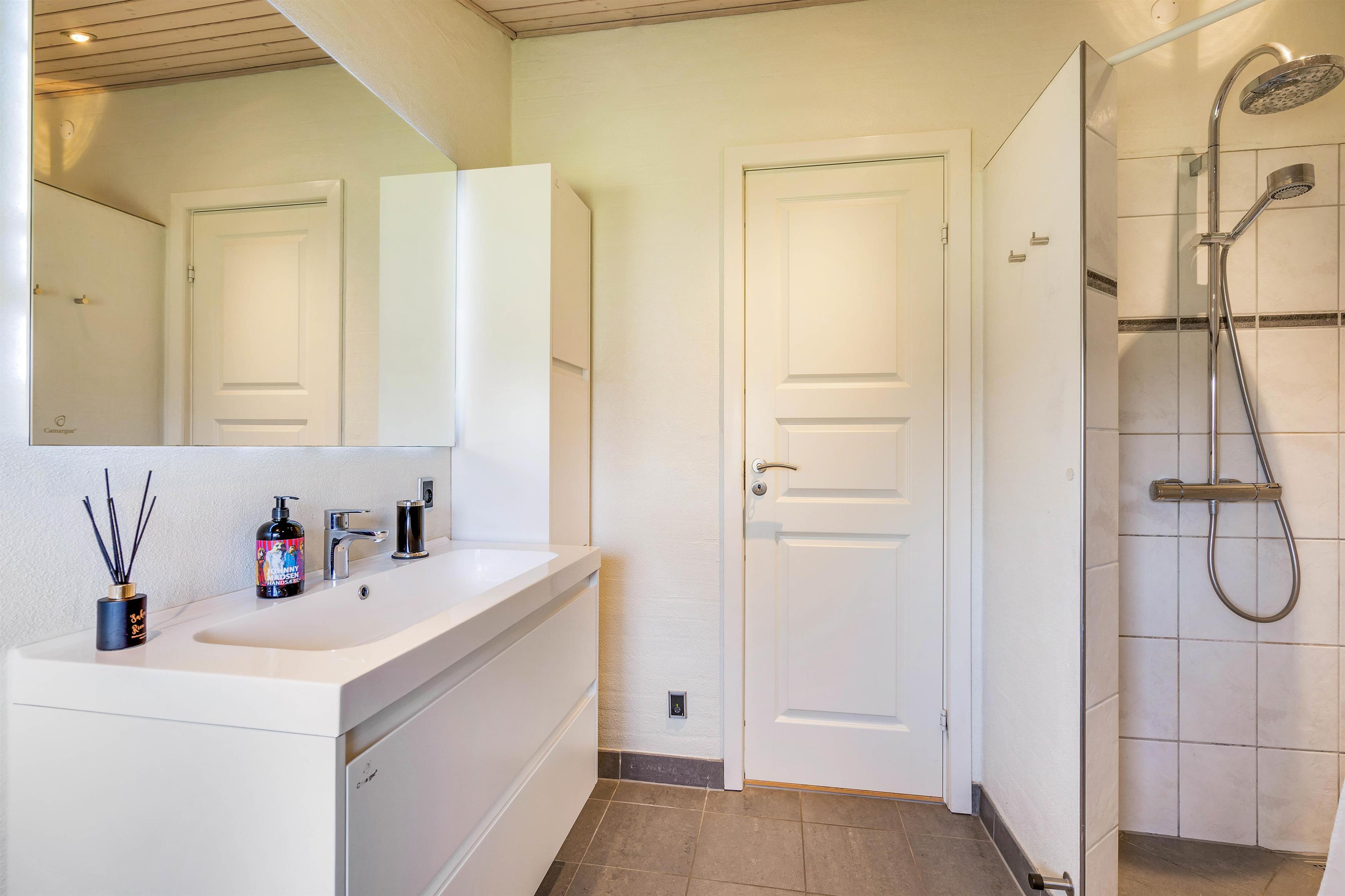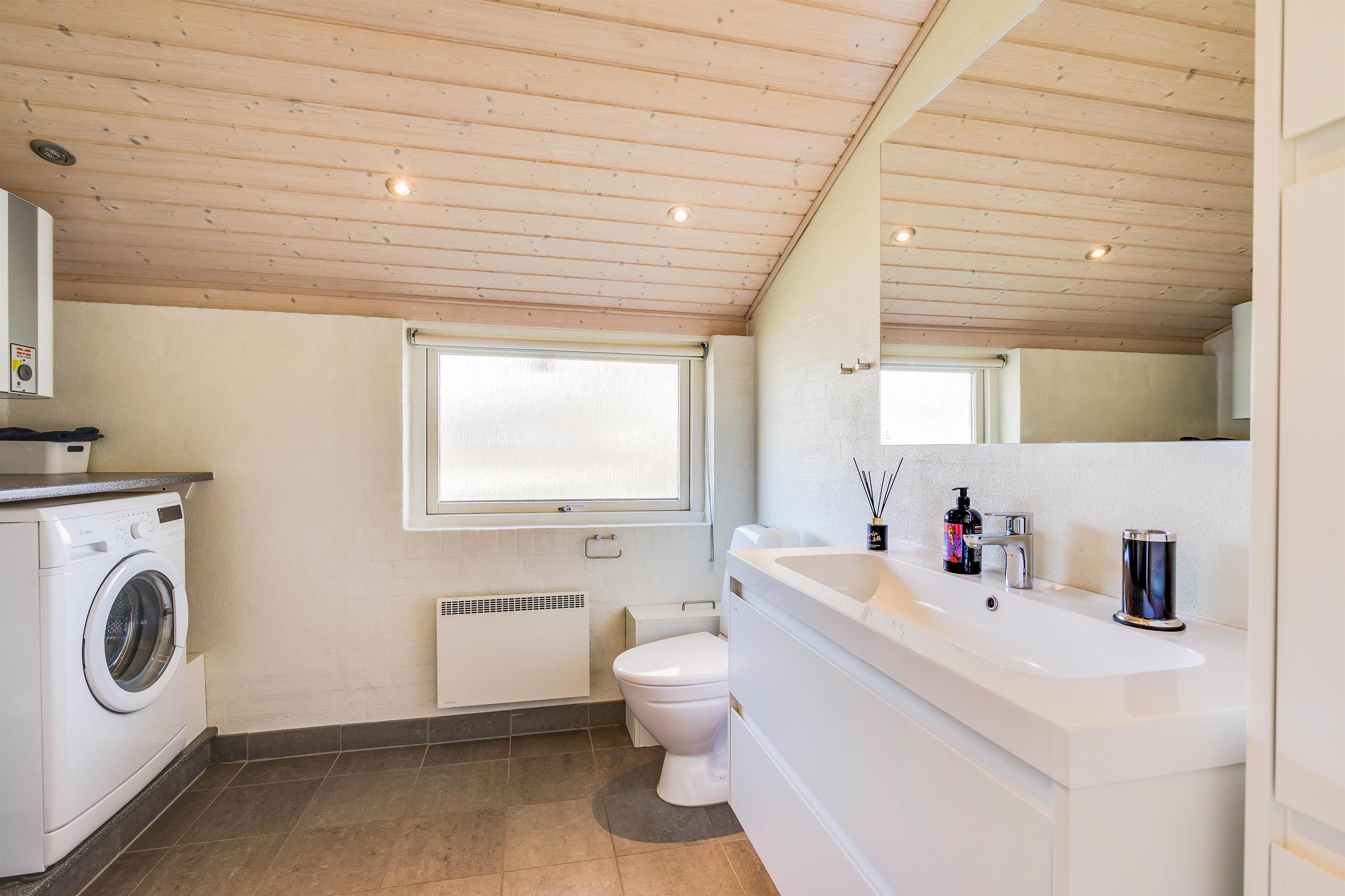 Badeværelset er indrettet med moderne bekvemmeligheder og gulvvarme, der sikrer en behagelig start på dagen. En integreret vaskemaskine gør det nemt at håndtere tøjvask, mens opvaskemaskinen i køkkenet tager sig af opvasken, så I kan bruge tiden på at nyde hinandens selskab.