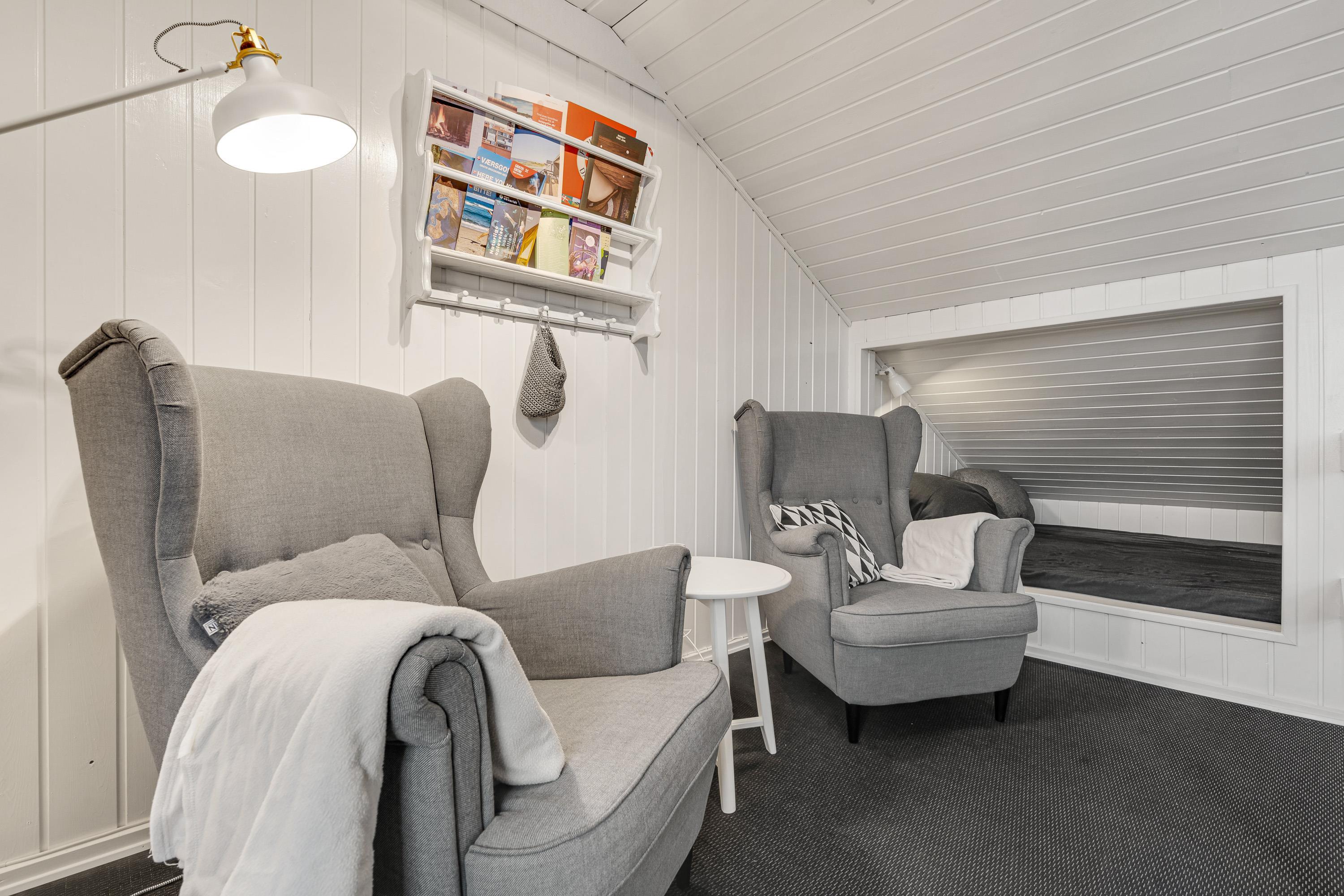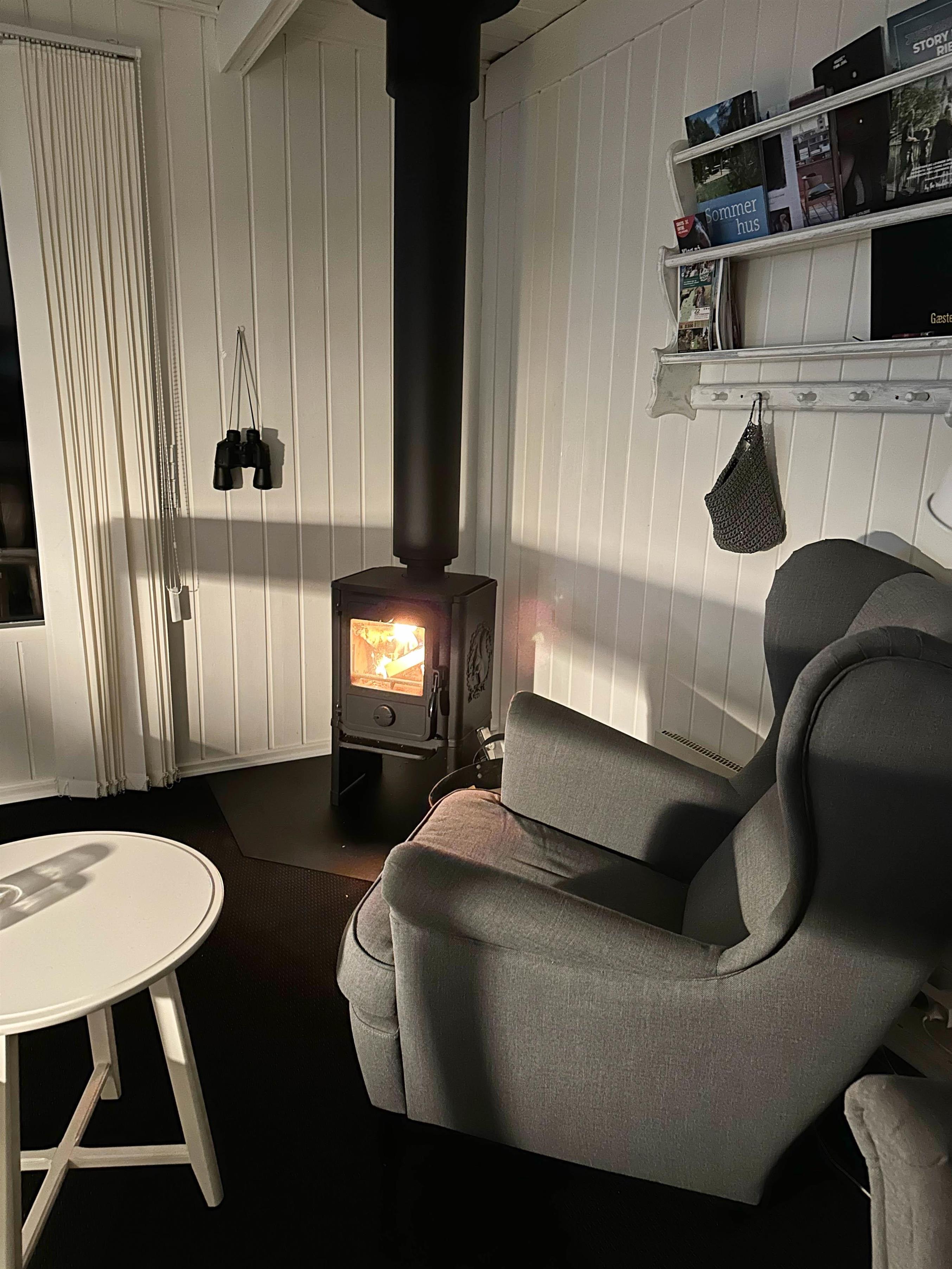 Feriehuset kan nemt og hurtigt opvarmes med den energibesparende varmepumpe. Bevæger I jer op ad trappen finder I den hyggeligste stue. Her er det oplagt at tage et kig ud over altanen, som har en imponerende panoramaudsigt ud over fjorden. Det er også dejlige sofa møbler som kan smide sig i efter en lang dag med masser af oplevelser. Der er endda en alkove, som man kan trække sig væk i og nyde den lille hyggekrog.
