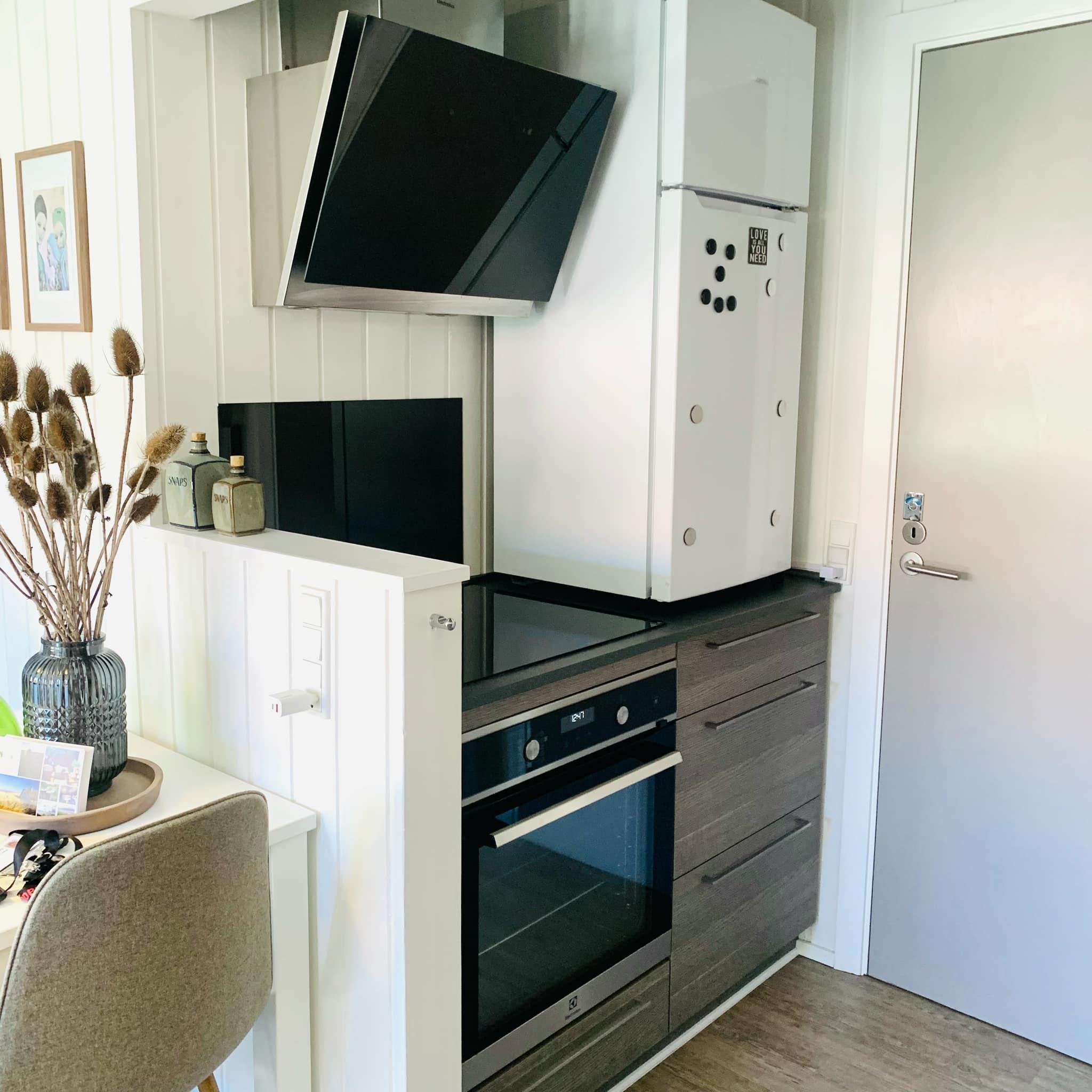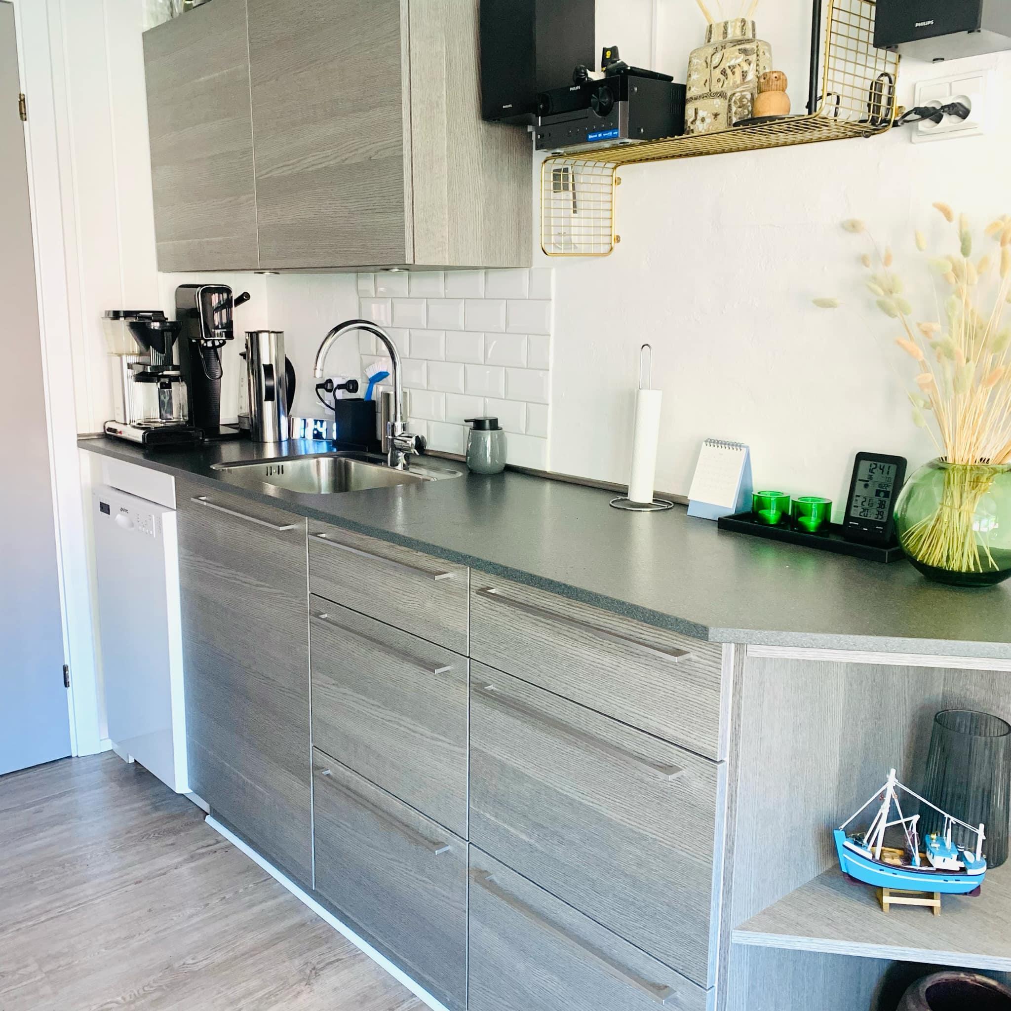 Et fuldt udstyret køkken med bl.a. køleskab og opvaskemaskine