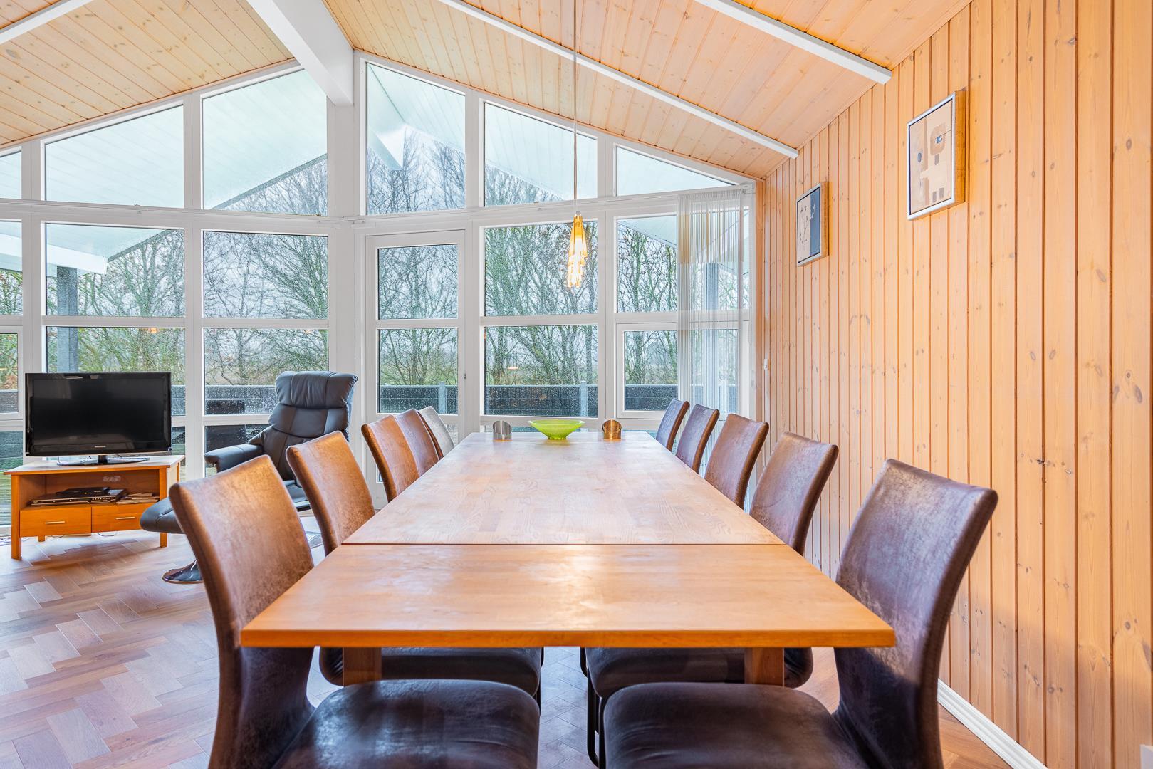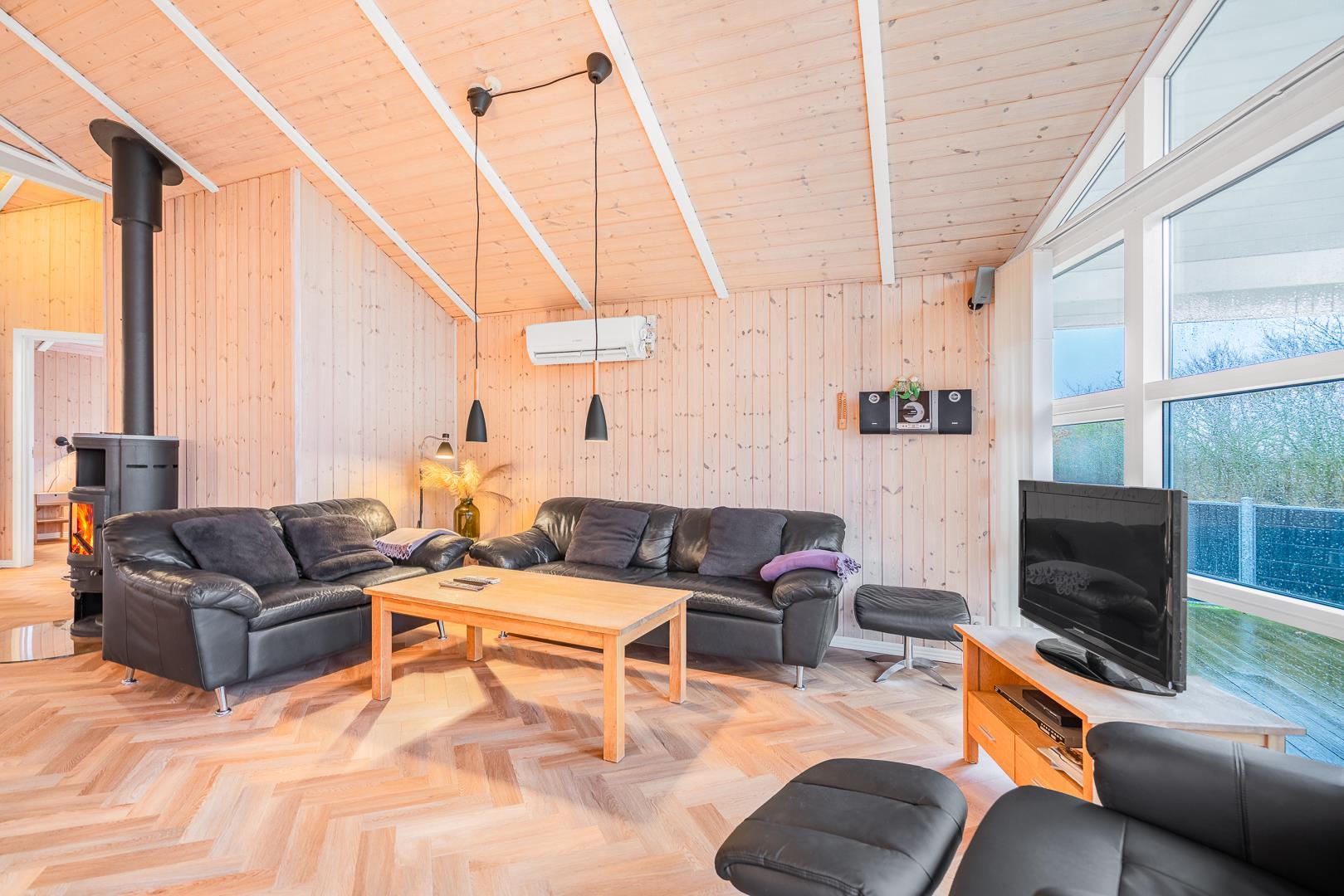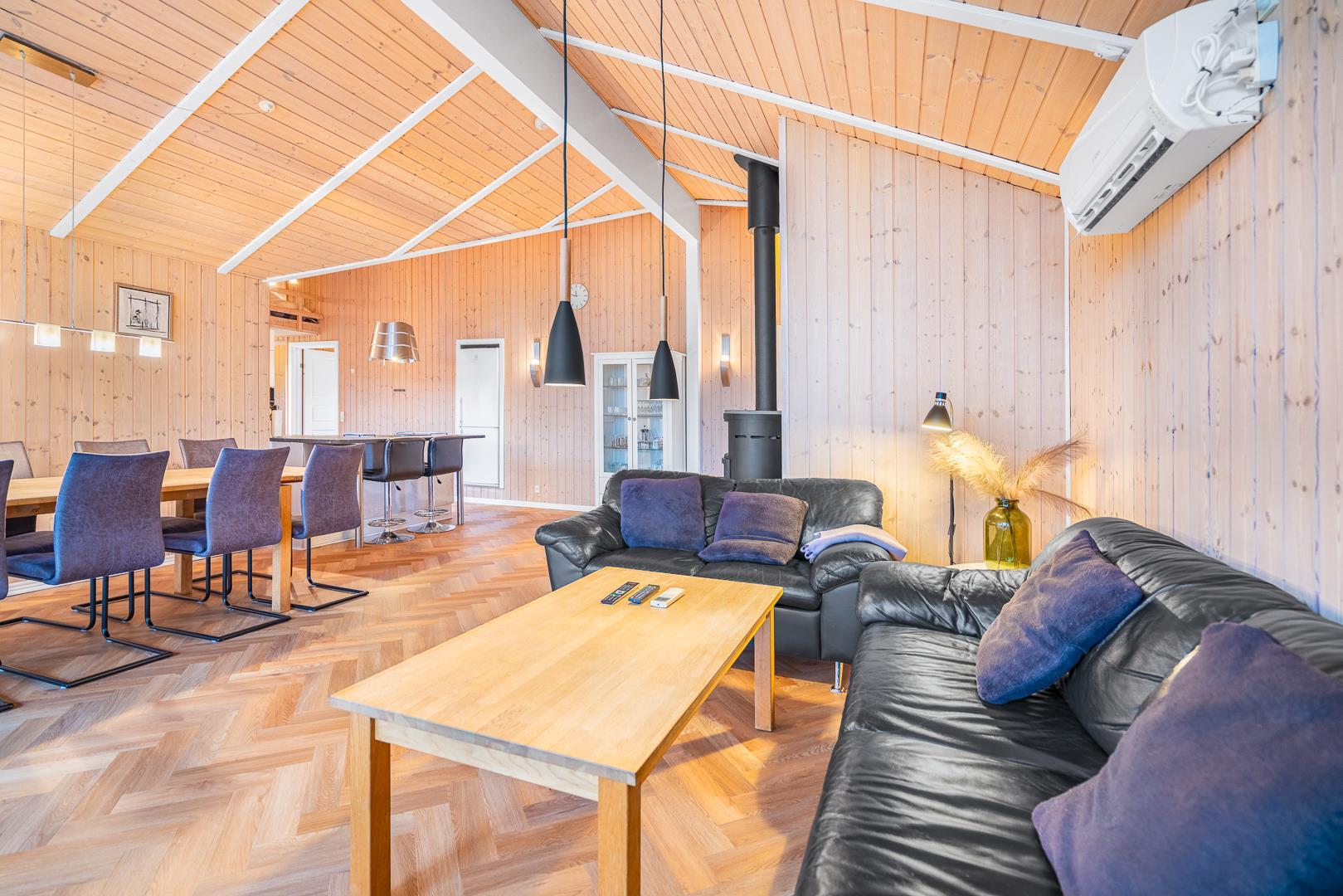 På Sydmarken 43 bliver I mødt af en varm og indbydende atmosfære, hvor feriestemningen hurtigt indfinder sig. Sommerhusets hjerte er den lyse opholds- og spisestue med store vinduespartier, der giver et flot lysindfald og udsigt til naturen. Her kan familien samles til madlavning, spil eller hygge ved brændeovnen, som sørger for varme og en hyggelig atmosfære på kølige dage.