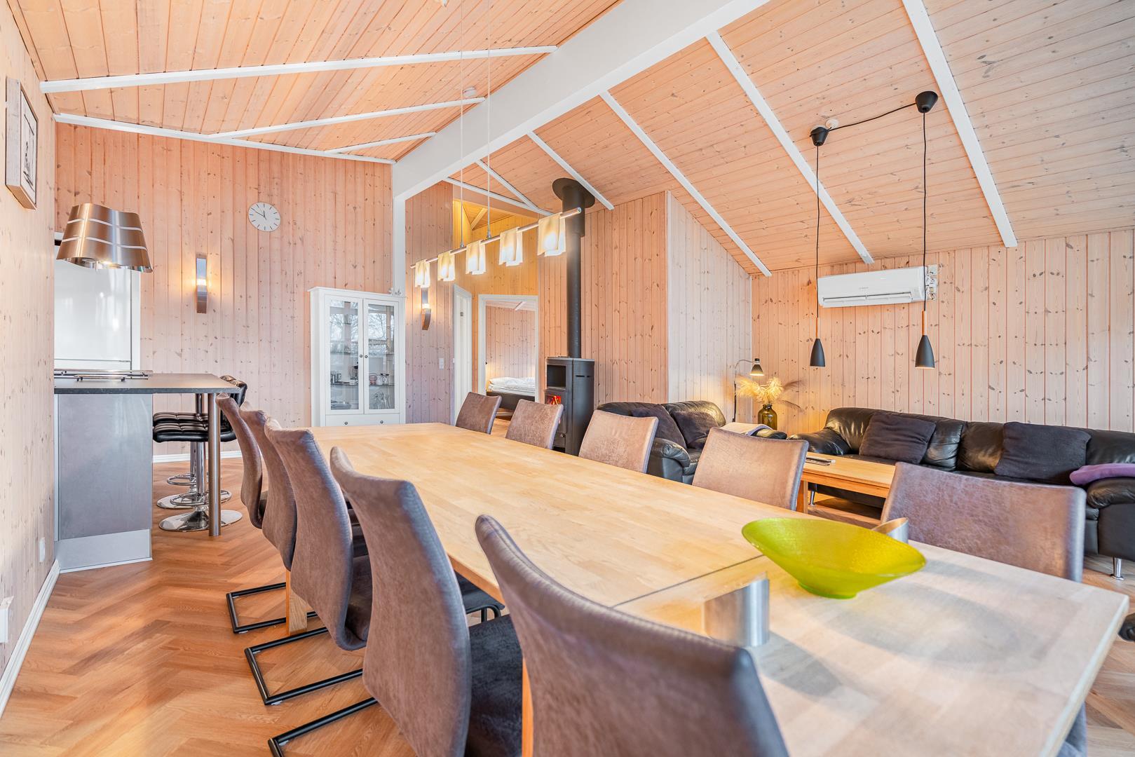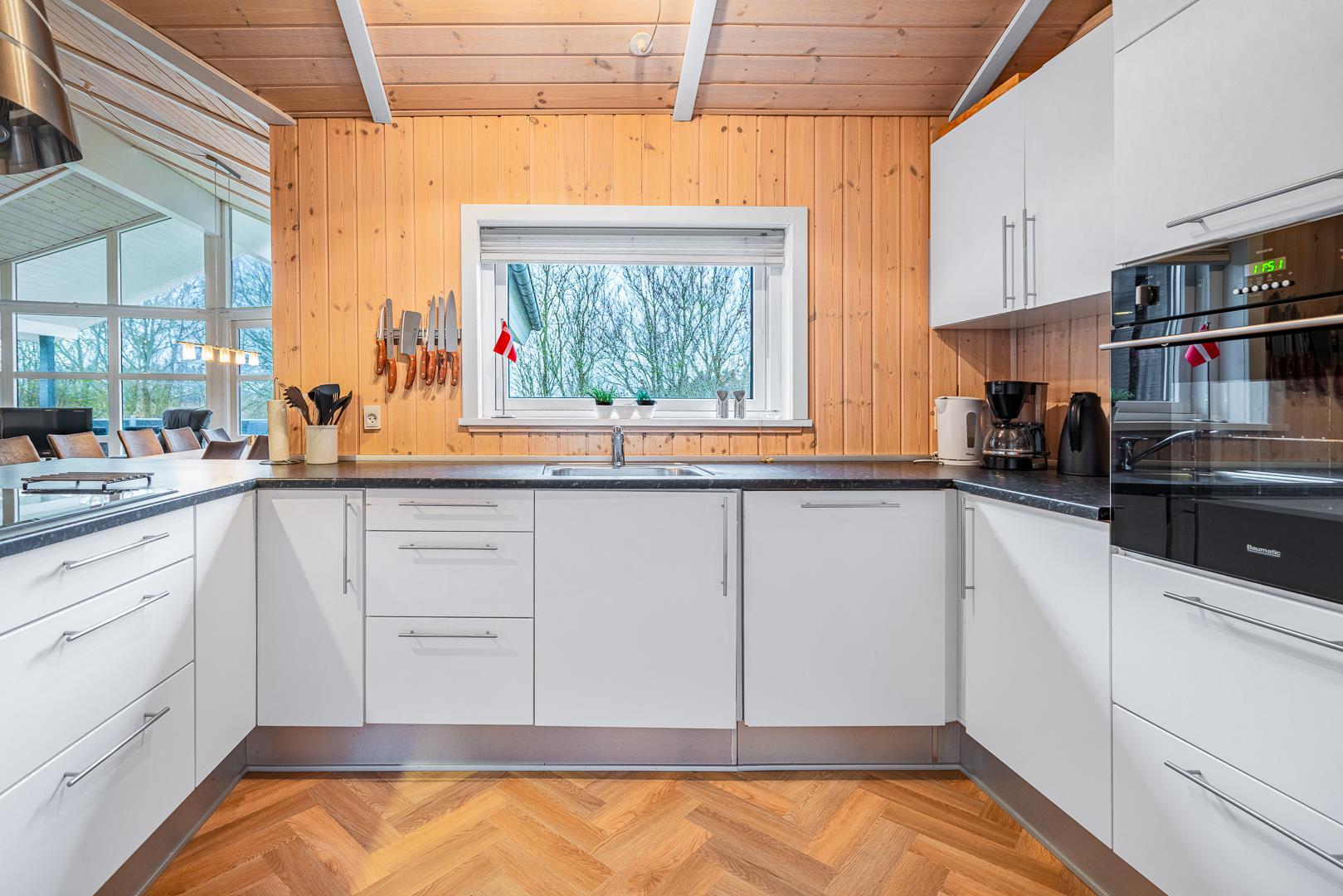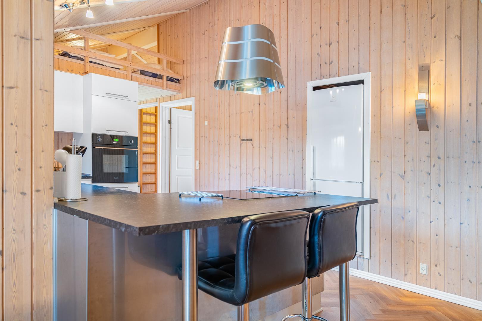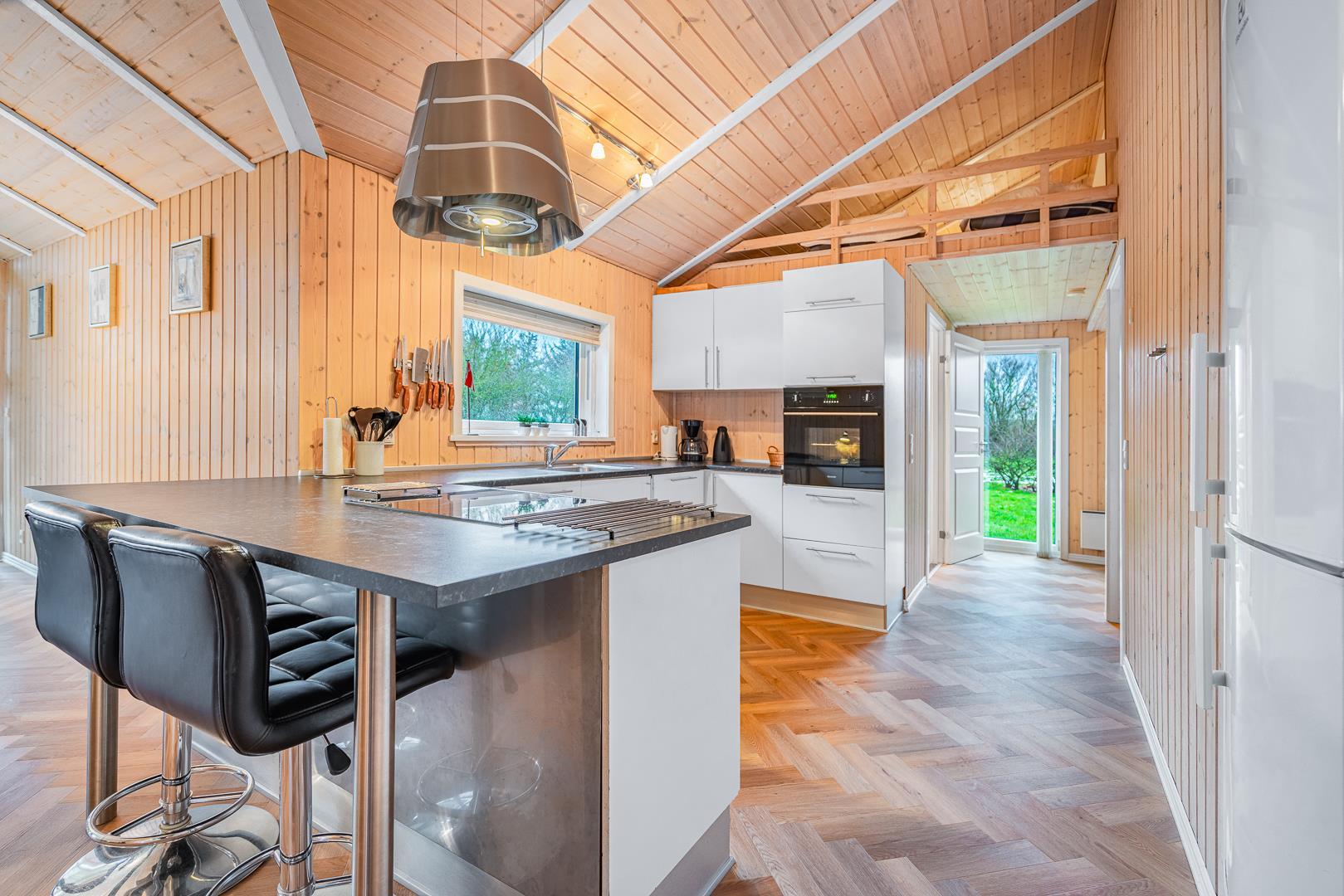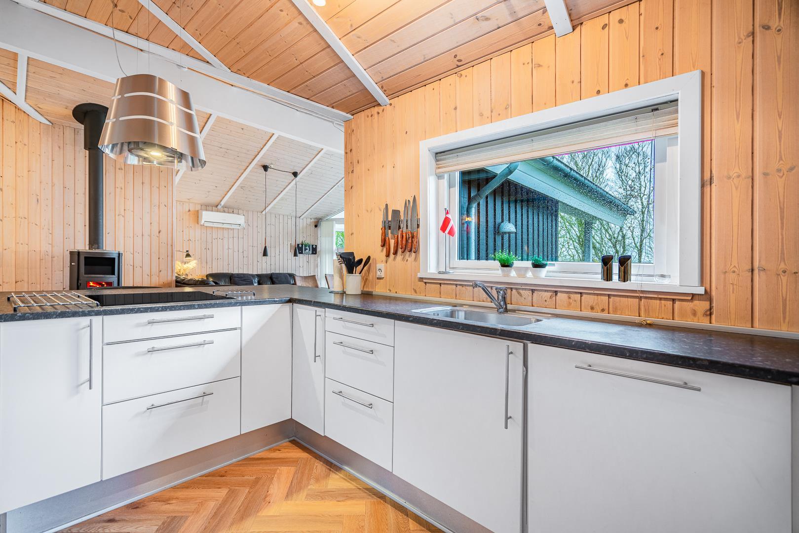 Den åbne køkkenafdeling er veludstyret – blandt andet med opvaskemaskine – og gør madlavningen til en fornøjelse. En moderne varmepumpe sørger for behagelig temperatur på en energivenlig måde.