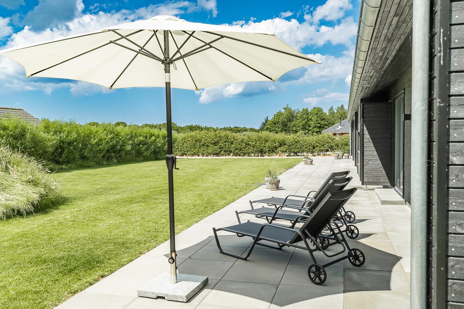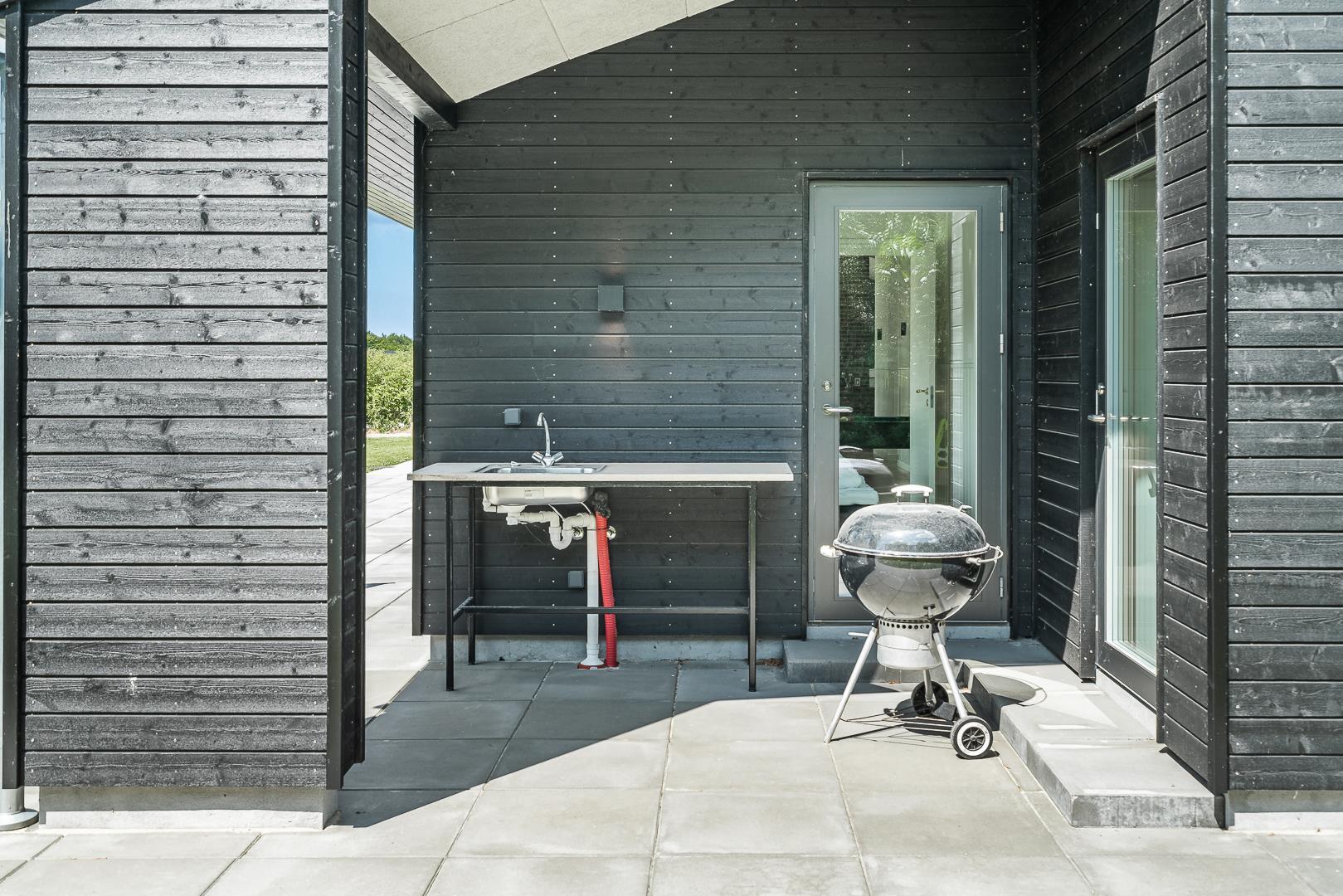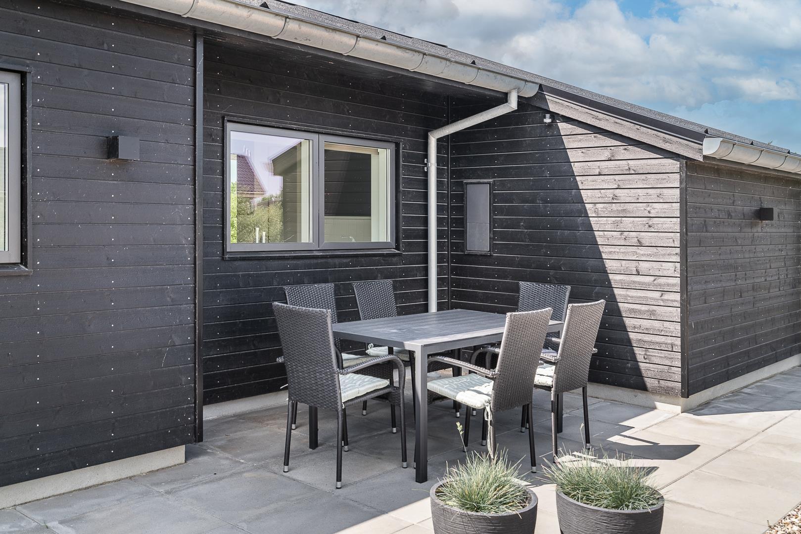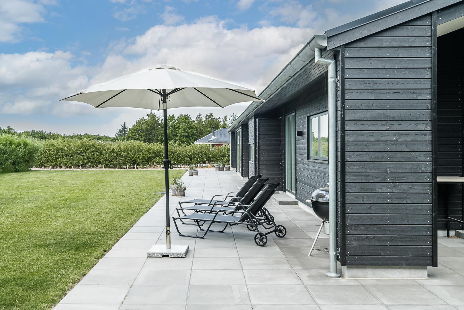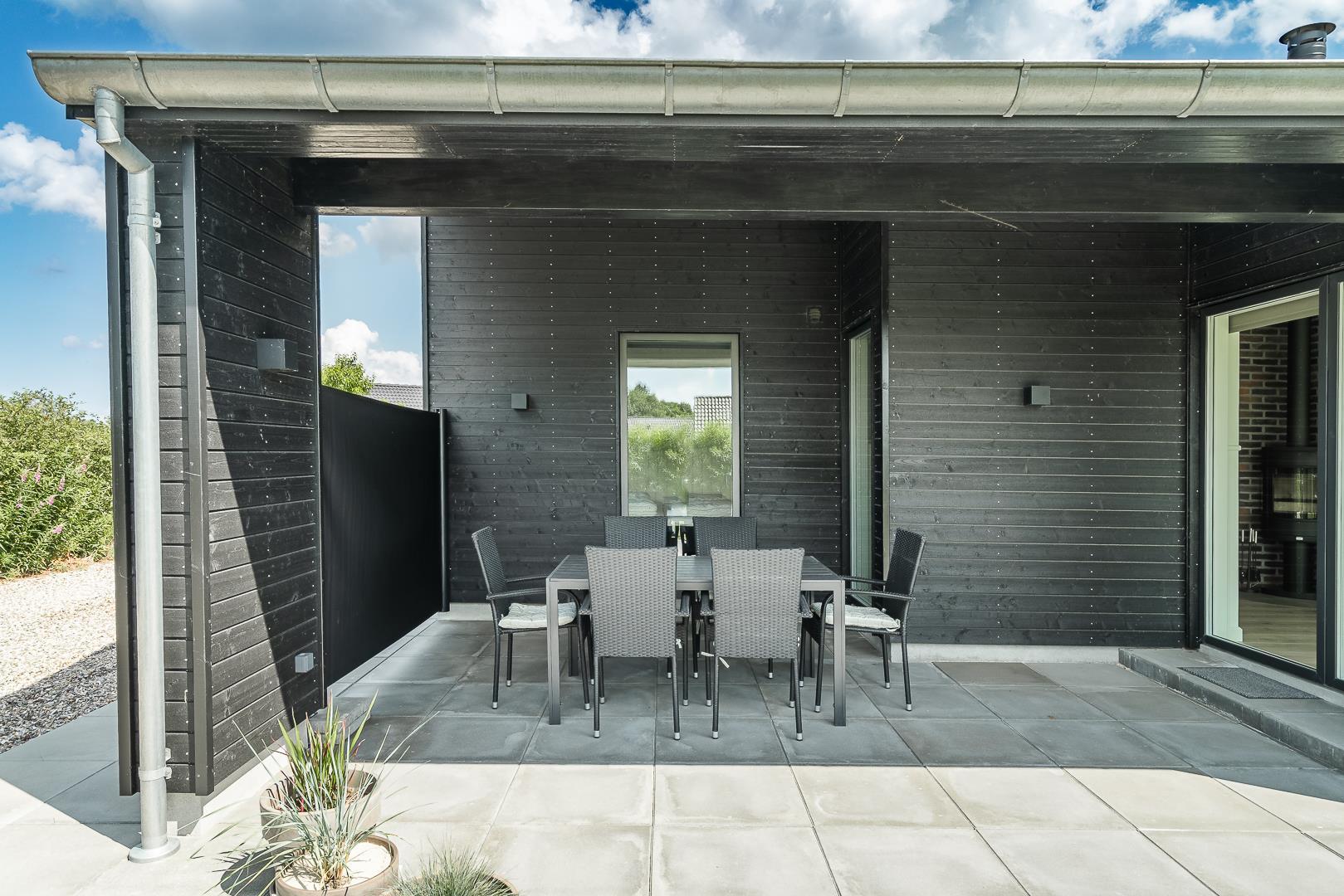 Den store terrasse – delvist overdækket – er ideel til både morgenkaffe og hyggelige aftener. Her finder I jeres helt egen wellness-oase: en udendørs spa, sauna og bruser, så I kan nyde frisk luft, varme og velvære under åben himmel.