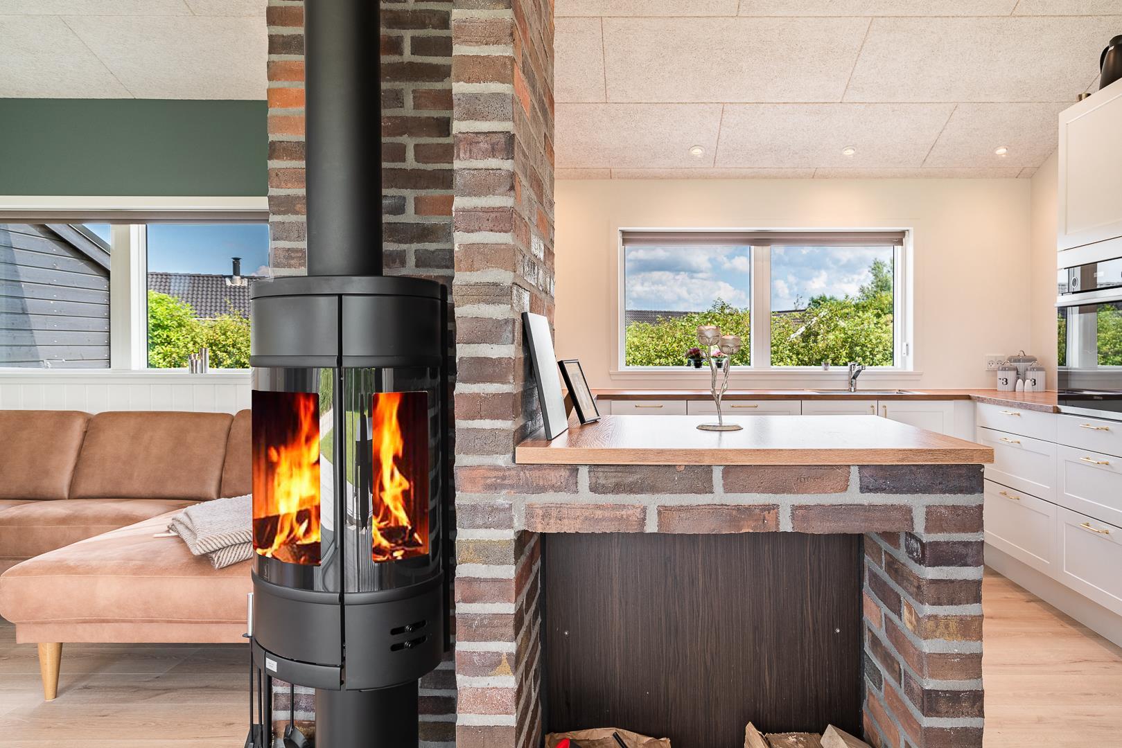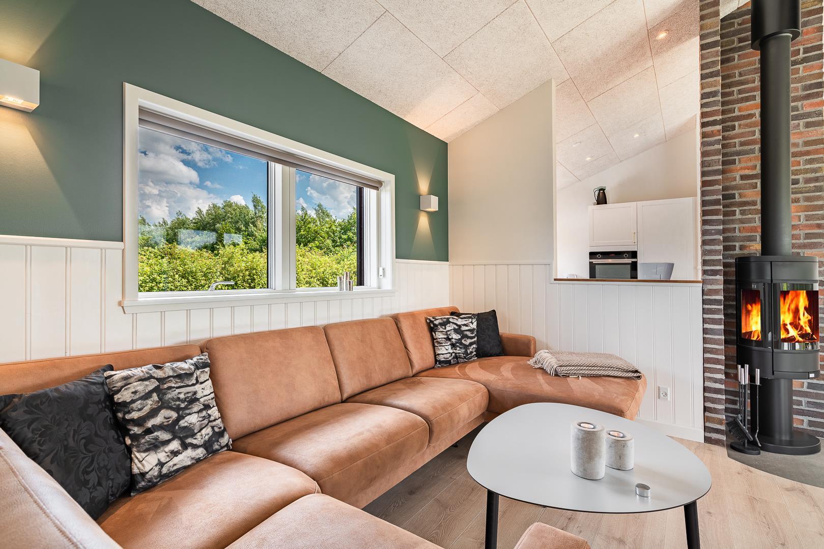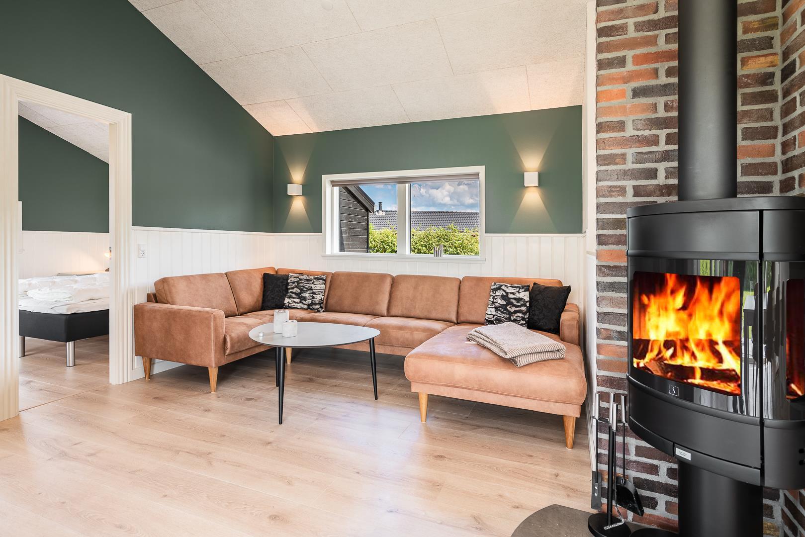 Den lyse og rummelige opholdsstue er sommerhusets hjerte. Her strømmer dagslyset ind gennem de store vinduer, og brændeovnen skaber varme og hygge, når vejret viser sig fra sin kølige side. Varmepumpen sikrer samtidig et behageligt indeklima året rundt.