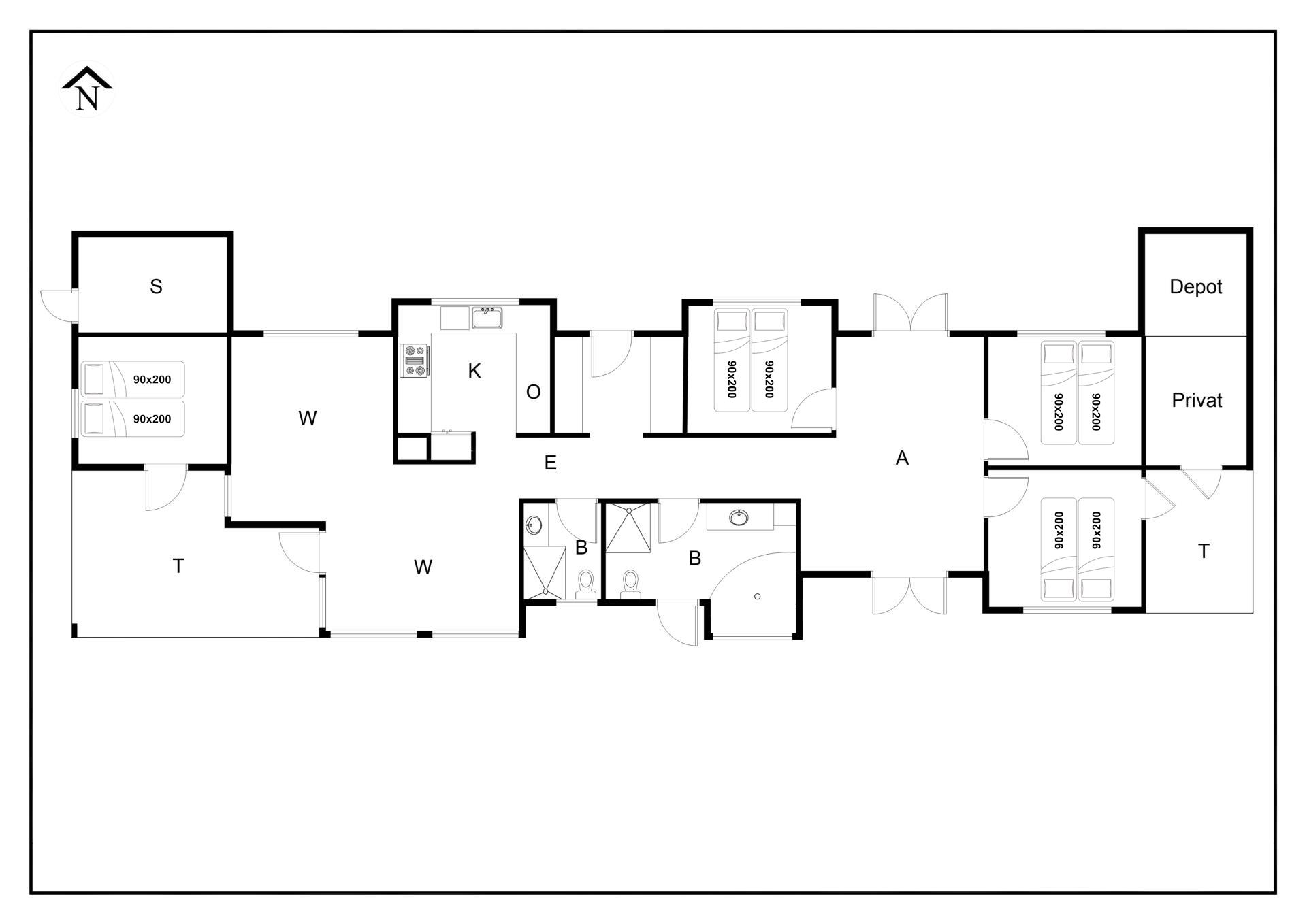 Sengestørrelse: 4 dobbeltsenge (hver med 2 madrasser á 90x200 cm).
