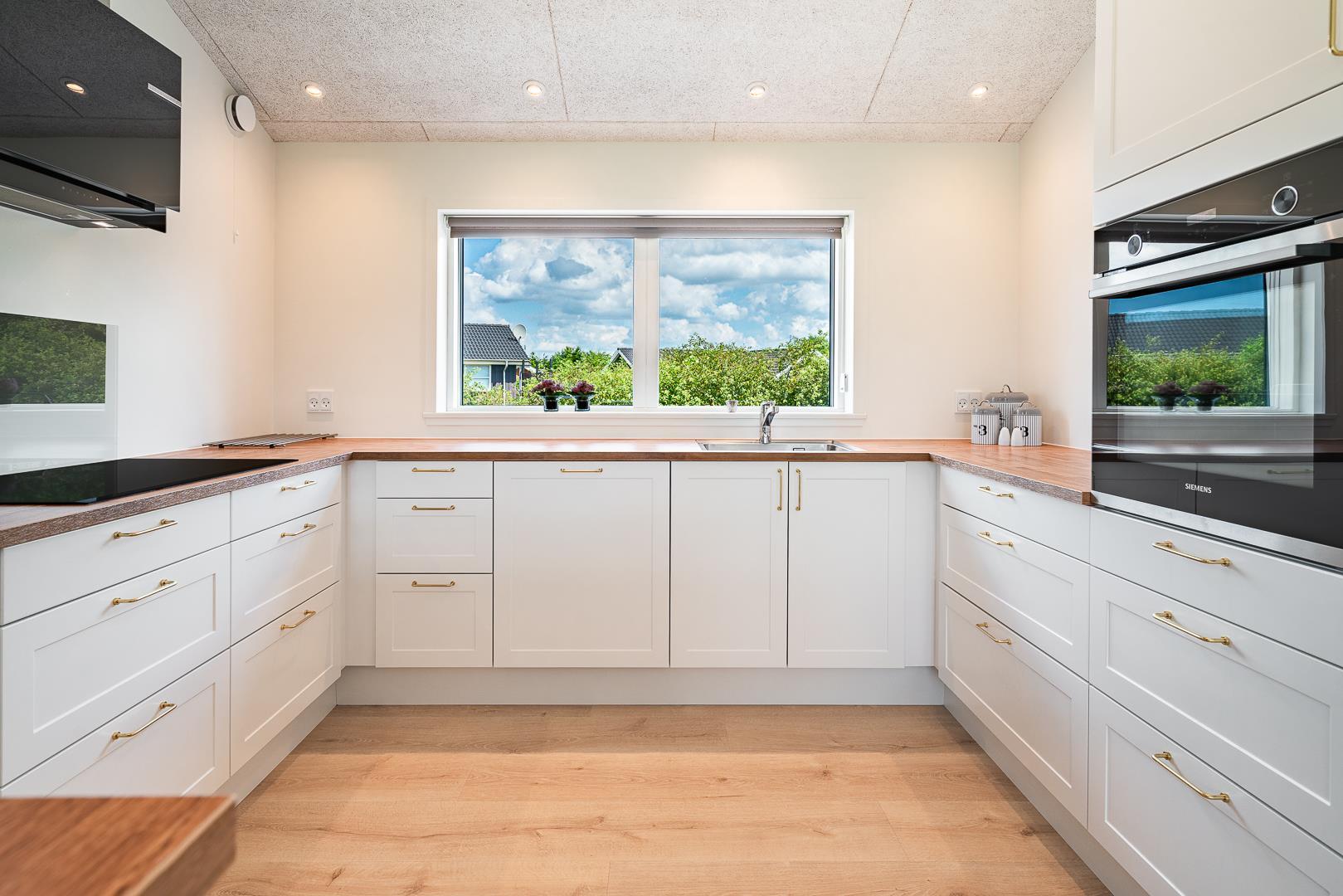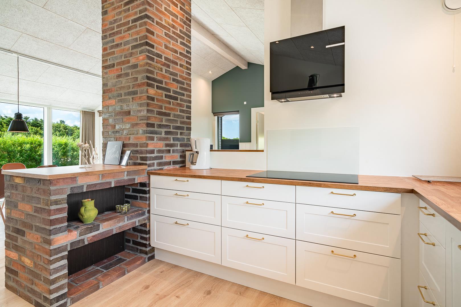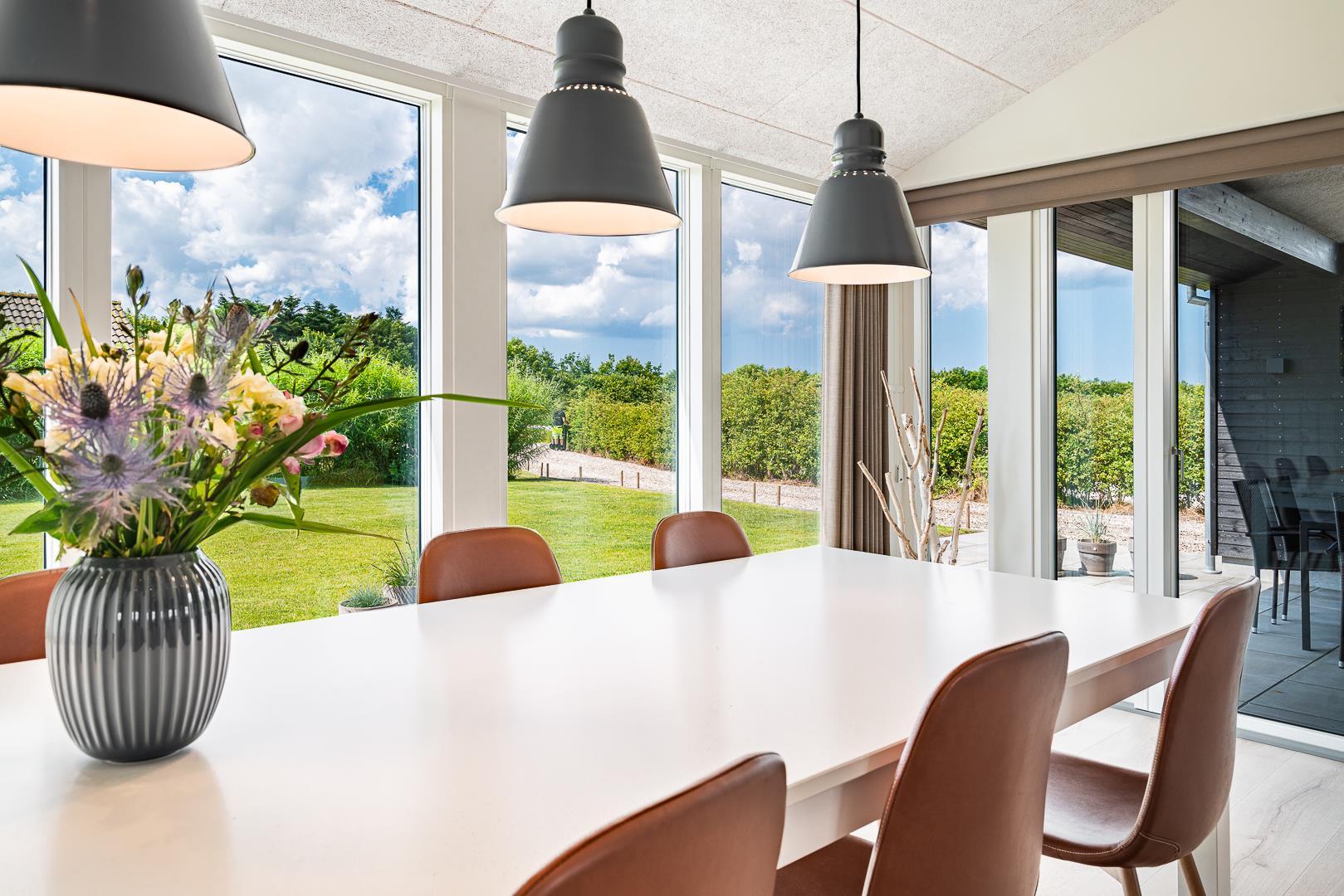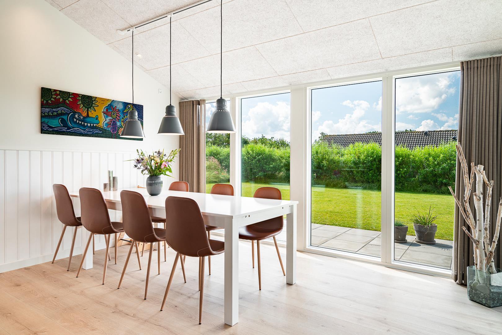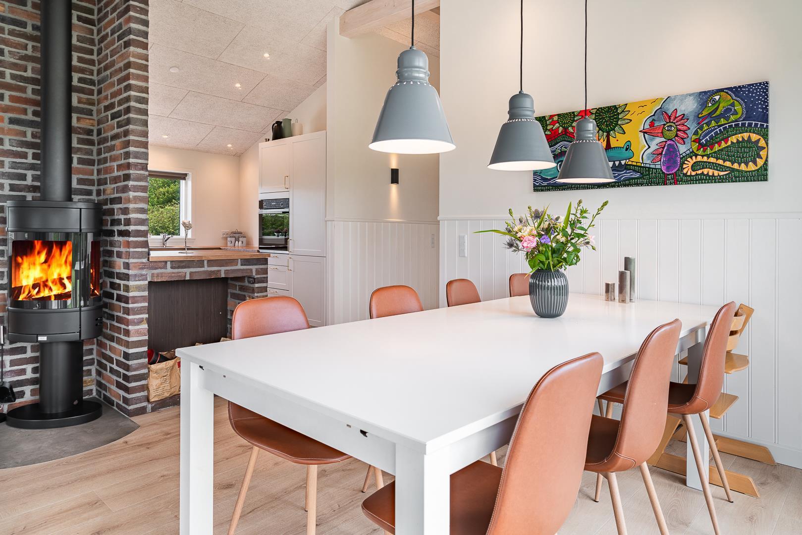 Det åbne køkken ligger i direkte forbindelse med spisepladsen og er fuldt udstyret – inklusiv opvaskemaskine – så madlavningen bliver nem og hyggelig. Ved det store spisebord er der god plads til både mad, spil og samvær.