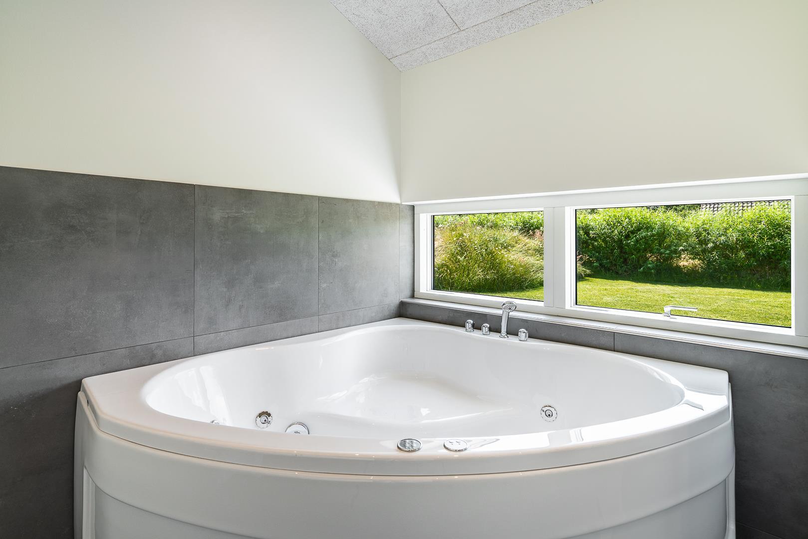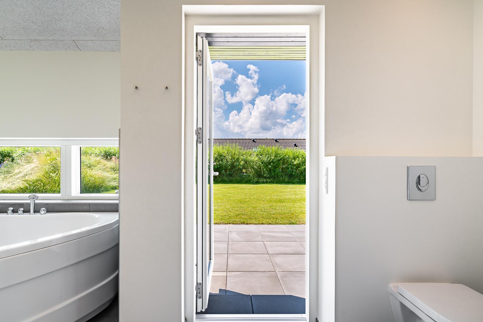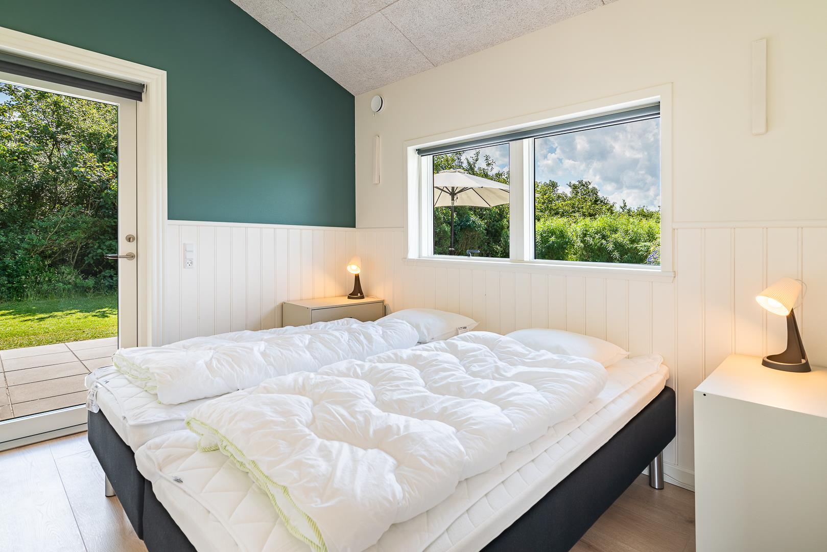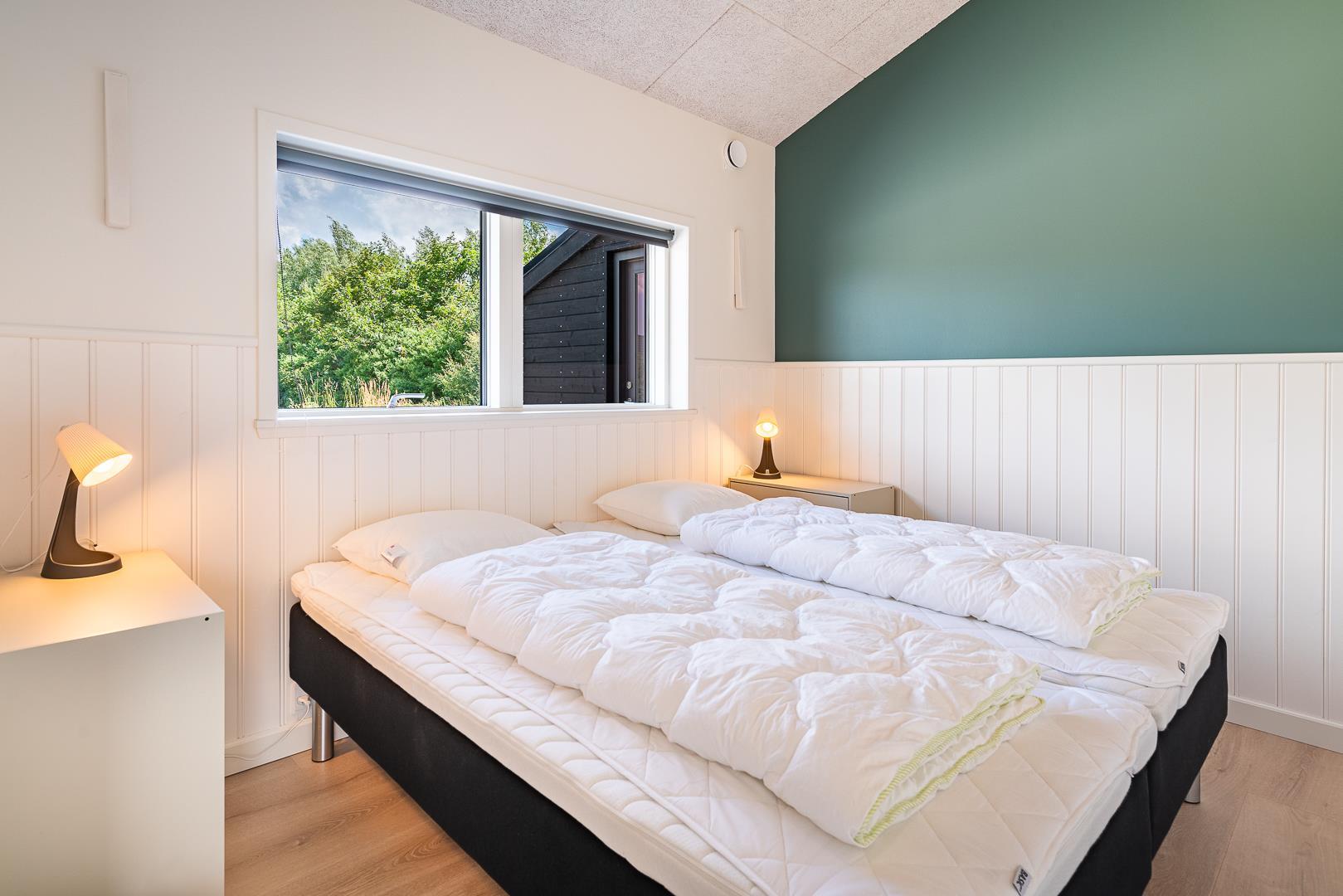 Sommerhuset har fire soveværelser, alle med dobbeltsenge – ideelt til både familier og par. De to badeværelser har gulvvarme, og i det ene finder I både spa og et lille badekar til familiens yngste.