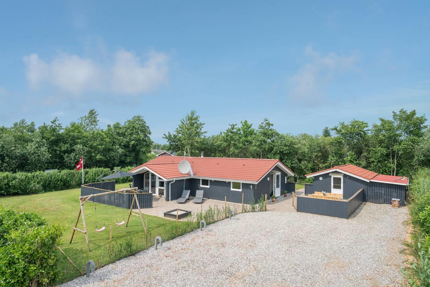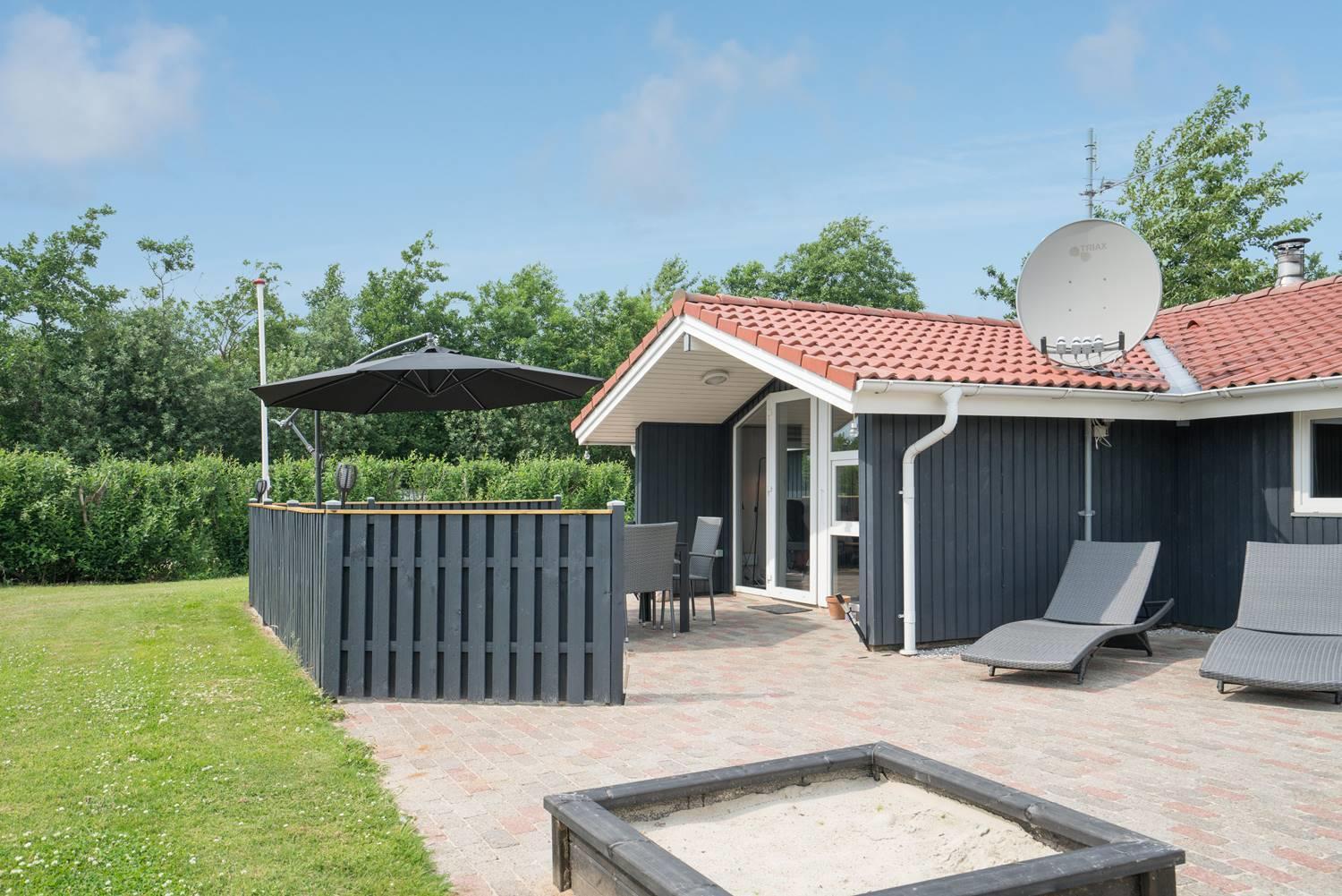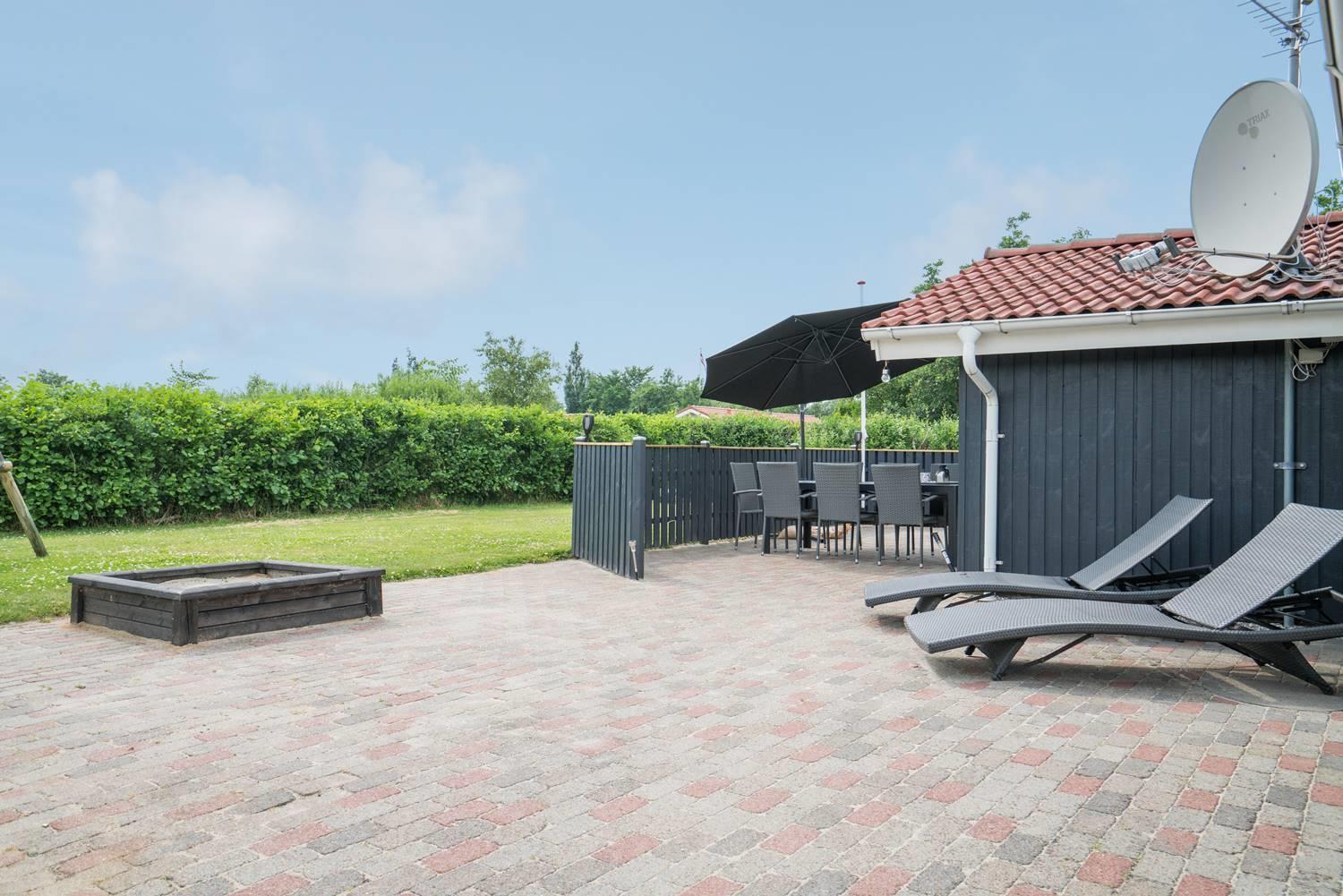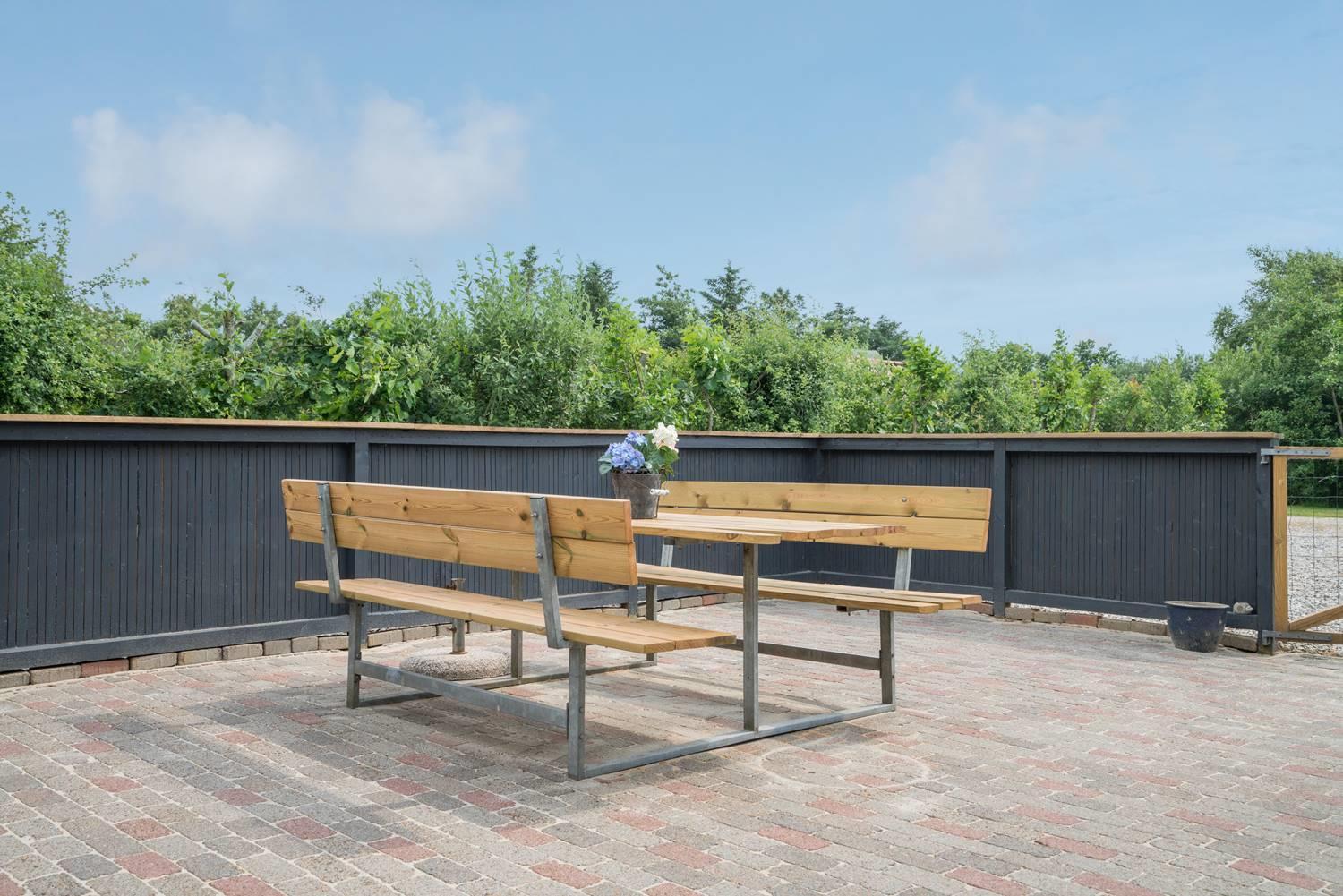 Den store, indhegnede have giver masser af plads til leg, boldspil og afslapning. For børnene er der gynge og sandkasse, og på den overdækkede terrasse kan I nyde jeres måltider og de lange sommeraftener – også når vinden frisker op.