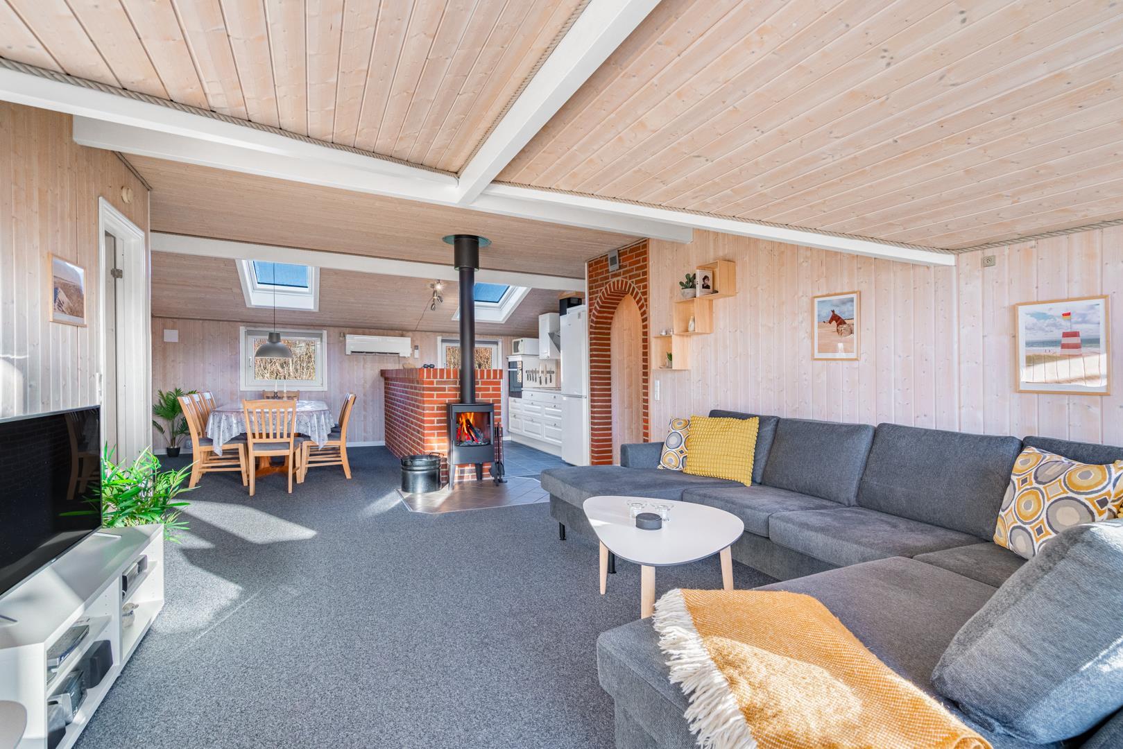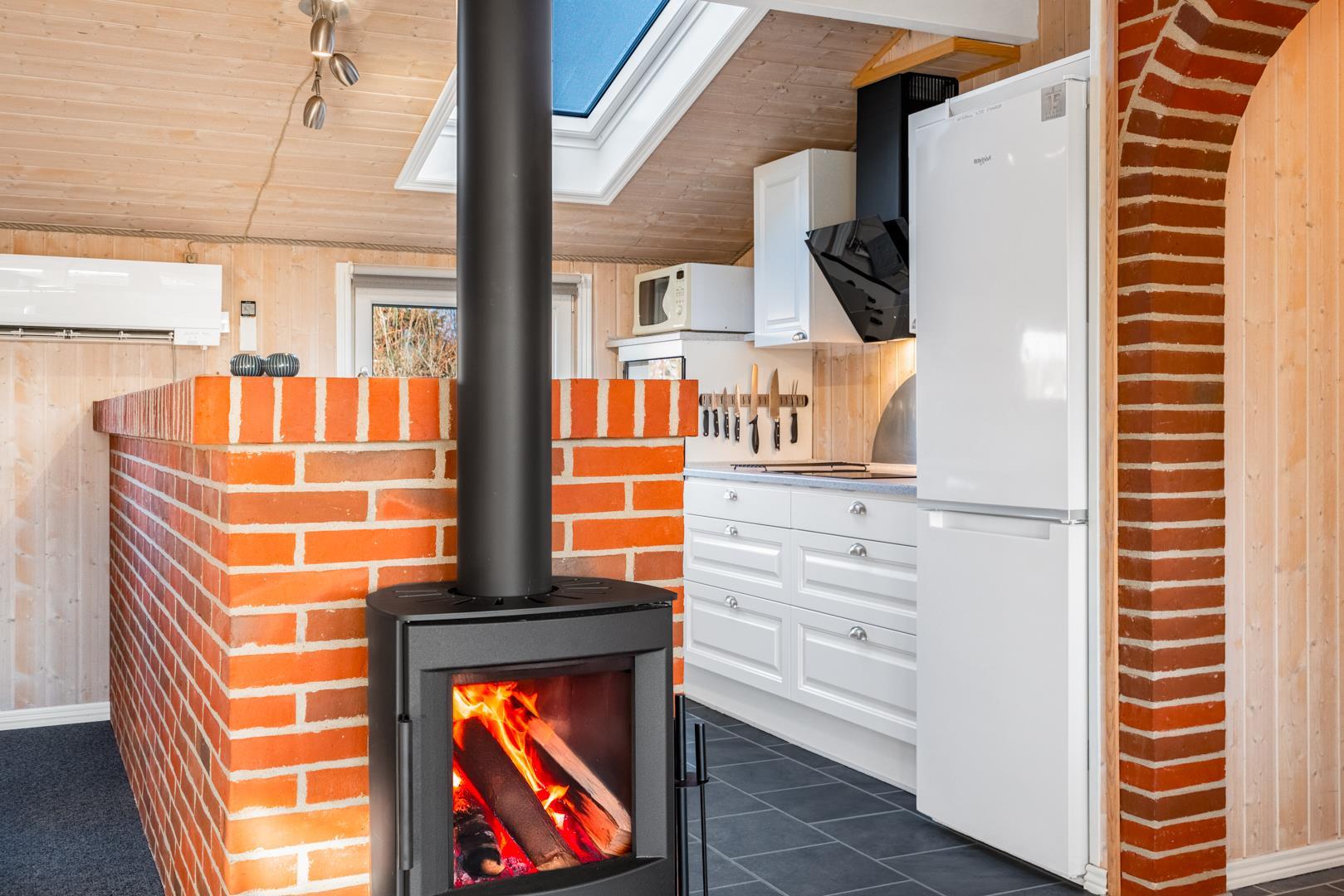 I den lyse stue kan I tænde op i brændeovnen og skabe den helt rigtige hygge efter en dag ved stranden eller fjorden. En varmepumpe og gulvvarme på badeværelset sørger for et behageligt indeklima året rundt.