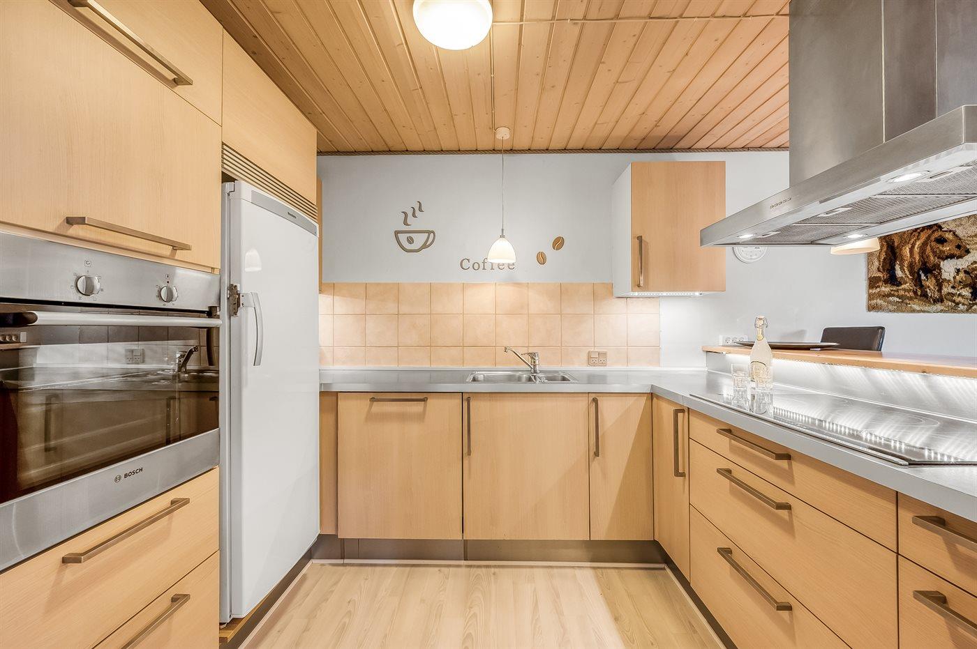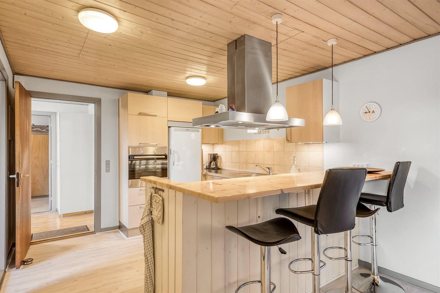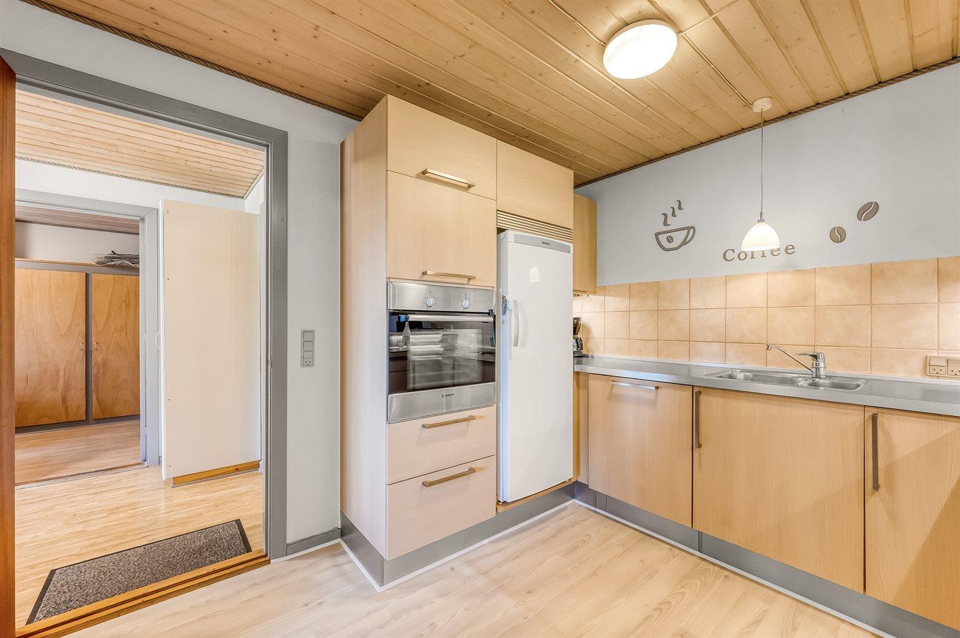 Køkkenet er udstyret med 1 køleskab. Der er 4 keramiske kogeplader, varmluftovn, mikrobølgeovn samt opvaskemaskine.