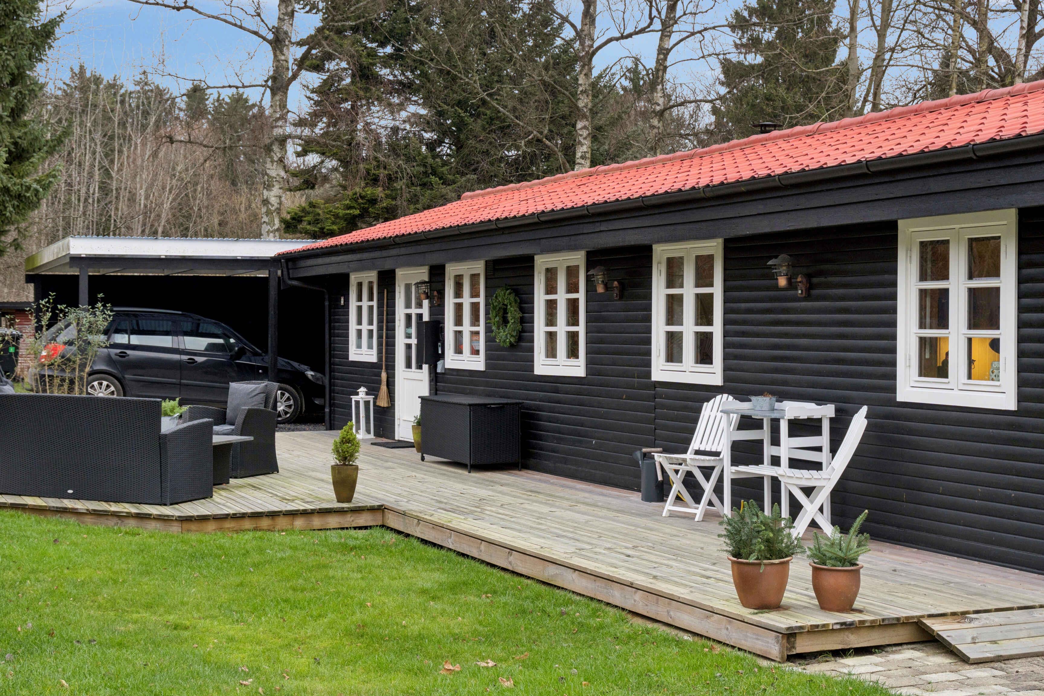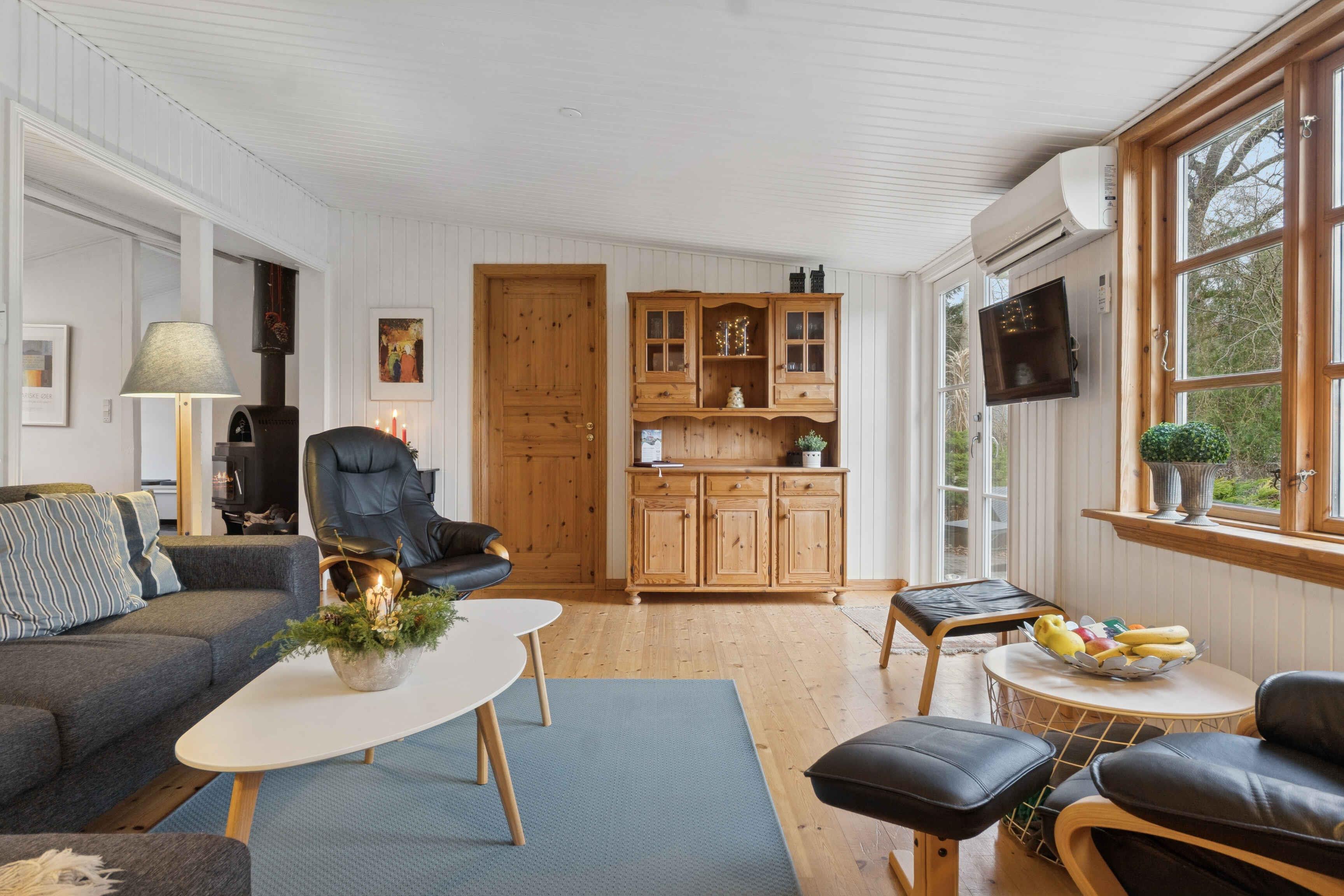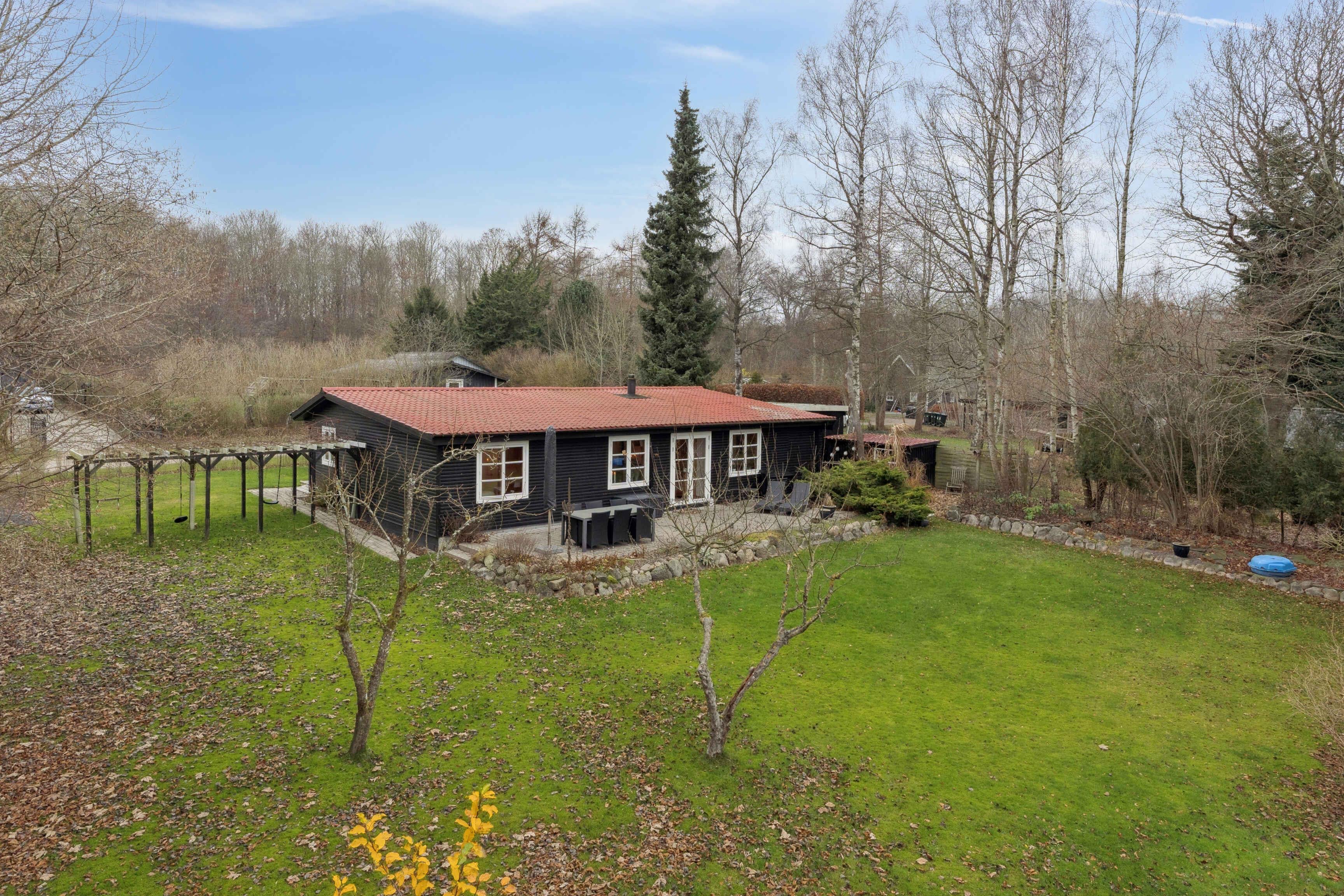 Velkommen til et rummeligt sommerhus på 106 m² med plads til seks gæster fordelt på tre soveværelser. Huset er indrettet med fokus på funktionalitet og afslapning, så ferien kan nydes fra første øjeblik. Stuen er samlingspunktet med brændeovn, smart-tv og store vinduer mod haven. Herfra er der udgang til den store terrasse, hvor måltider og rolige timer i frisk luft kan nydes. Køkkenet ligger i åben forbindelse med opholdsrummet og giver gode rammer for fælles madlavning. En varmepumpe sikrer et behageligt indeklima året rundt, og der er internet til arbejde eller streaming. De tre soveværelser er enkelt indrettet med god plads til hvile. Badeværelset er praktisk og funktionelt. Alt er gjort klar til en uforstyrret ferie for både par og familier. Grunden er stor og giver plads til leg, spil og ro. Terrassen ligger perfekt til sol og udeliv, og naturen omkring huset kan opleves lige udenfor døren. Kun 400 meter fra huset ligger en badesø med roligt vand og grønne omgivelser. Et oplagt sted til morgenbadning, afslapning eller en dag i solen med børn. Området byder på naturoplevelser, der gør ferien aktiv og afstressende på samme tid. Her findes varierede vandreruter langs marker, skov og søer, hvor fuglesang og åbne landskaber skaber ro. Mountainbikeruter i området giver mulighed for tempo og teknik i skoven. For golfentusiaster ligger en velholdt bane knap syv kilometer væk. De rolige omgivelser og gode stisystemer gør det let at kombinere afslapning, motion og natur. Der er ladestik (type 2) til elbil, så turen hertil kan gøres nem og grøn. Huset tilbyder fleksible rammer for ferie året rundt – uanset ønsket om aktivitet, afslapning eller hygge. Dette sommerhus giver en enkel og velbalanceret base for en ferie tæt på natur, vand og gode oplevelser. Her er plads til både nærvær og eventyr.