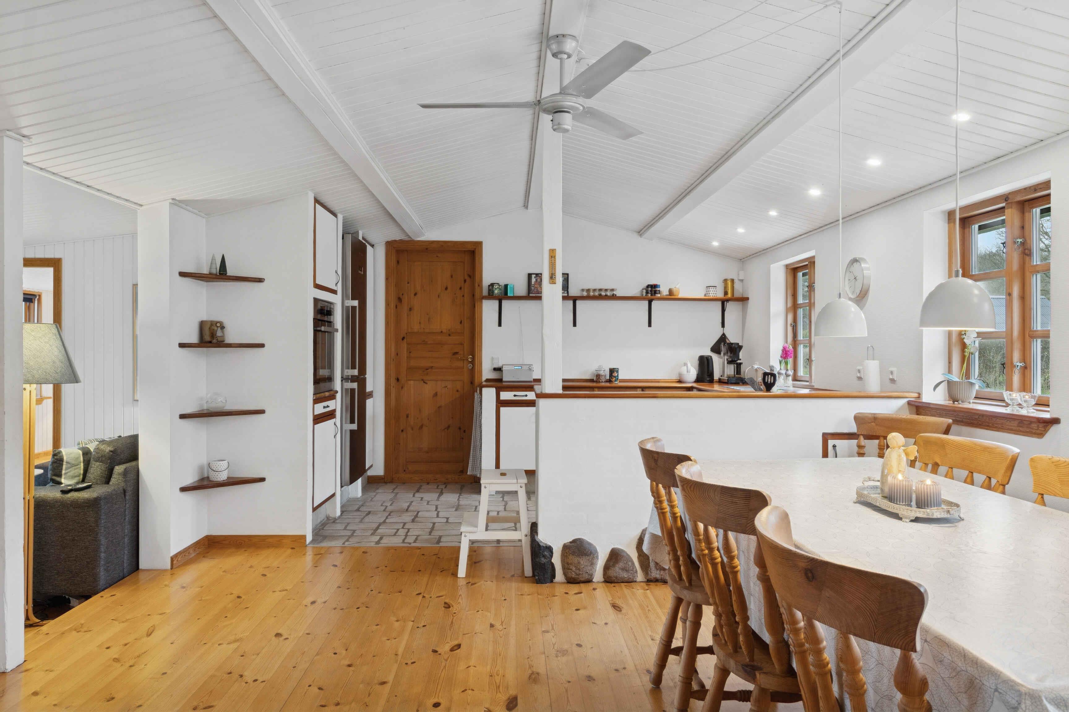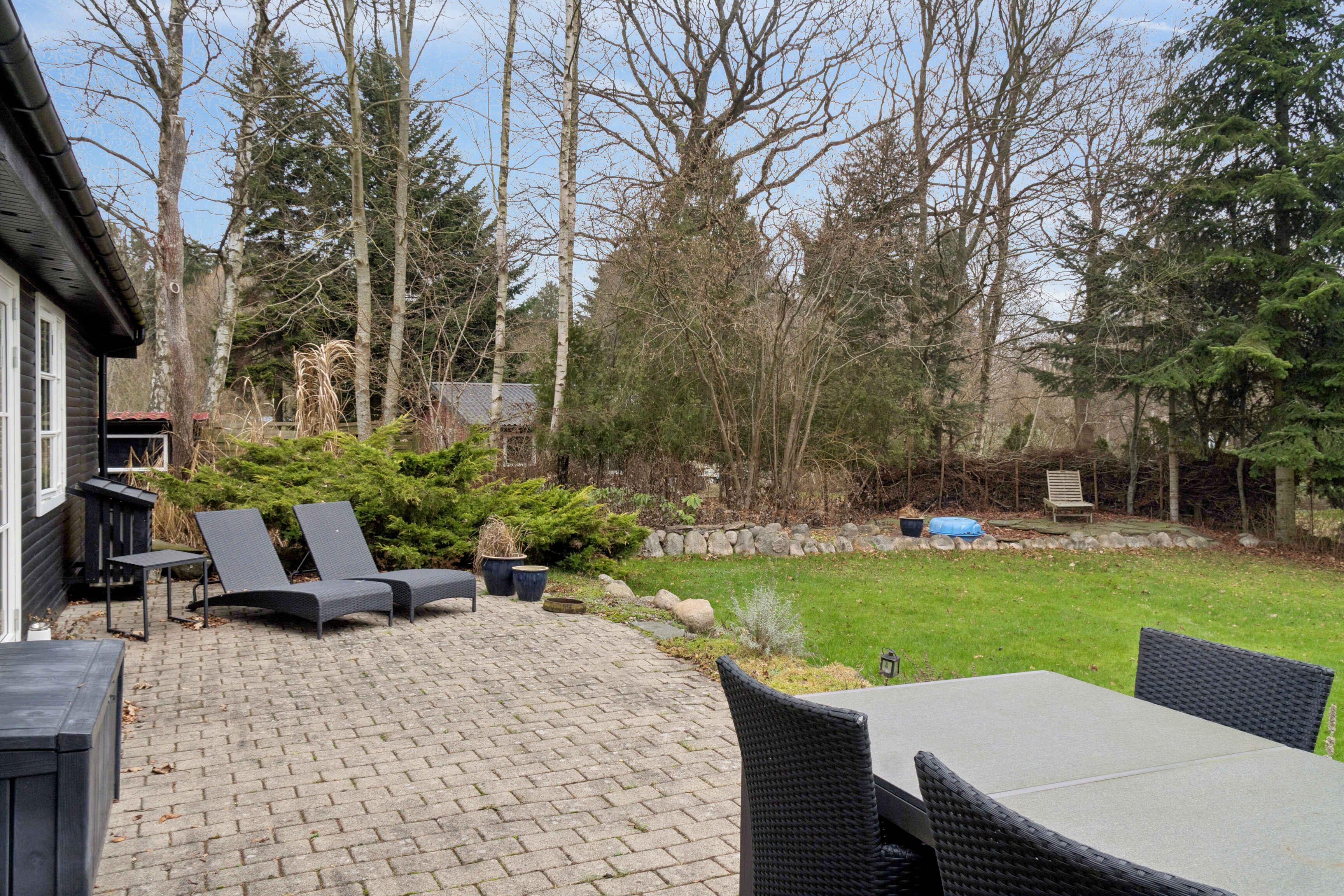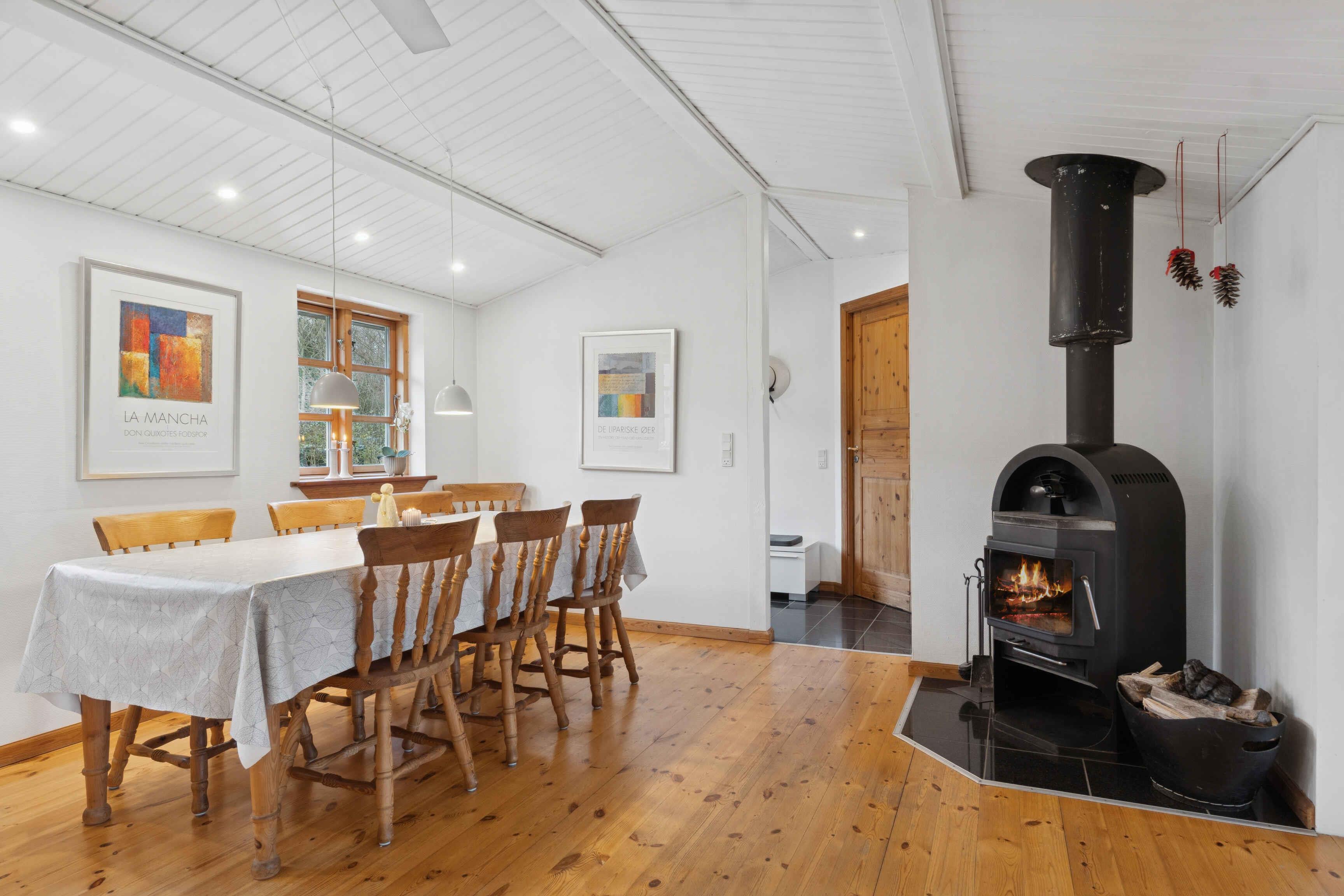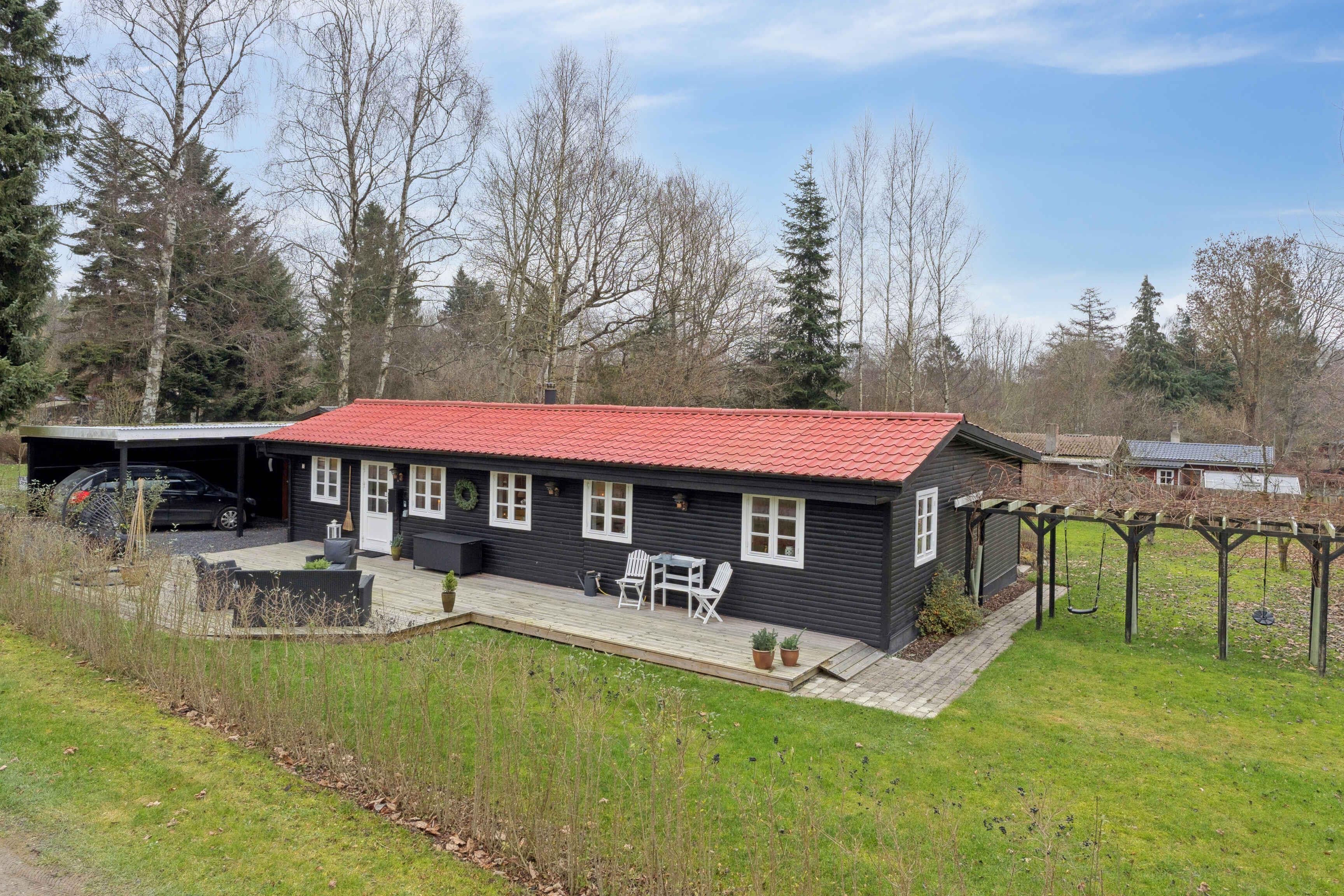 Velkommen til et rummeligt sommerhus på 106 m² med plads til seks gæster fordelt på tre soveværelser. Huset er indrettet med fokus på funktionalitet og afslapning, så ferien kan nydes fra første øjeblik. Stuen er samlingspunktet med brændeovn, smart-tv og store vinduer mod haven. Herfra er der udgang til den store terrasse, hvor måltider og rolige timer i frisk luft kan nydes. Køkkenet ligger i åben forbindelse med opholdsrummet og giver gode rammer for fælles madlavning. En varmepumpe sikrer et behageligt indeklima året rundt, og der er internet til arbejde eller streaming. De tre soveværelser er enkelt indrettet med god plads til hvile. Badeværelset er praktisk og funktionelt. Alt er gjort klar til en uforstyrret ferie for både par og familier. Grunden er stor og giver plads til leg, spil og ro. Terrassen ligger perfekt til sol og udeliv, og naturen omkring huset kan opleves lige udenfor døren. Kun 400 meter fra huset ligger en badesø med roligt vand og grønne omgivelser. Et oplagt sted til morgenbadning, afslapning eller en dag i solen med børn. Området byder på naturoplevelser, der gør ferien aktiv og afstressende på samme tid. Her findes varierede vandreruter langs marker, skov og søer, hvor fuglesang og åbne landskaber skaber ro. Mountainbikeruter i området giver mulighed for tempo og teknik i skoven. For golfentusiaster ligger en velholdt bane knap syv kilometer væk. De rolige omgivelser og gode stisystemer gør det let at kombinere afslapning, motion og natur. Der er ladestik (type 2) til elbil, så turen hertil kan gøres nem og grøn. Huset tilbyder fleksible rammer for ferie året rundt – uanset ønsket om aktivitet, afslapning eller hygge. Dette sommerhus giver en enkel og velbalanceret base for en ferie tæt på natur, vand og gode oplevelser. Her er plads til både nærvær og eventyr.