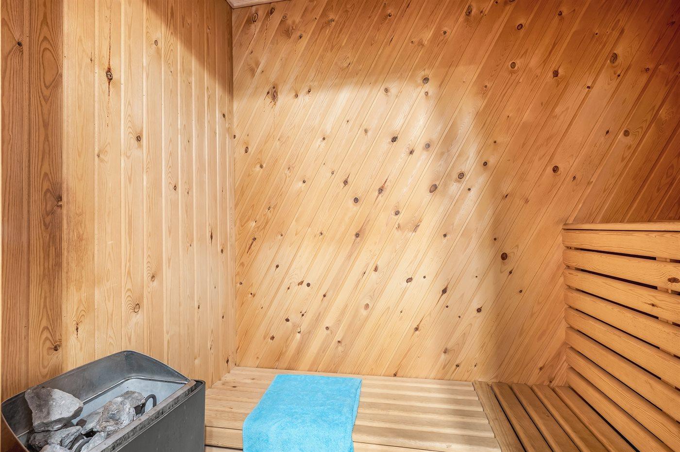 Der er 2 badeværelser med bruseniche og 2 toiletter. Der er gulvvarme på 1 badeværelse. I saunaen er der mulighed for afslapning.