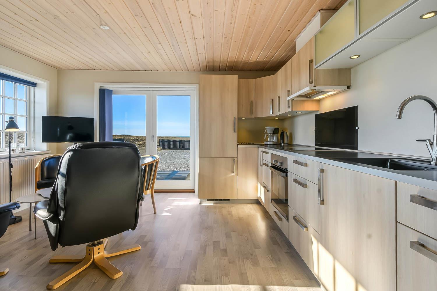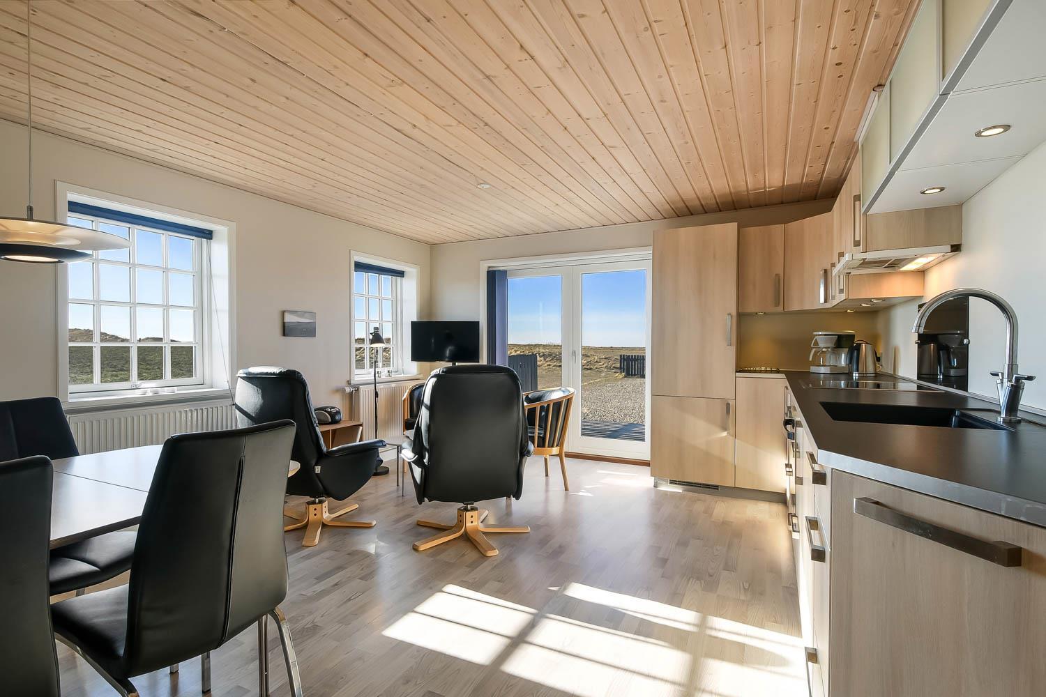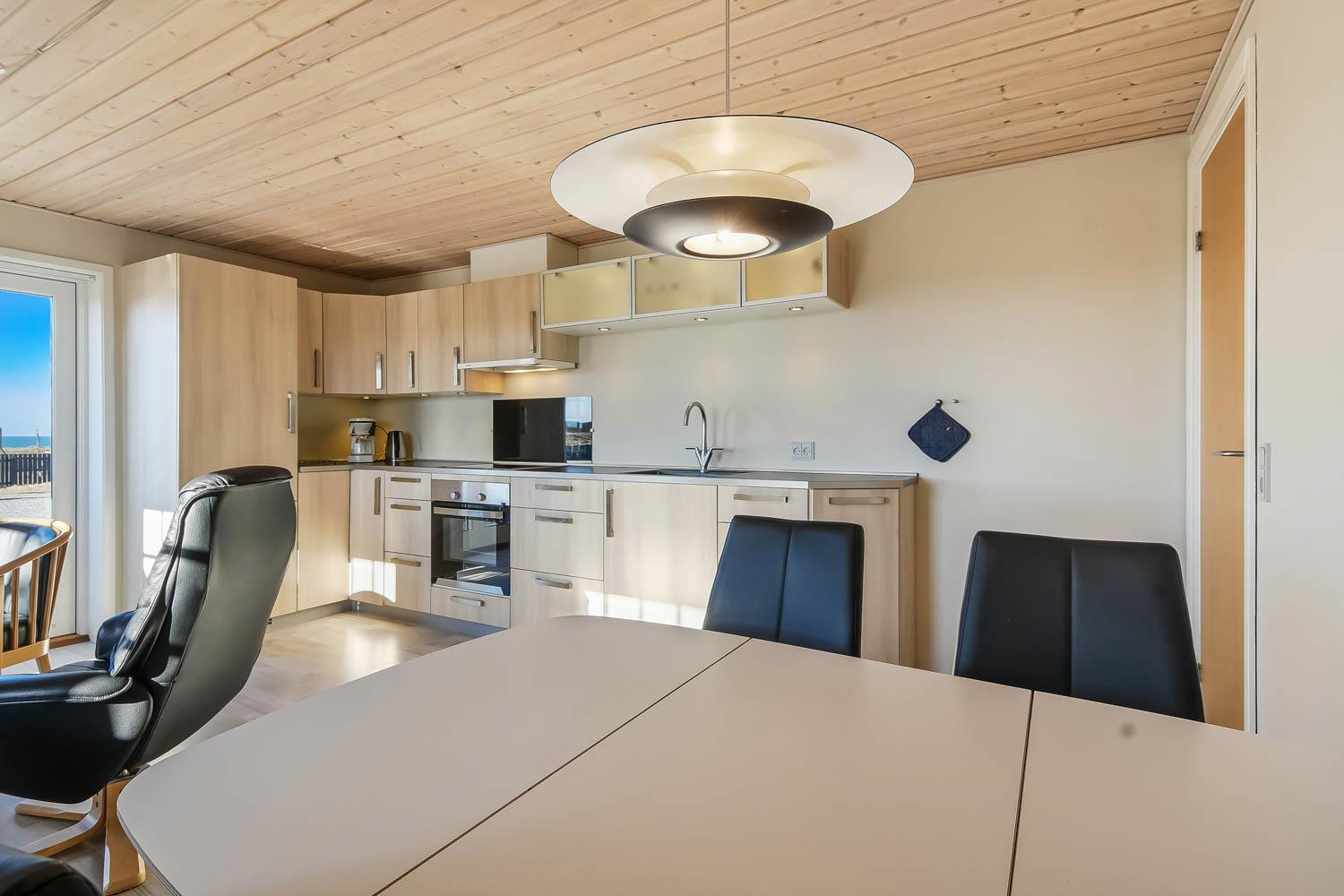 Meget godt indrettet køkken som indeholder bl.a. el-komfur og køleskab med fryser. Huset har 2 soveværelser, som er med 1DS + 1DS. Stuen, som er kombineret med køkkenet, er indrettet med spiseafdeling og gode lædermøbler og panoramavinduer. Fladskærms-TV med DR1, CD-afspiller. Fra stuen er der en flot udsigt over området og Vesterhavet, og det store vinduesparti giver et godt lysindfald i rummet. 2 soveværelser med 1DS + 1DS. Huset råder over 2 badeværelser, som hver har toilet, håndvask og i det ene er der også en bruser. Vaskemaskine og tørretumbler findes i fælleshus. Dette er et ikke rygerhus. 1 husdyr er tilladt.
