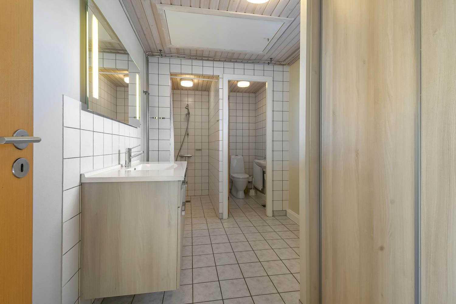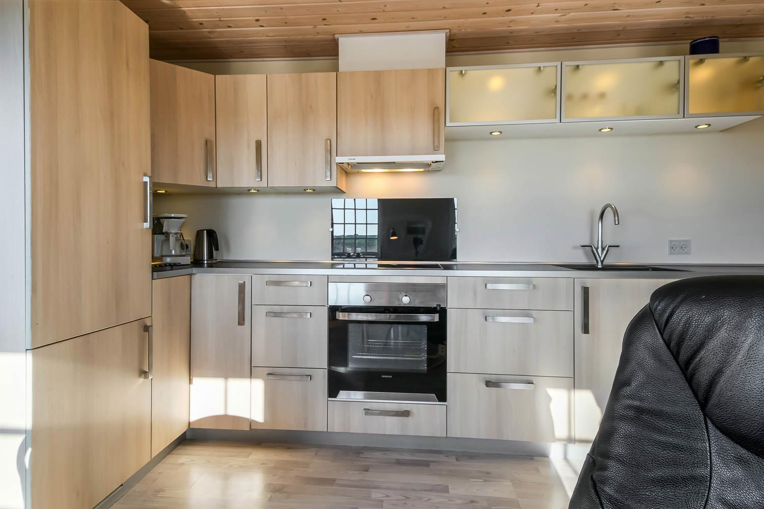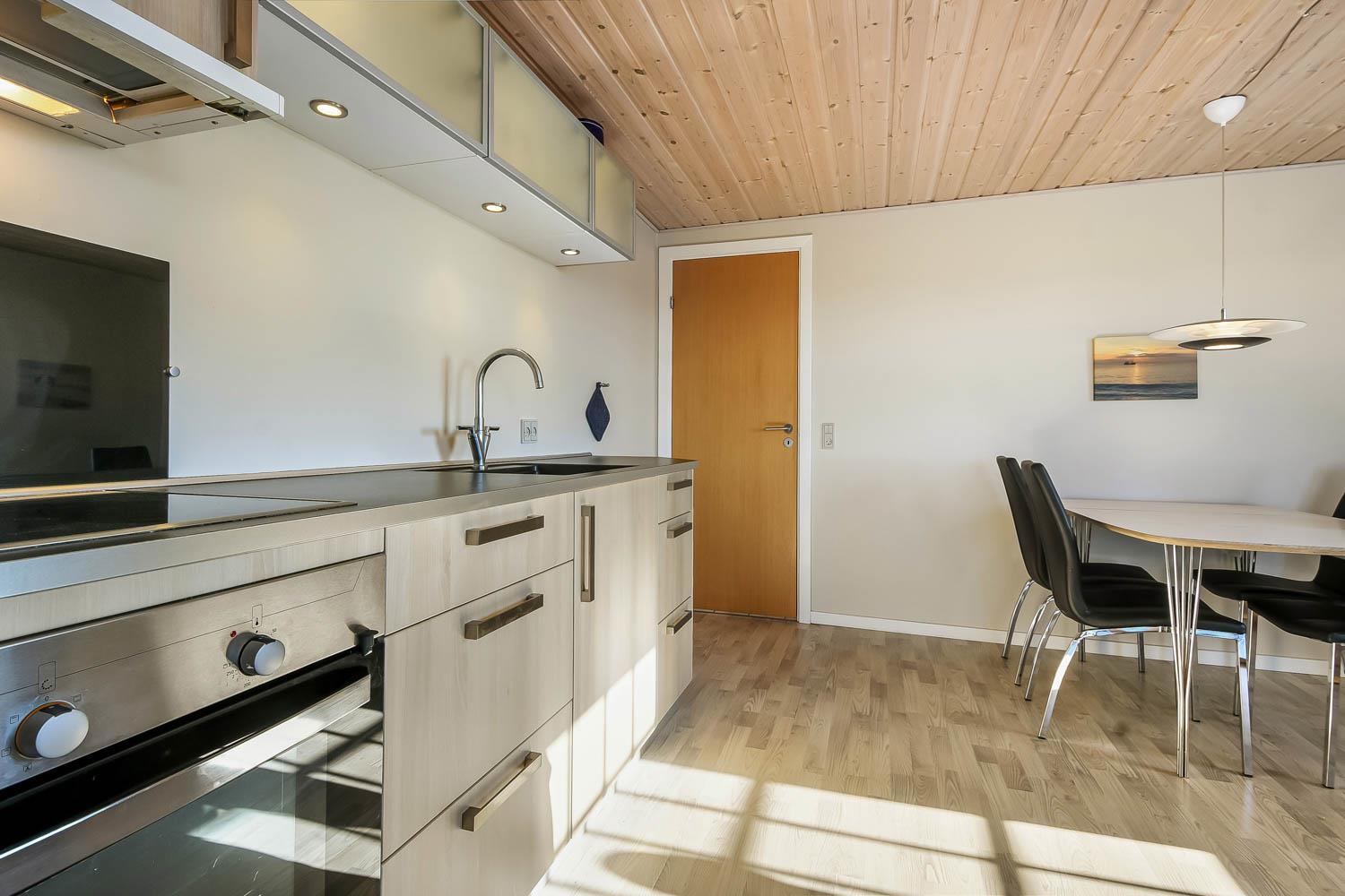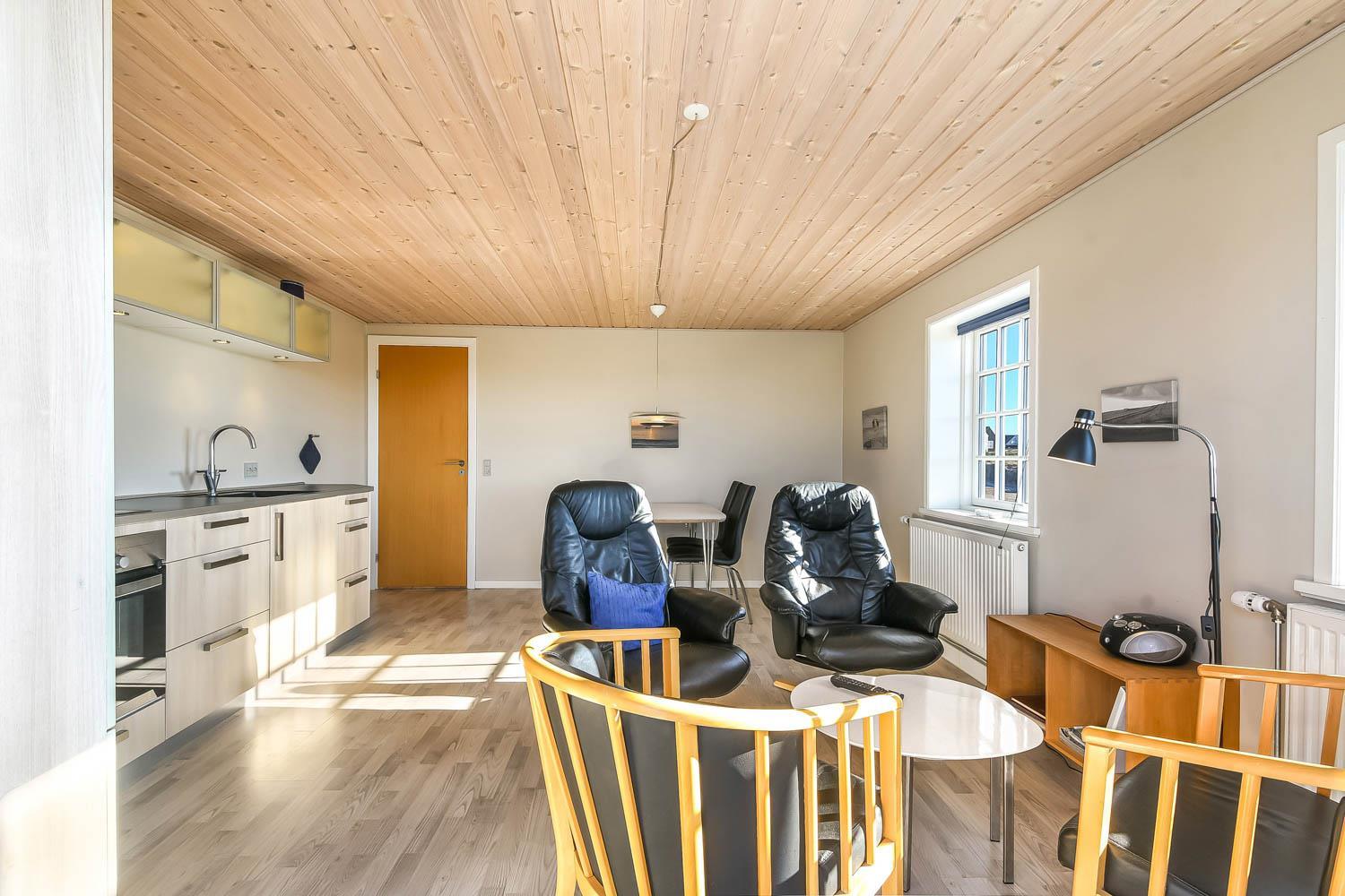 Meget godt indrettet køkken som indeholder bl.a. el-komfur og køleskab med fryser. Huset har 2 soveværelser, som er med 1DS + 1DS. Stuen, som er kombineret med køkkenet, er indrettet med spiseafdeling og gode lædermøbler og panoramavinduer. Fladskærms-TV med DR1, CD-afspiller. Fra stuen er der en flot udsigt over området og Vesterhavet, og det store vinduesparti giver et godt lysindfald i rummet. 2 soveværelser med 1DS + 1DS. Huset råder over 2 badeværelser, som hver har toilet, håndvask og i det ene er der også en bruser. Vaskemaskine og tørretumbler findes i fælleshus. Dette er et ikke rygerhus. 1 husdyr er tilladt.