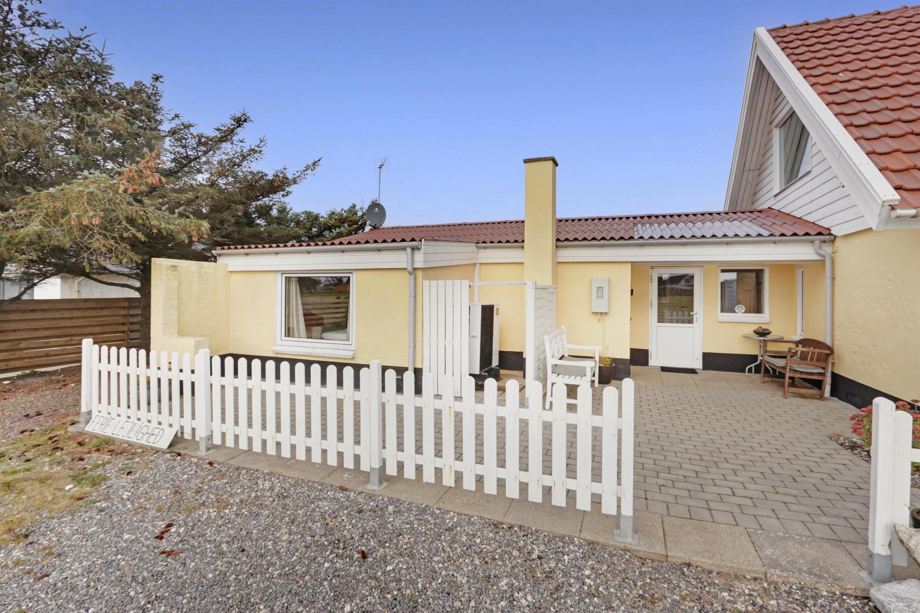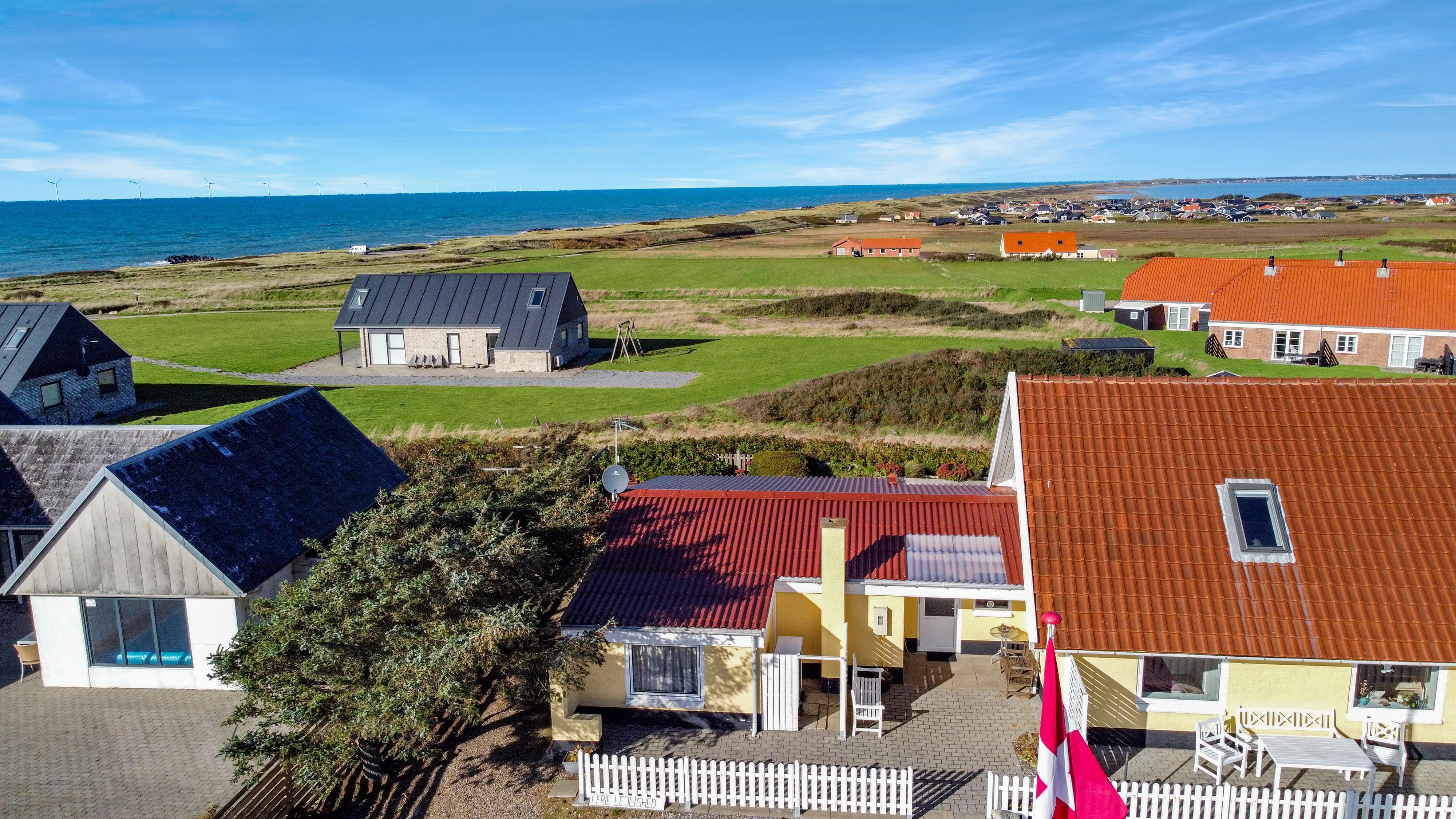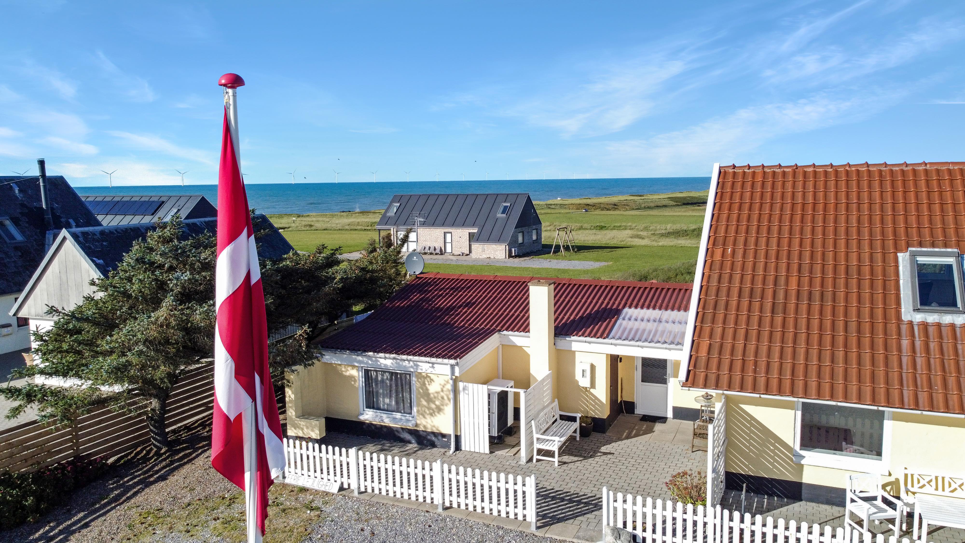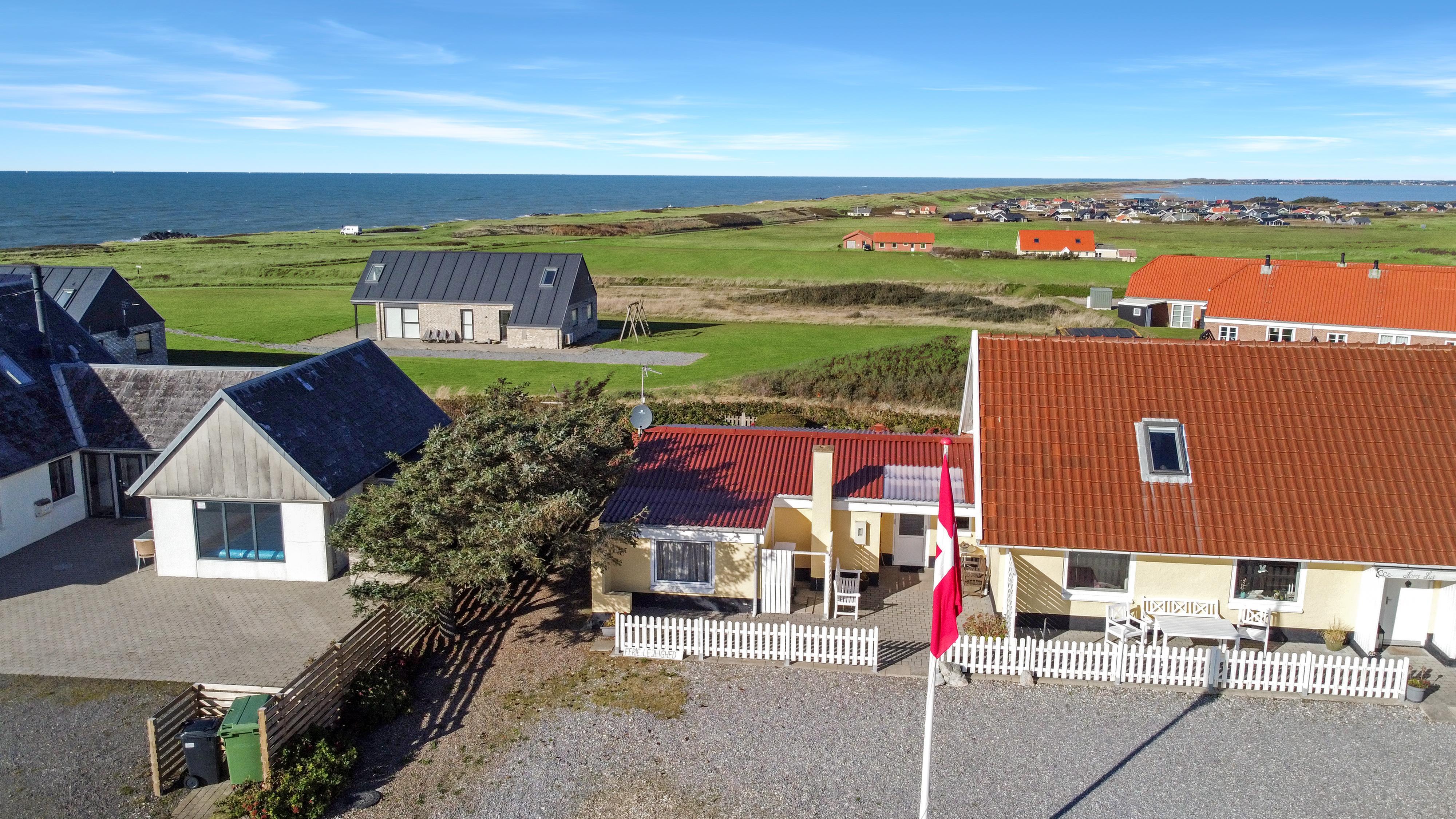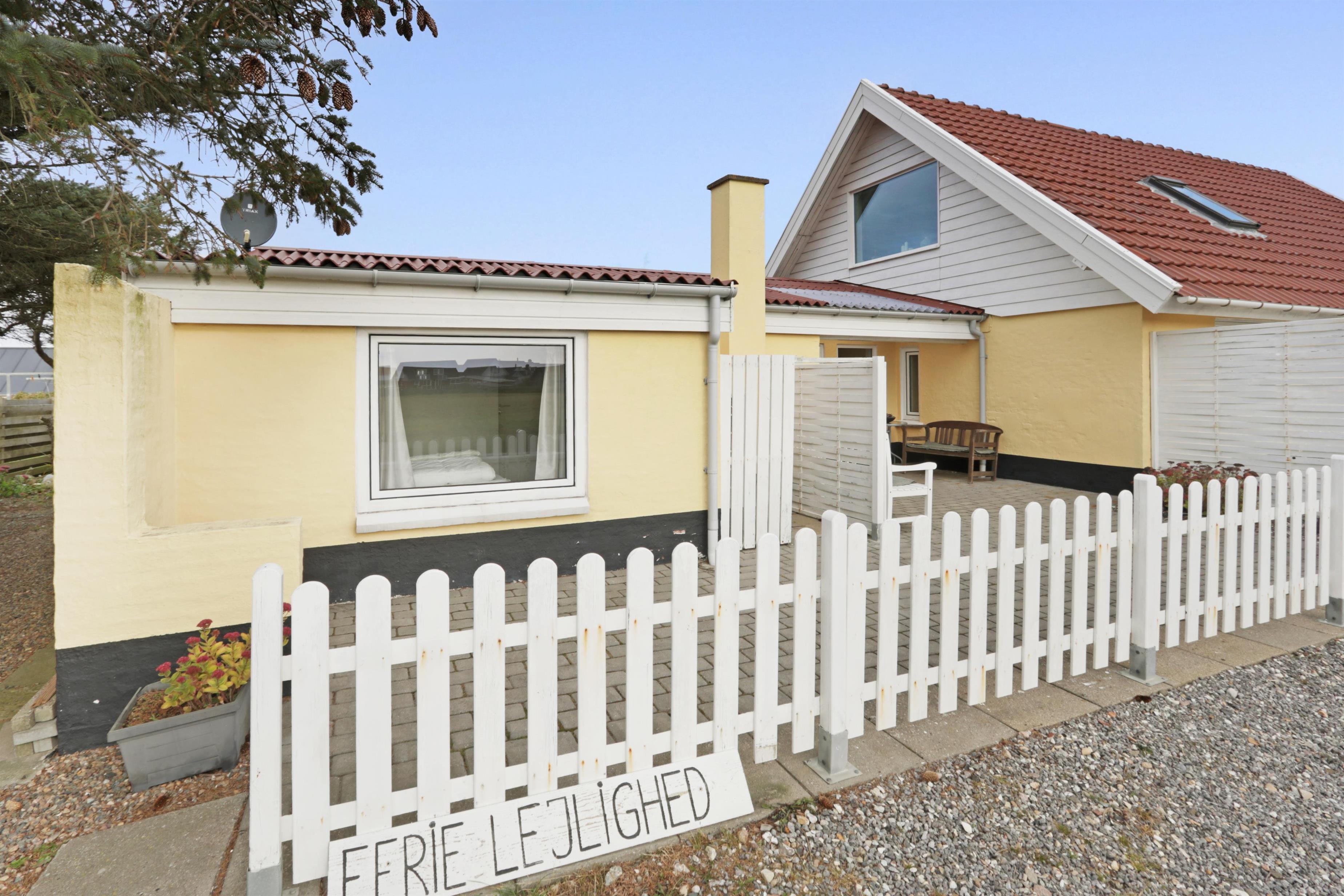 Lejligheden ligger i forbindelse med ejerens bolig, men har egen indgang, så I kan nyde privatliv og ro. Udenfor venter en dejlig delvis overdækket, gårdhave og terrasse med havemøbler, grill og solvogne og en have – alt sammen med udsigt til det brusende hav.