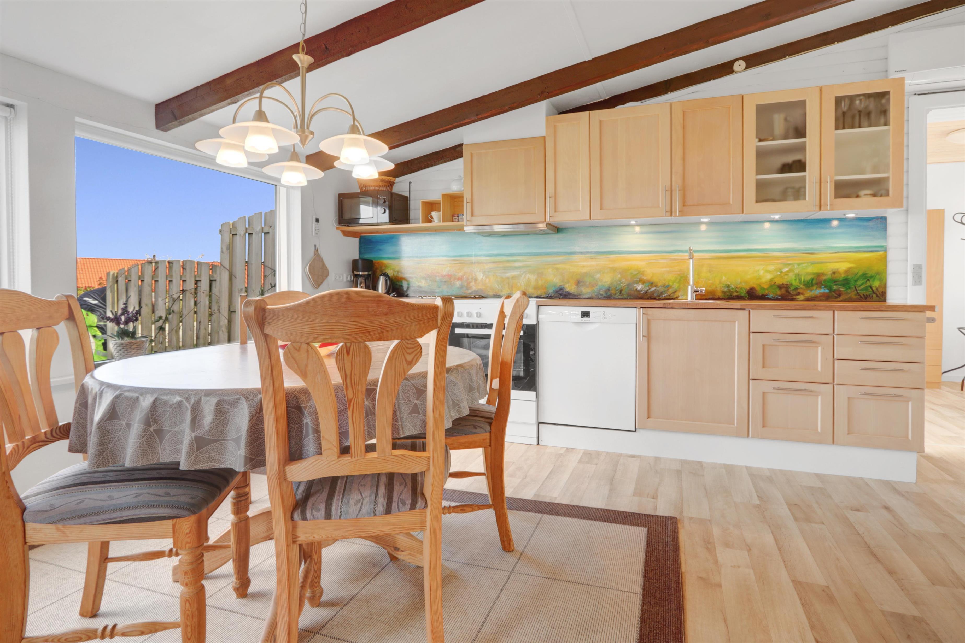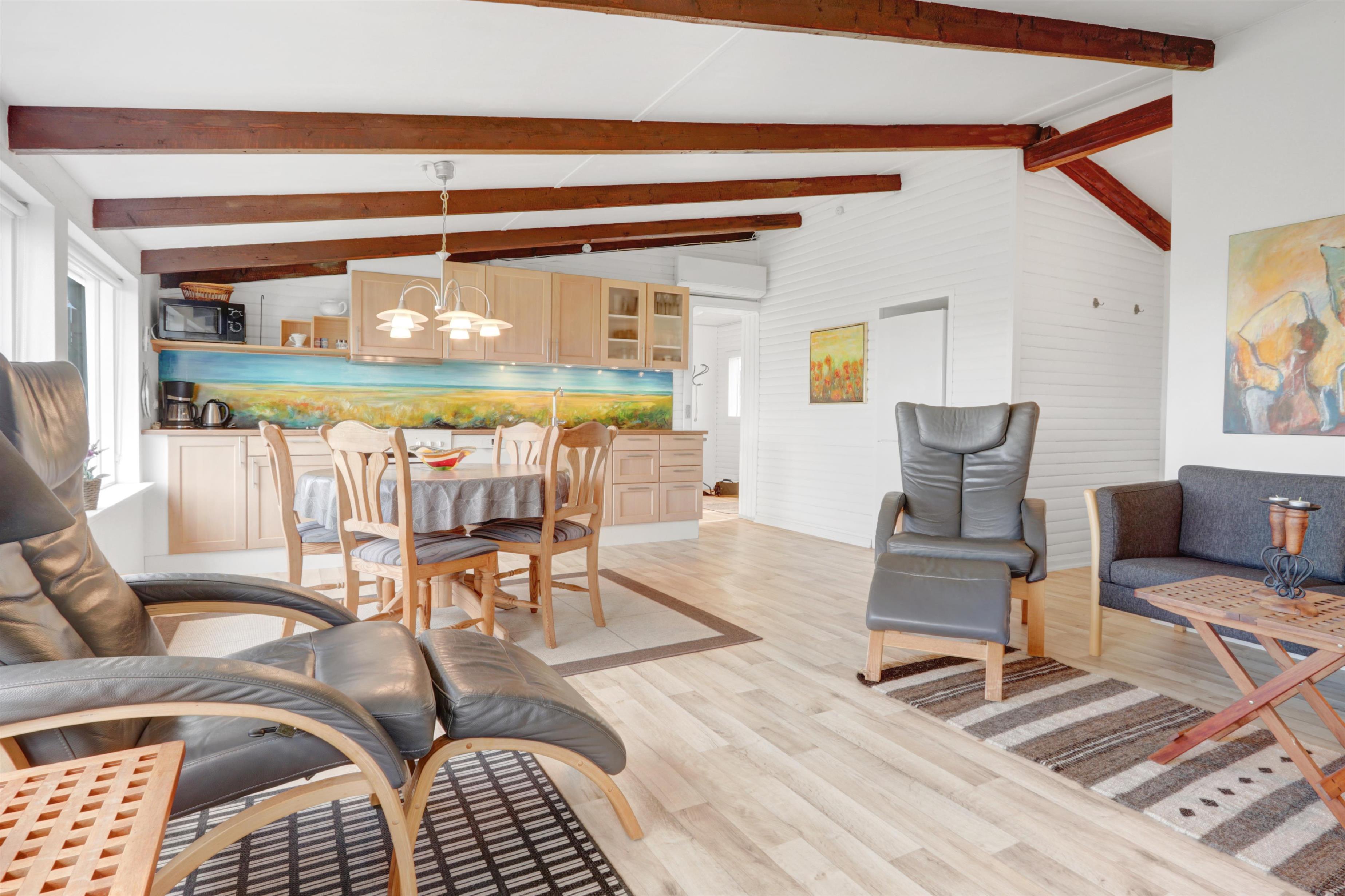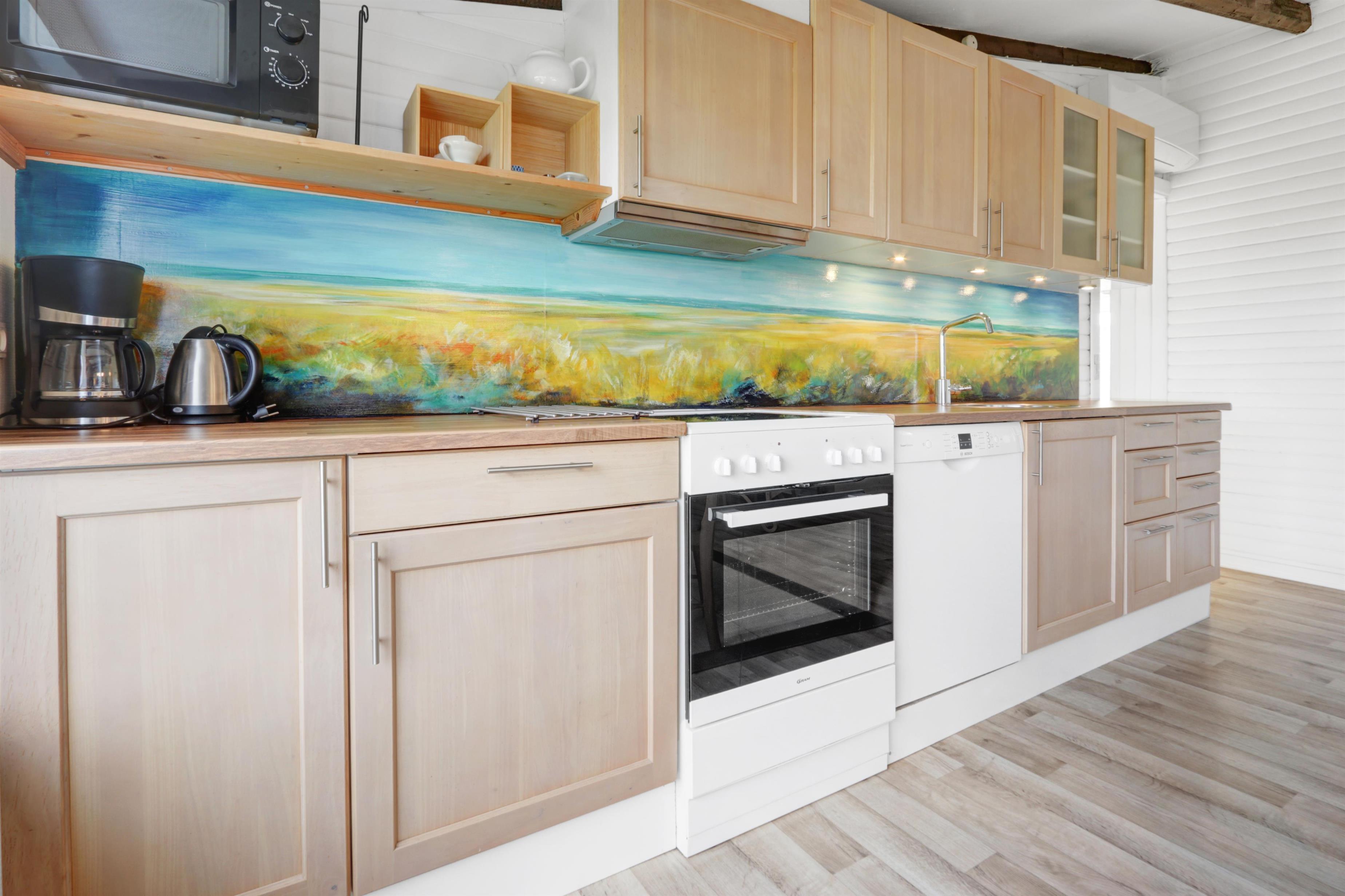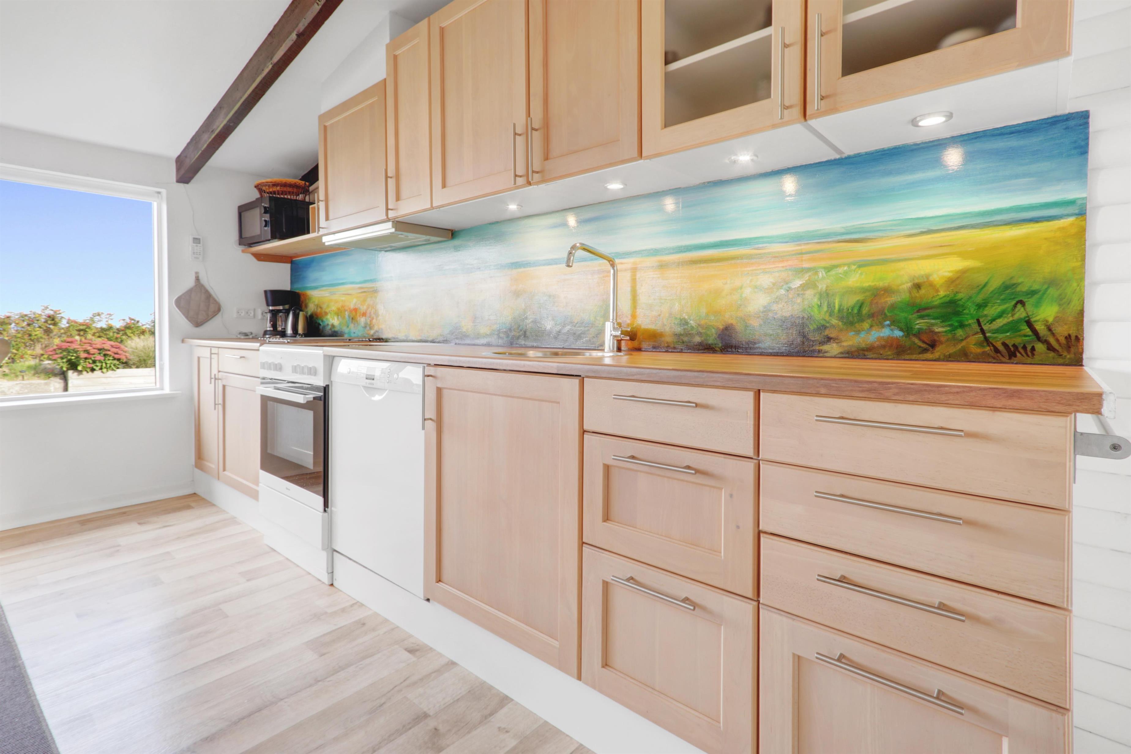Køkkenet er snuk dekoreret og fuldt udstyret med el-keramisk komfur, opvaskemaskine, køleskab, mikroovn og emhætte – perfekt til både hurtige måltider og hyggelig madlavning sammen. I stueafdelingen kan I slappe af i komfortable læder- og polstermøbler, mens I nyder danske og tyske tv-kanaler.
