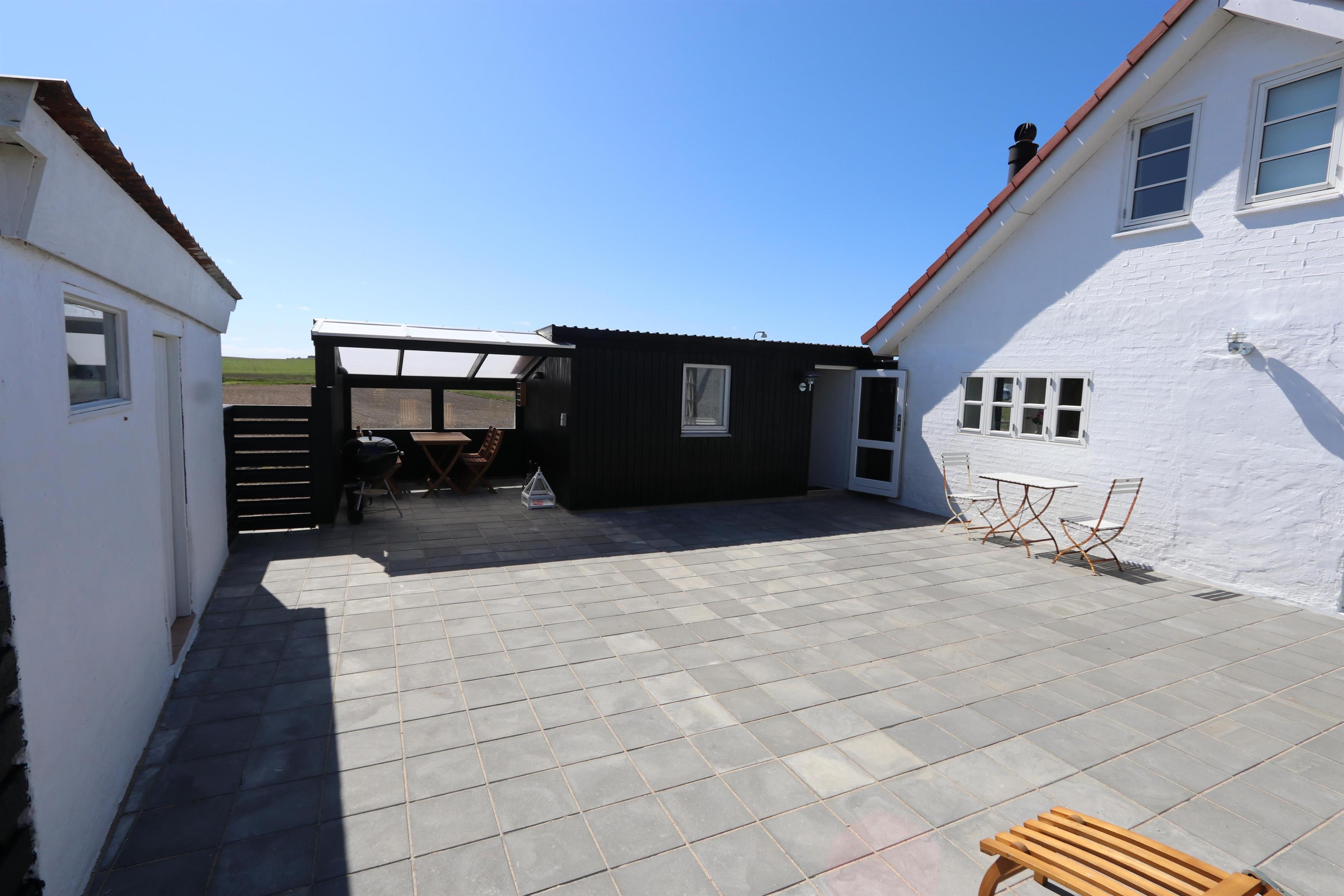 Fra entré er der udgang til indhegnet terrasse / solgård med havemøbler og grill. Her perfekt hvis børn eller husdyr medbringes. Et fantastisk velholdt og hyggeligt helårshus hvor parret eller den lille familie på max 4 personer får mulighed for få en afslappet ferie i unikke opgivelser tæt ved Bovbjerg Klint, Vesterhavet, Ferrings sø og Jens Søndergaards Museum. inden for 30-45 minutter nås både flere aktiviteter og shoppingmuligheder.