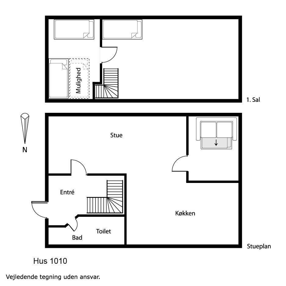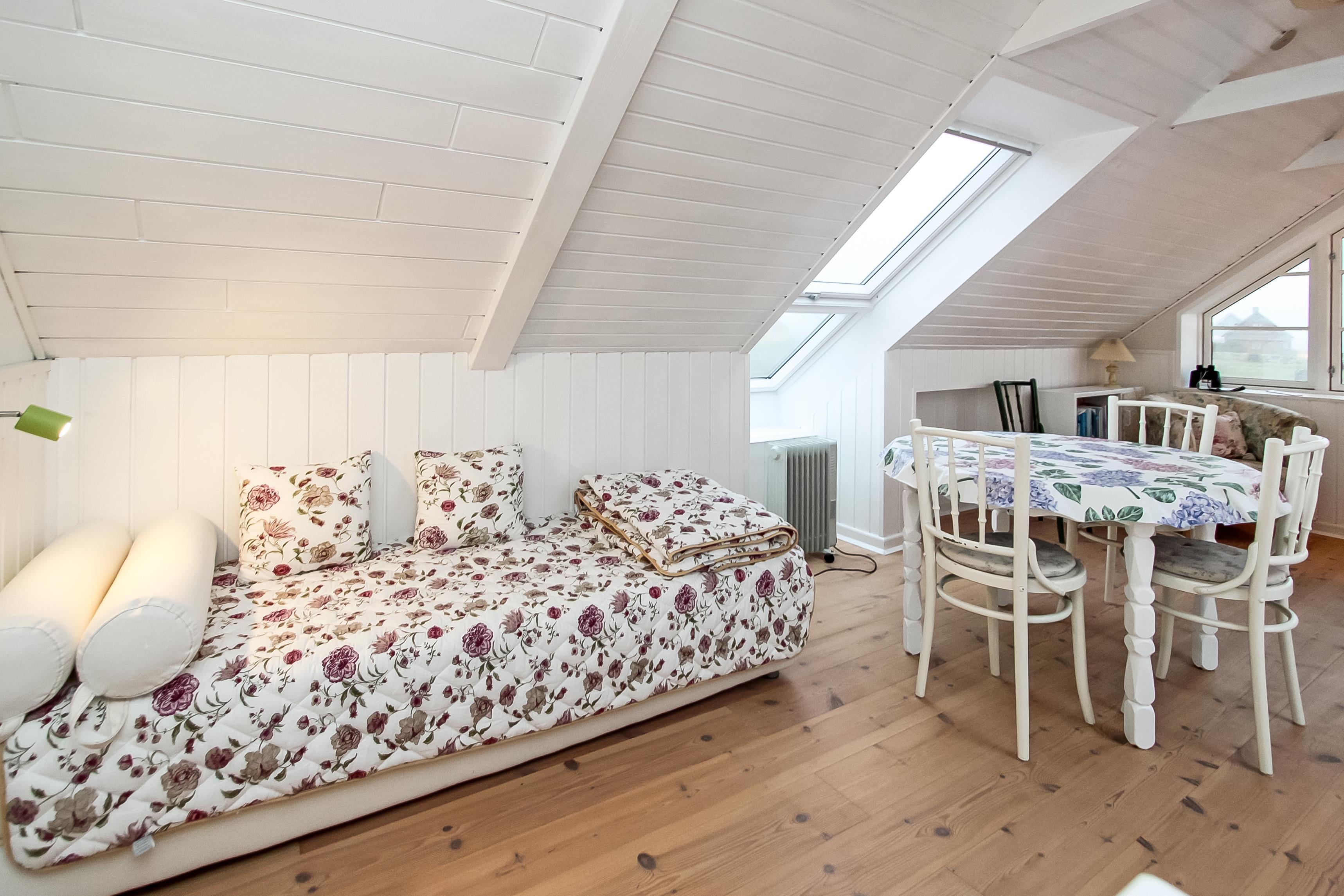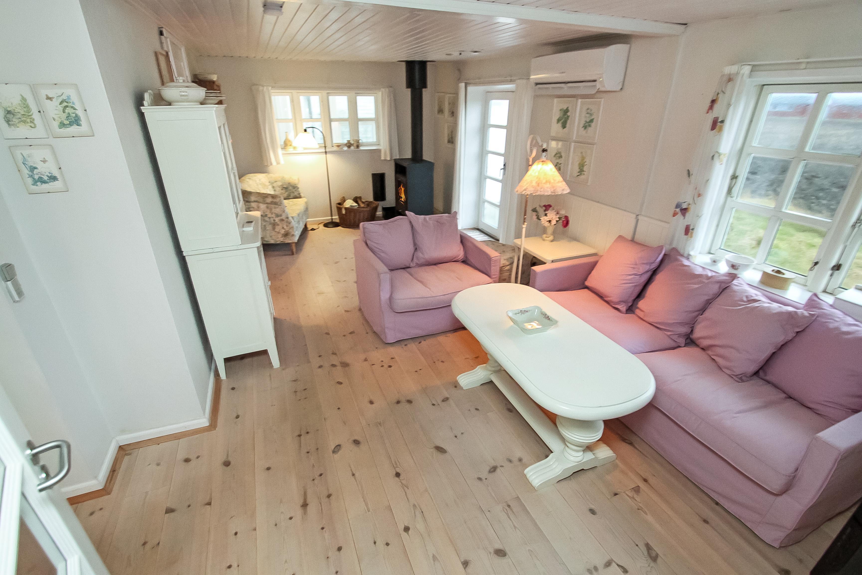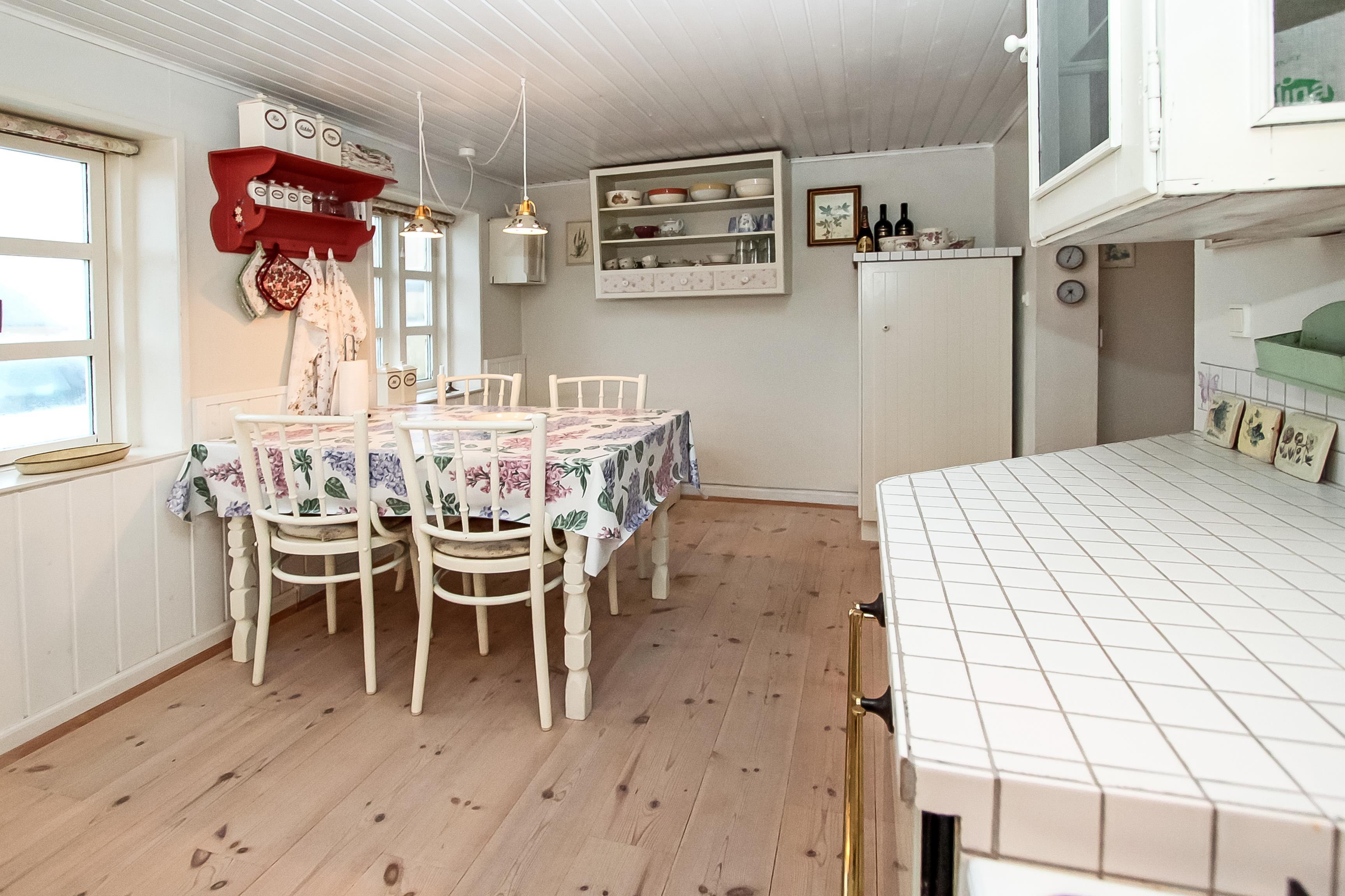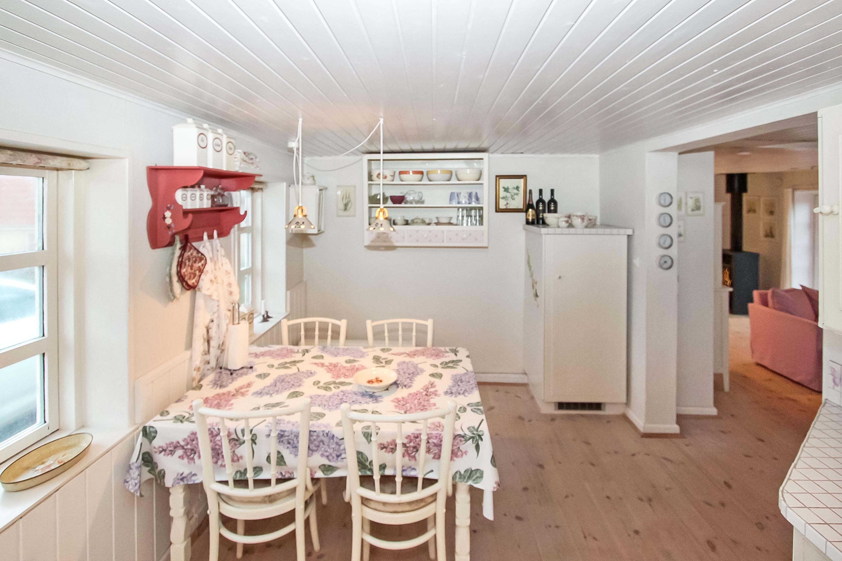 Pænt feriehus i 2 etager på 110 m2 med 1 værelse (1DS). Herudover er der i forbindelse med opholdsstuen et lille værelse med 1 DB sovesofa. Parker bilen i husets carport. Lås døren op til den lille entré med vaskemaskine og fryser. Træd ind i den hyggelige opholdsstue med polstermøbler, TV med danske, tyske, norske og svenske kanaler, adgang til ekstra værelse DB-sovesofa. Brændeovn og varmepumpe søger både for at holde varmen og for ekstra hygge i flammernes skær efter en frisk gåtur i området. Åbent, godt udstyret landkøkken med spiseplads, gaskogeplader, indbygningsovn, indbygget opvaskemaskine og køleskab. Den speciallavet køkkenbordsplade understreger, at der er kræset ekstra for netop dette rum. Mindre badeværelse med toilet, håndvask, bruser og klinkegulv.