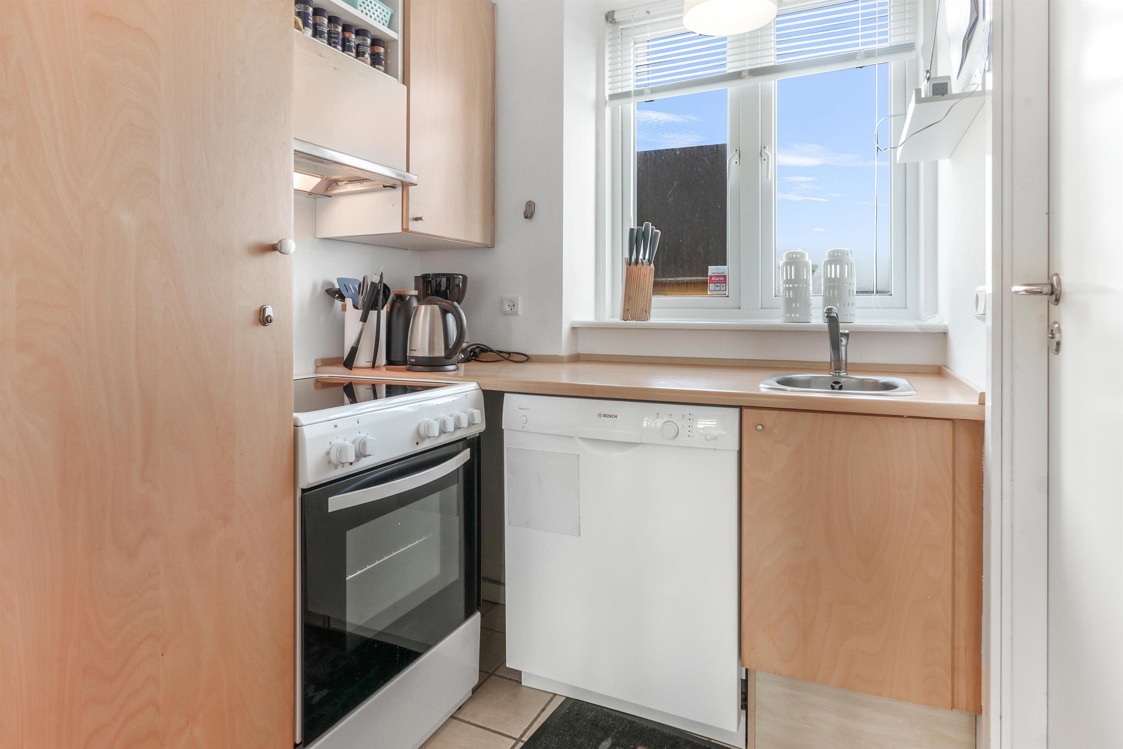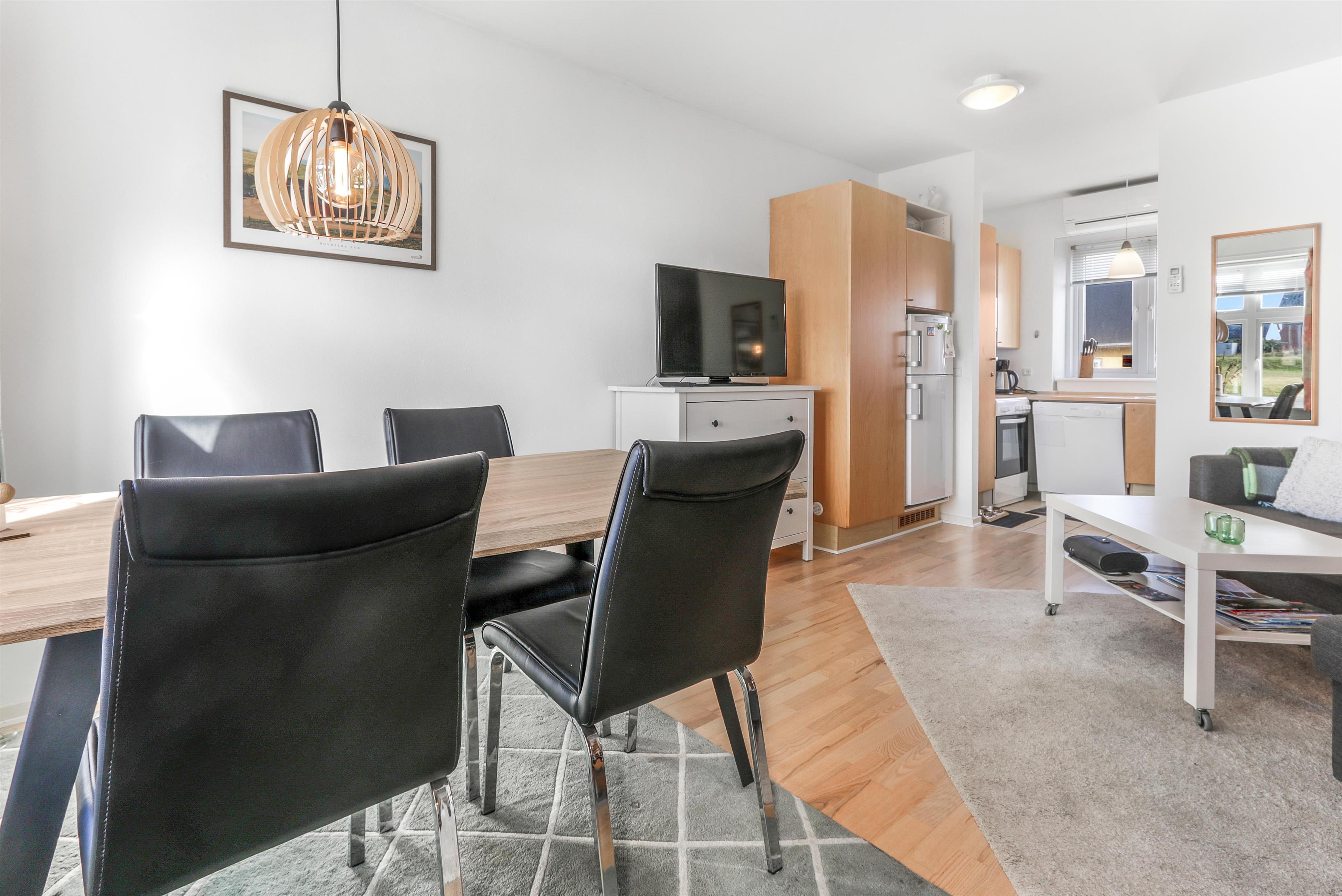 Indenfor finder I en lys og funktionel indretning, hvor opholdsstue og køkken er kombineret, så I kan være sammen om både madlavning og hygge. Stuen er indrettet med en komfortabel sofa, der også kan bruges som sovesofa, samt tv med danske kanaler og en dab-radio. Køkkenhjørnet er veludstyret med blandt andet keramiske kogeplader, ovn, mikroovn, opvaskemaskine og køleskab, så det er nemt at tilberede måltiderne. Badeværelset har bruser, toilet og håndvask, og i huset er der desuden vaskemaskine og en energivenlig varmepumpe.