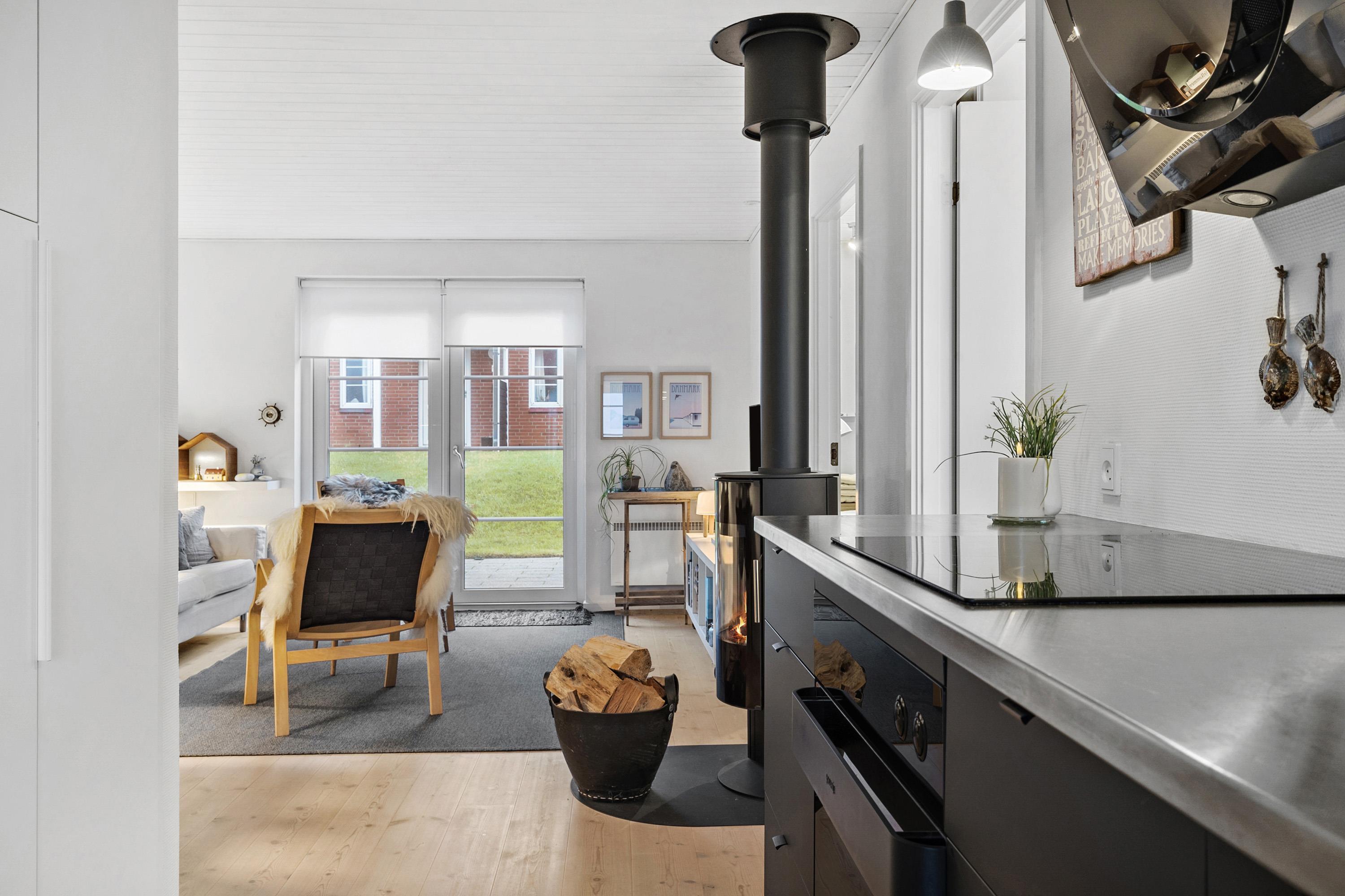 Funktionelt indrettet med to soverum (1DS, 1DS) og en kombineret opholdsstue og køkken. Opholdsstuen er hyggeligt møbleret og har et stort vinduesparti, der giver et fantastisk lysindfald. Her findes også TV med danske og skandinaviske kanaler, Chromecast, DVD-afspiller og en stemningsfuld brændeovn.
