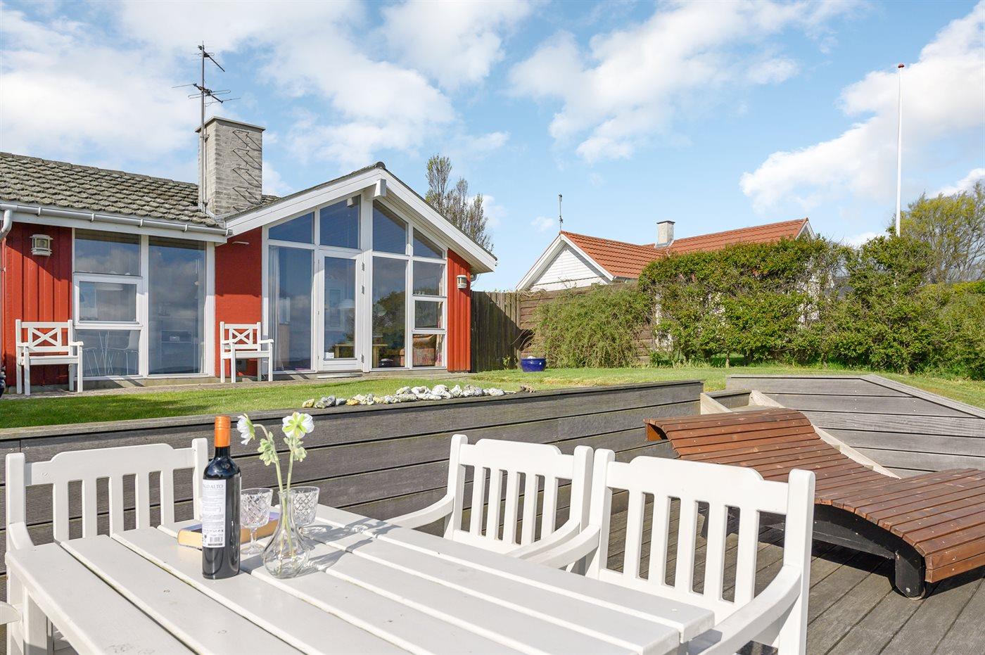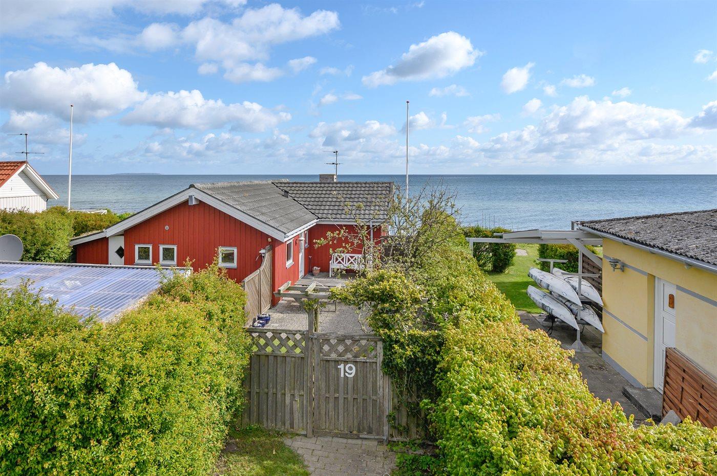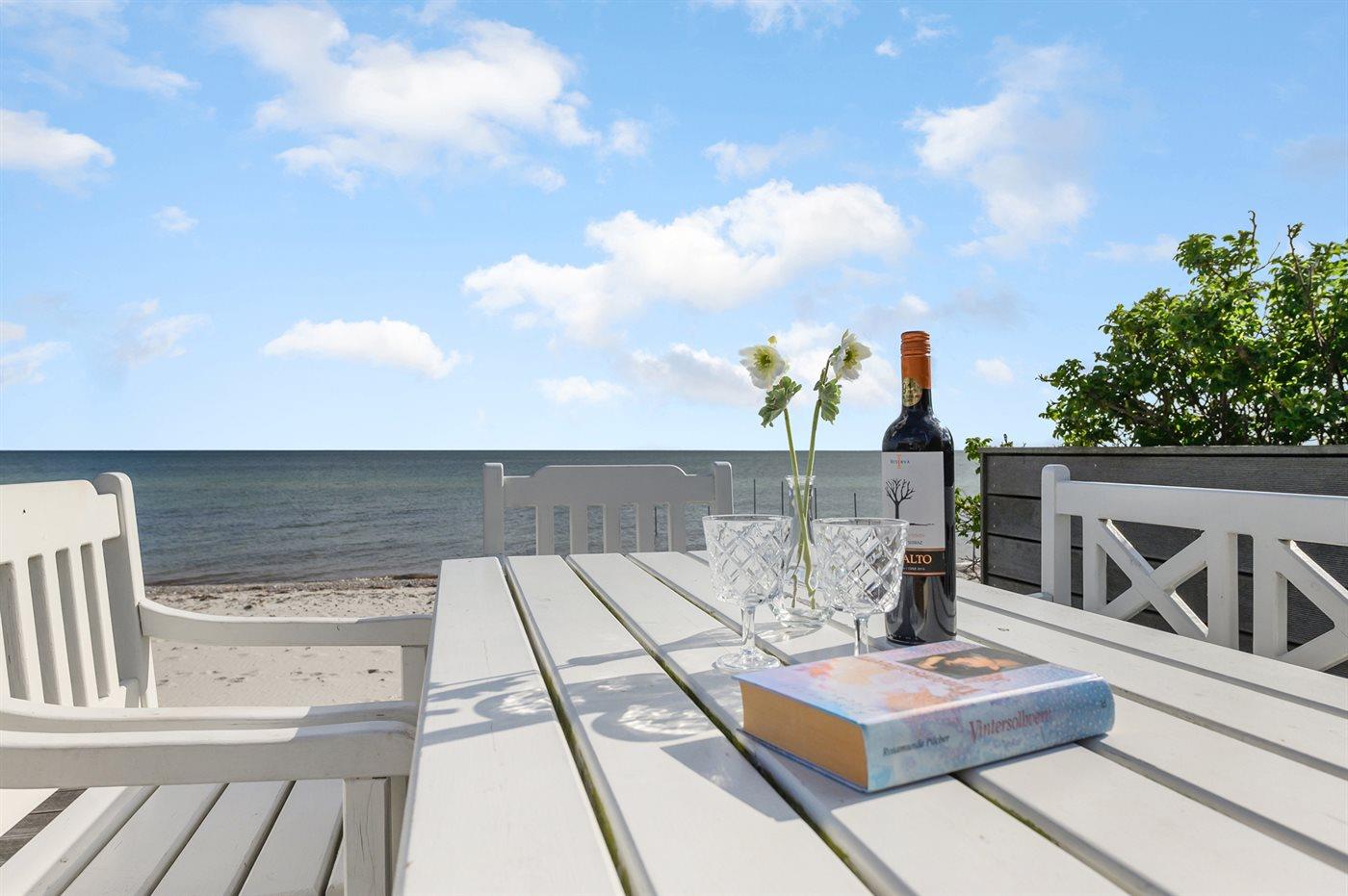 Nyd panoramaudsigten over havet fra dette charmerende sommerhus med anneks og stor træterrasse ved vandkanten.