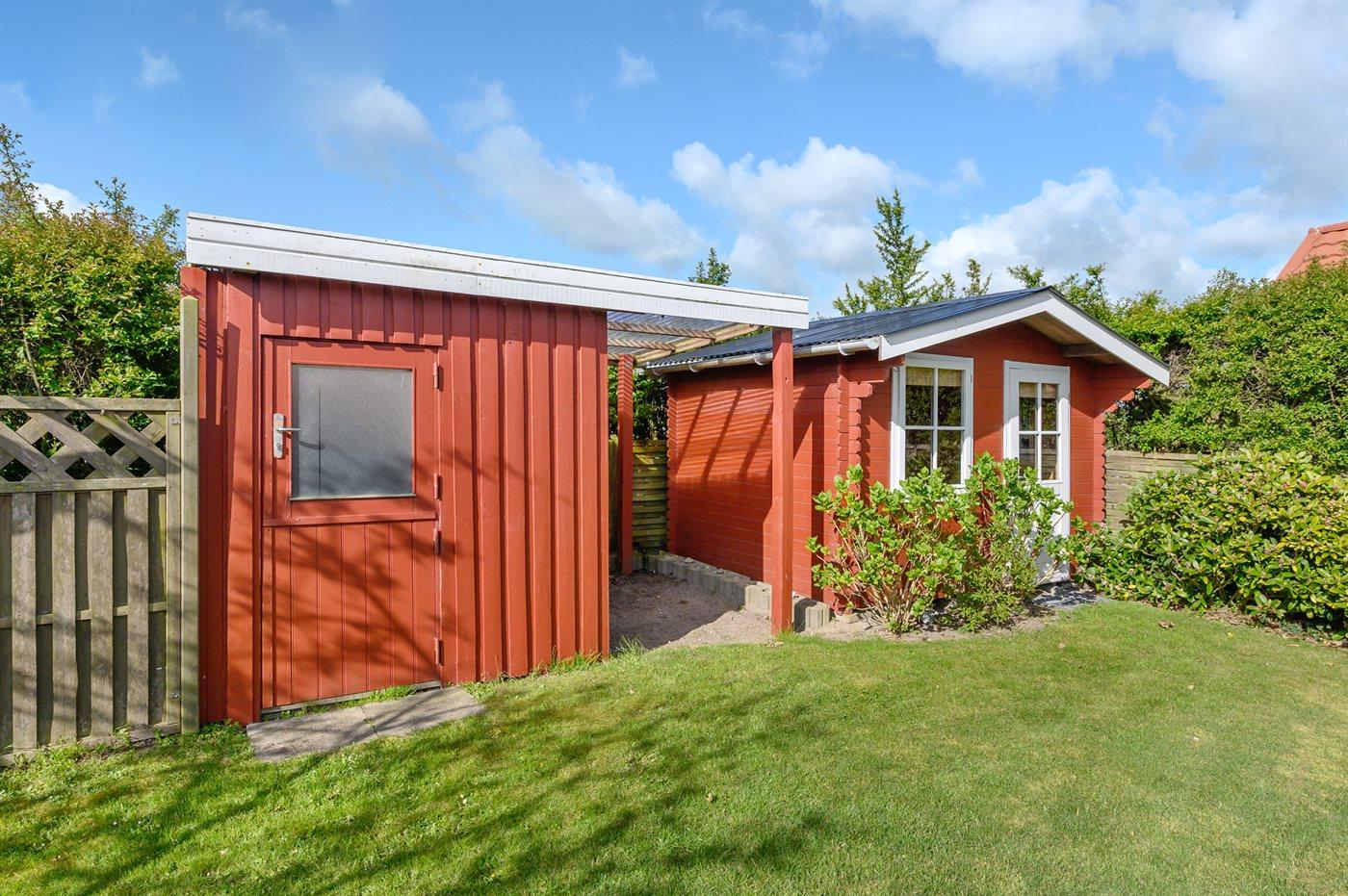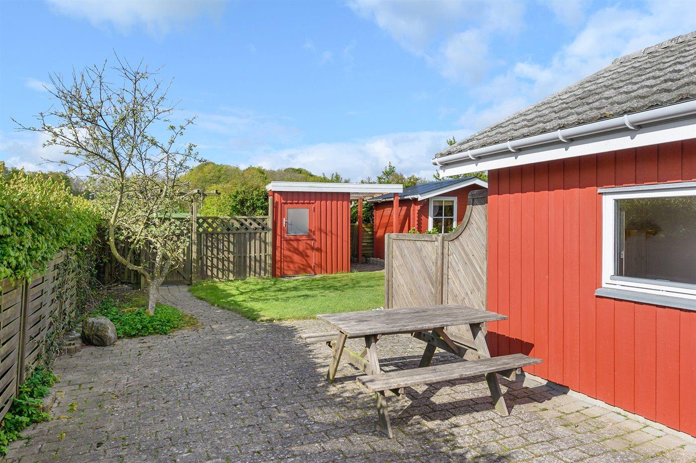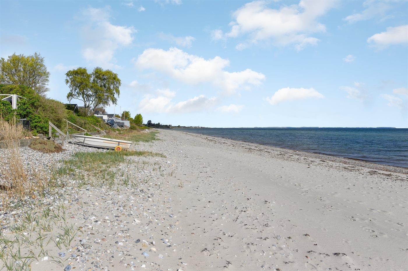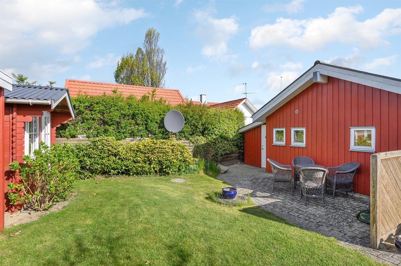 Ferieboligen er beliggende på en 600 m² stor havegrund. Der er 5 m til havet. Nærmeste forretning er beliggende i en afstand af 10000 m. Til ferieboligen hører 30 m² terrasseareal. Der er installeret stik til opladning af elbil. Type 2 stik. Med 11 kW ladeeffekt. Parkering ved ferieboligen.