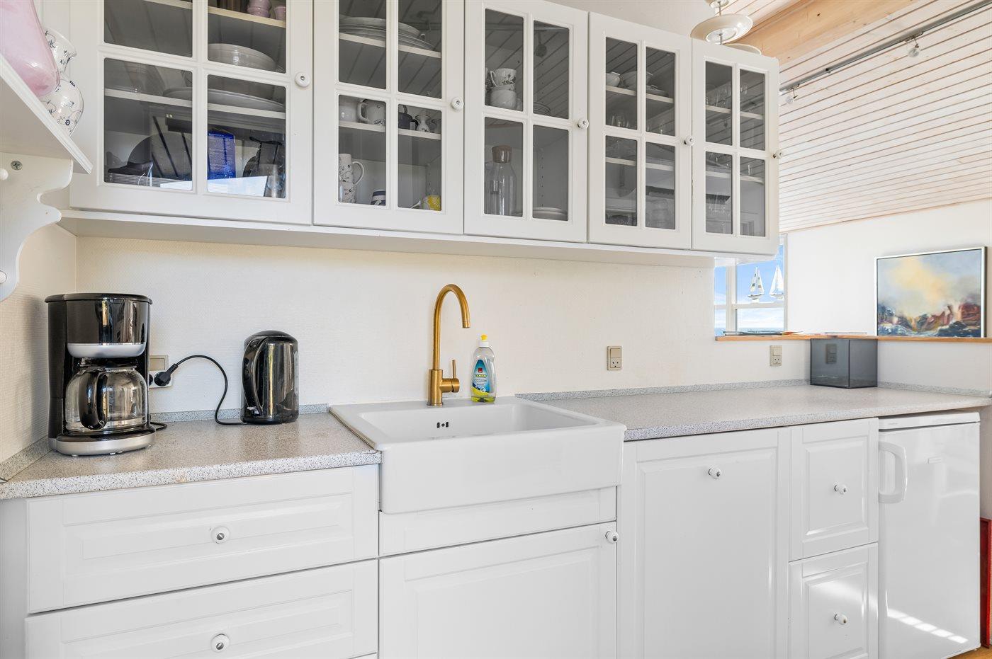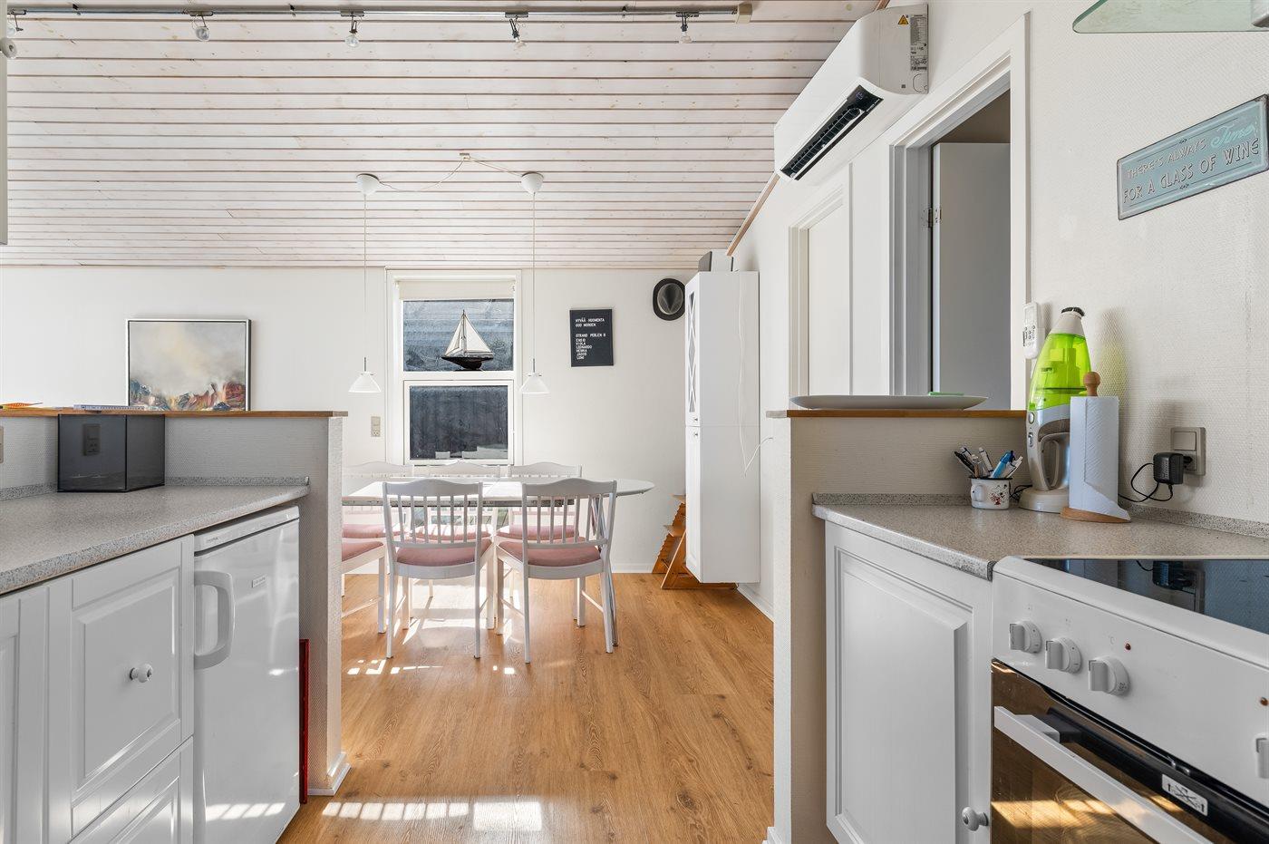 Køkkenet er udstyret med 1 køleskab. Der er 4 keramiske kogeplader, varmluftovn, mikrobølgeovn samt opvaskemaskine Der er gulvvarme i køkkenet.