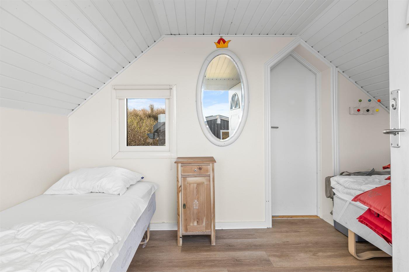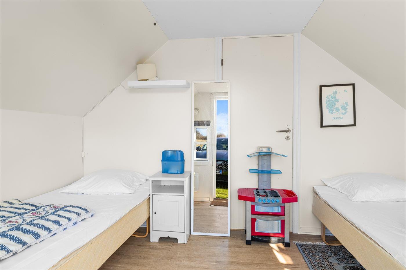 Der er i alt 4 soveværelser. Sovepladserne fordeler sig på: 6 sovepladser i enkeltsenge. 2 sovepladser i sovesofa (dobbelt). 4 af disse sovepladser befinder sig i anneks. Derudover er der 1 stk. barneseng. Der er gulvvarme i 2 af soveværelserne.