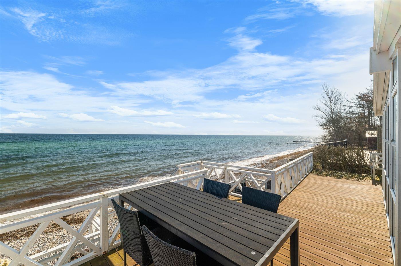 Foran huset er der trappe ned til en ekstra terrasse ved vandet og herfra trappe ned til stranden. Bag huset er der også terrasse, så der er mulighed for at sidde ude, selv på blæsende dage. Bag huset ligger husets anneks, hvor to af soveværelserne ligger med hver sin indgang.