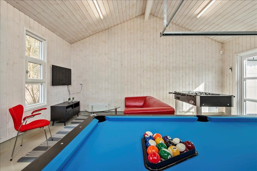 Sommerhuset byder dig velkommen med en lys og luftig indretning, der straks får dig til at føle dig hjemme. Den rummelige stue er indrettet med komfortable møbler og et åbent køkken, så I kan være sammen om madlavningen, mens I stadig nyder hinandens selskab. En stor poolafdeling sætter prikken over i’et, hvor hele familien kan tage en forfriskende dukkert eller slappe af i det varme vand. Aktivitetsrummet med poolbord sikrer underholdning for alle aldre, uanset om I er til konkurrenceprægede spil eller bare vil hygge jer sammen. Med flere soveværelser og det hyggelige anneks er der plads til både store og små at finde ro og komfort efter en lang dag med oplevelser.
