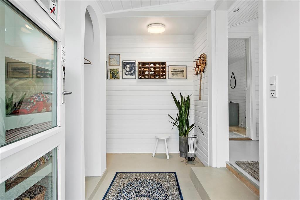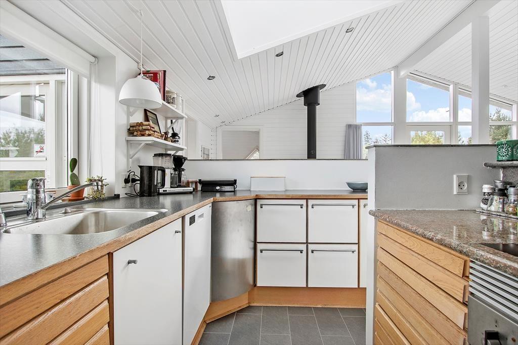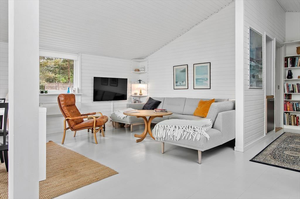 Indenfor byder sommerhuset på en varm og indbydende atmosfære. De lyse rum er indrettet med stor opmærksomhed på komfort og hygge, så du med det samme føler dig hjemme. I stuen kan du nyde den knitrende varme fra brændeovnen, mens du kigger ud på den flotte natur. Er du til ekstra afslapning, kan du forkæle dig selv med et spabad i det indendørs wellnessområde. De hyggelige rum giver masser af plads til samvær med familie og venner, og den smukke udsigt fra vinduerne gør det endnu mere fristende at blive inde og slappe af i de lyse omgivelser.