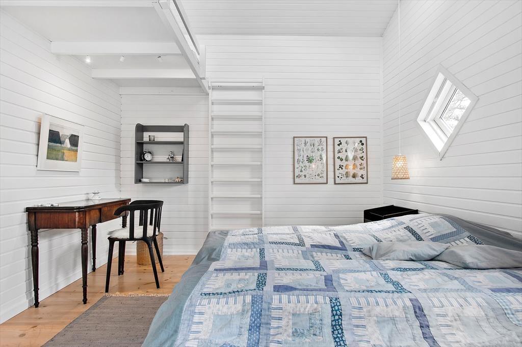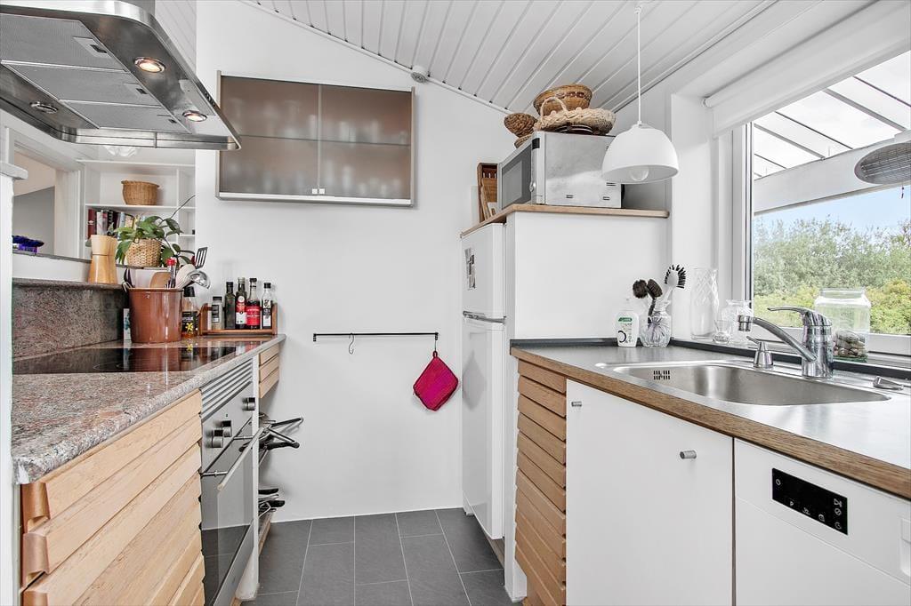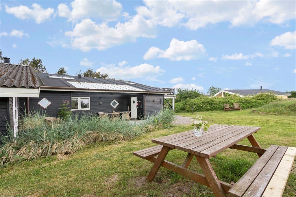 Udenfor finder du flere dejlige terrasseområder, hvor du kan sidde og nyde de rolige omgivelser. Den store træterrasse er det perfekte sted til både solbadning om dagen og afslappende middage under åben himmel om aftenen. Her kan du høre fuglene synge, mærke den friske luft og lade tankerne flyve. Den smukke naturgrund er ideel til både afslapning og leg, og med husets placering har du en fantastisk udsigt over landskabet, som giver en følelse af at være helt i ét med naturen. Og med kun 250 meter til stranden, kan du hurtigt tage en dukkert i det klare vand eller gå en lang tur langs kysten.