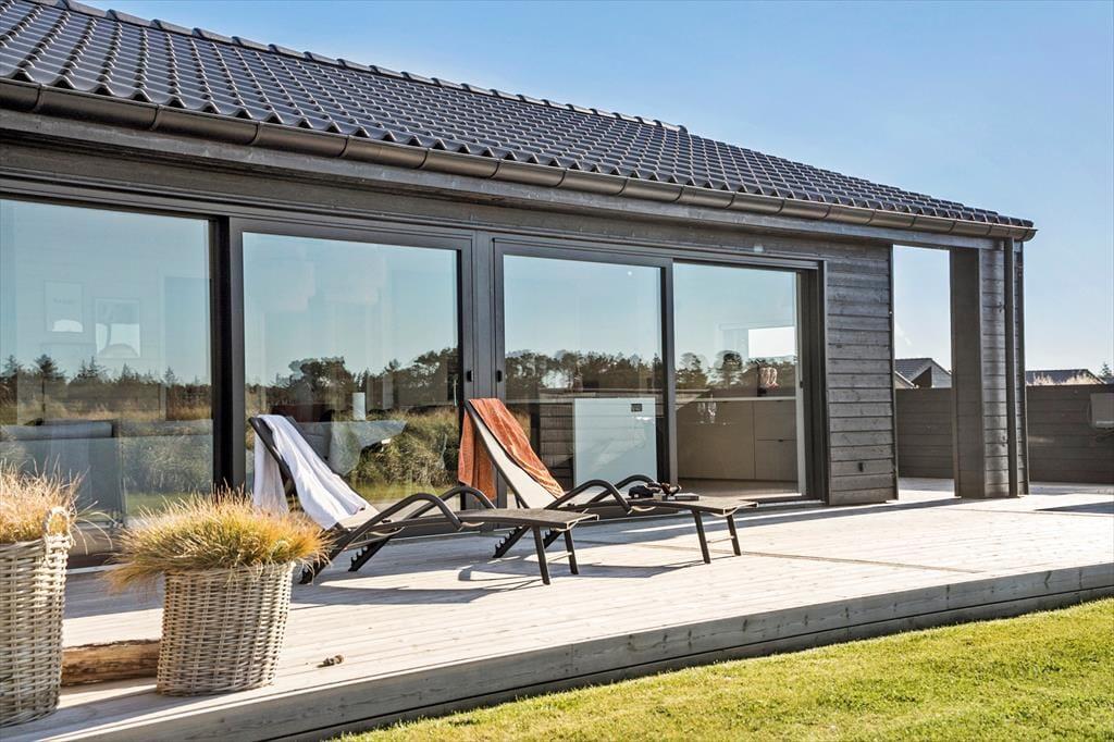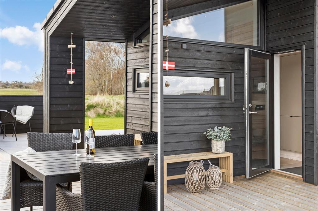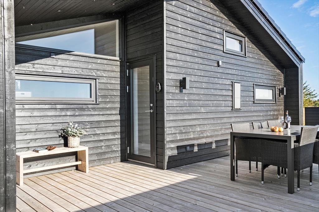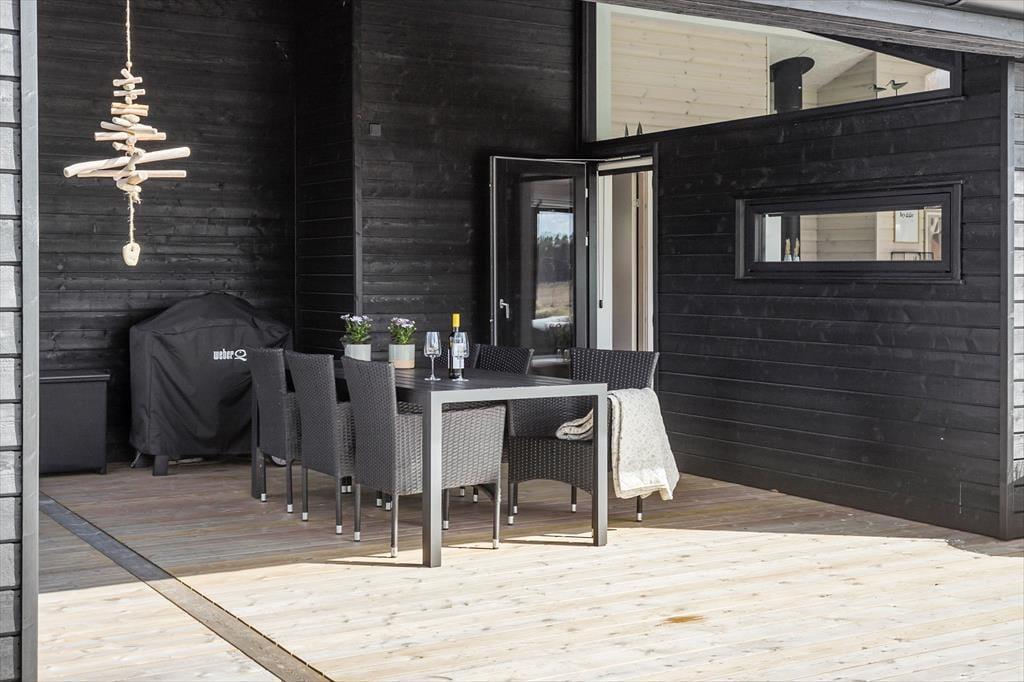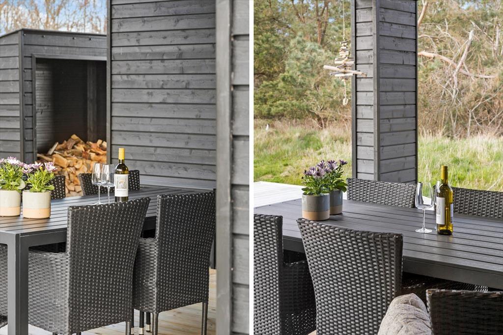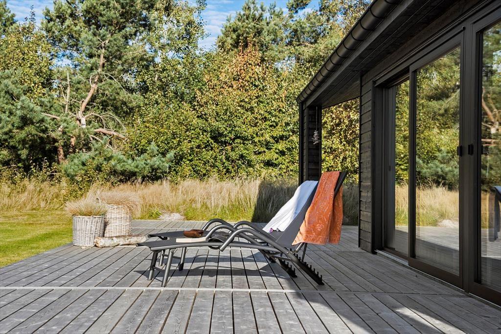 En stor træterrasse breder sig hele vejen rundt om sommerhuset, så det er nemt at finde en solstråle at sidde i – eller at vælge en skyggefuld opholdsplads på et af de overdækkede arealer. Her for enden af vejen har du fred og ro omkring dig, og det er skønt at kunne kigge lige ud på træer og åbne marker. Sådan en udsigt må altså gøre noget godt for både krop og sjæl! Et morgenbad under udebruseren kan sikkert også gøre underværker, hvis du vil føle dig i kontakt med naturen og friskes op på samme tid. Trampolinen vil børnene sikkert blive vilde med, mens målene på græsplænen indbyder til en hurtig kamp for hele familien.