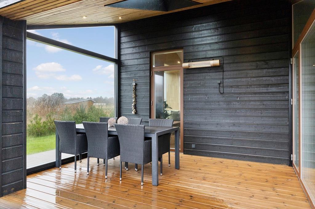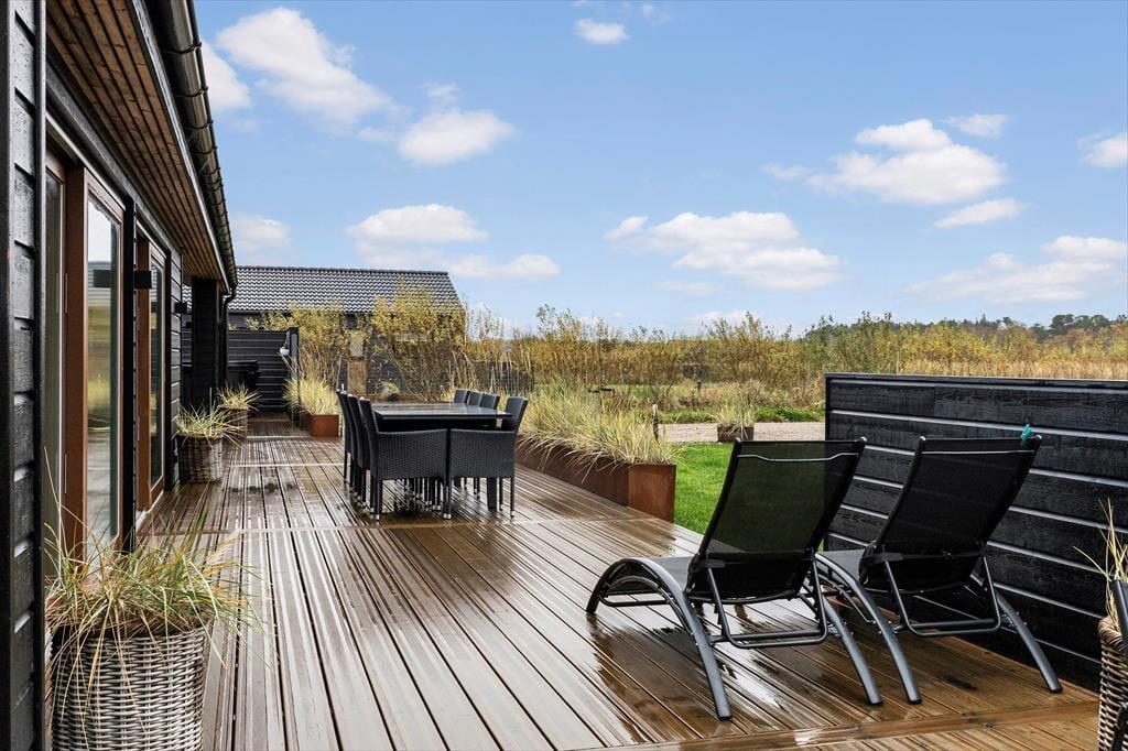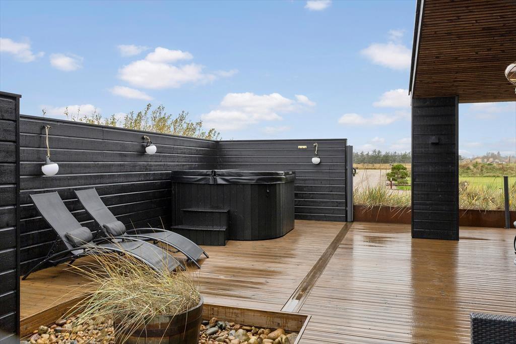 Udenfor venter en stor, solrig grund med masser af plads til både afslapning og leg. Her kan børnene hoppe på trampolinen eller spille bold på plænen, mens de voksne nyder en kop kaffe eller et glas vin på en af de dejlige terrasser. Terrasserne er anlagt, så du altid kan finde sol eller læ – og en del af udearealet er overdækket med terrassevarmer, så udelivet kan fortsætte langt ud på aftenen. Her finder du også det skønneste udespa og en udendørs bruser, som indbyder til ren velvære efter en dag på stranden eller en frisk gåtur i naturen. Gasgrillen står klar til brug (gas er inkluderet), og duften af grillmad kan hurtigt sprede sig i den lune sommeraften. For de aktive er der gode muligheder for underholdning både ude og inde – fra bordtennis og volleyball til spillekonsol og paddleboard. Her er kort sagt lagt op til både leg, samvær og ren afslapning midt i naturen.