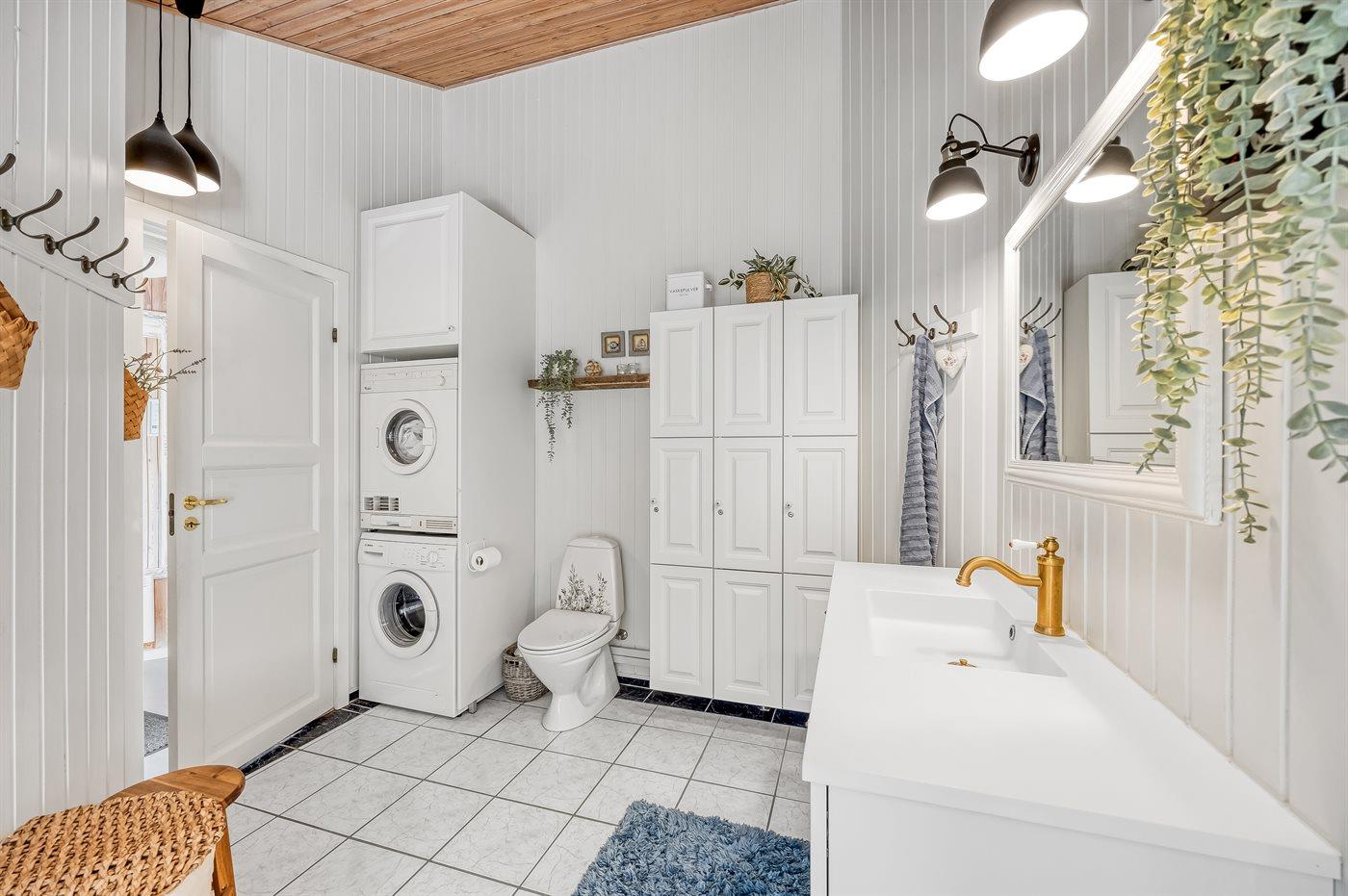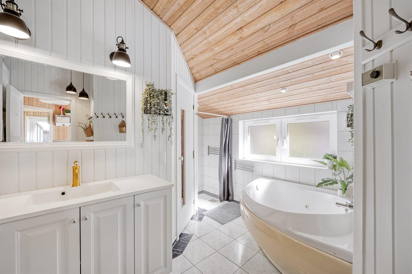 Der er 2 badeværelser med bruseniche og 2 toiletter, heraf 1 gæstetoilet. Der er gulvvarme på 1 badeværelse. I saunaen er der mulighed for afslapning.