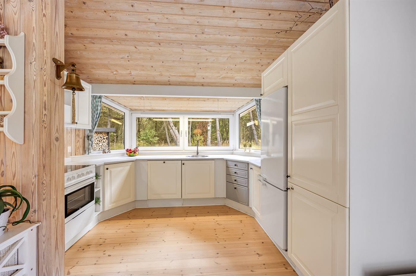 Køkkenet er udstyret med 1 køleskab. Der er 4 keramiske kogeplader, varmluftovn, mikrobølgeovn samt opvaskemaskine.