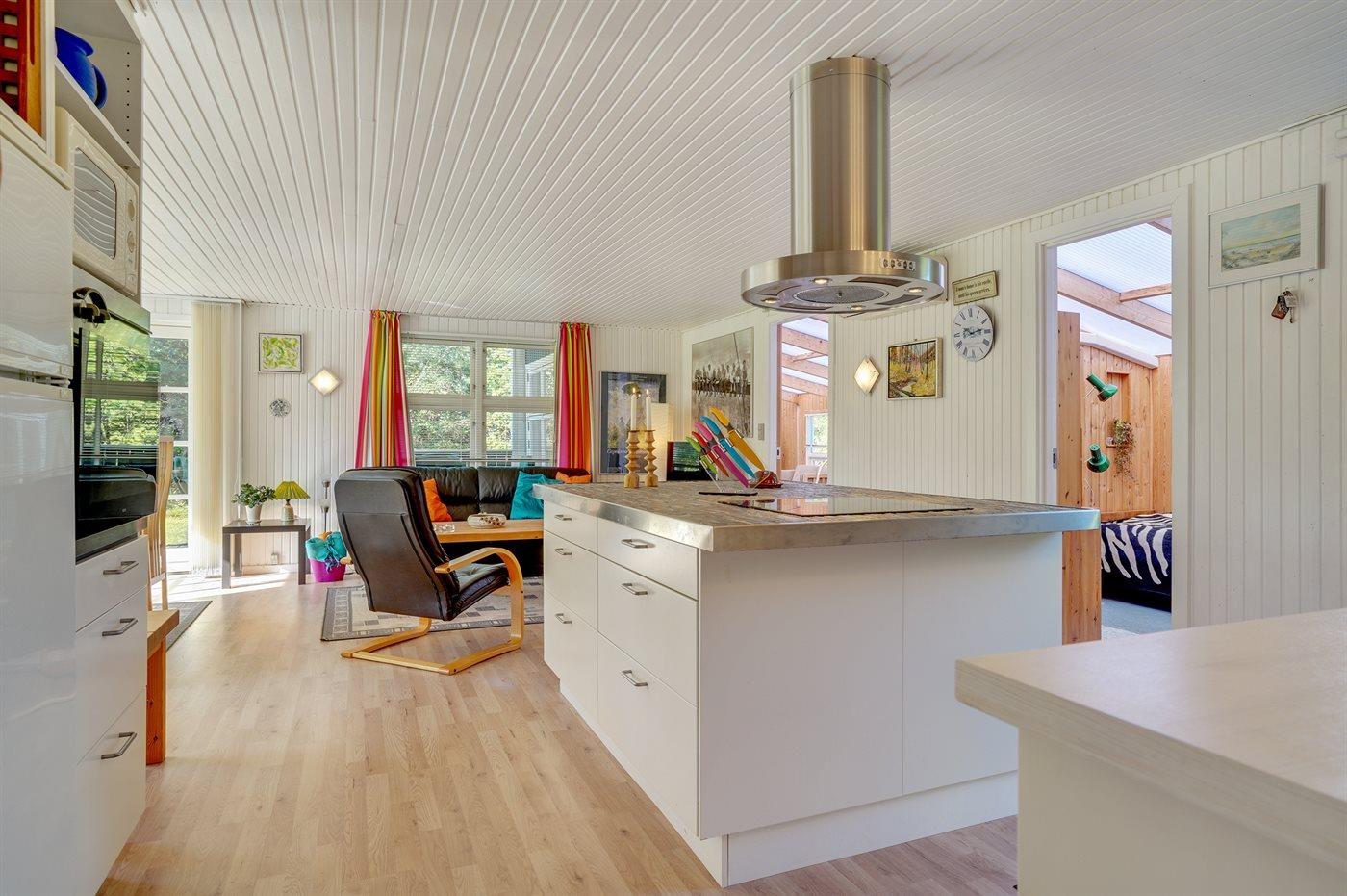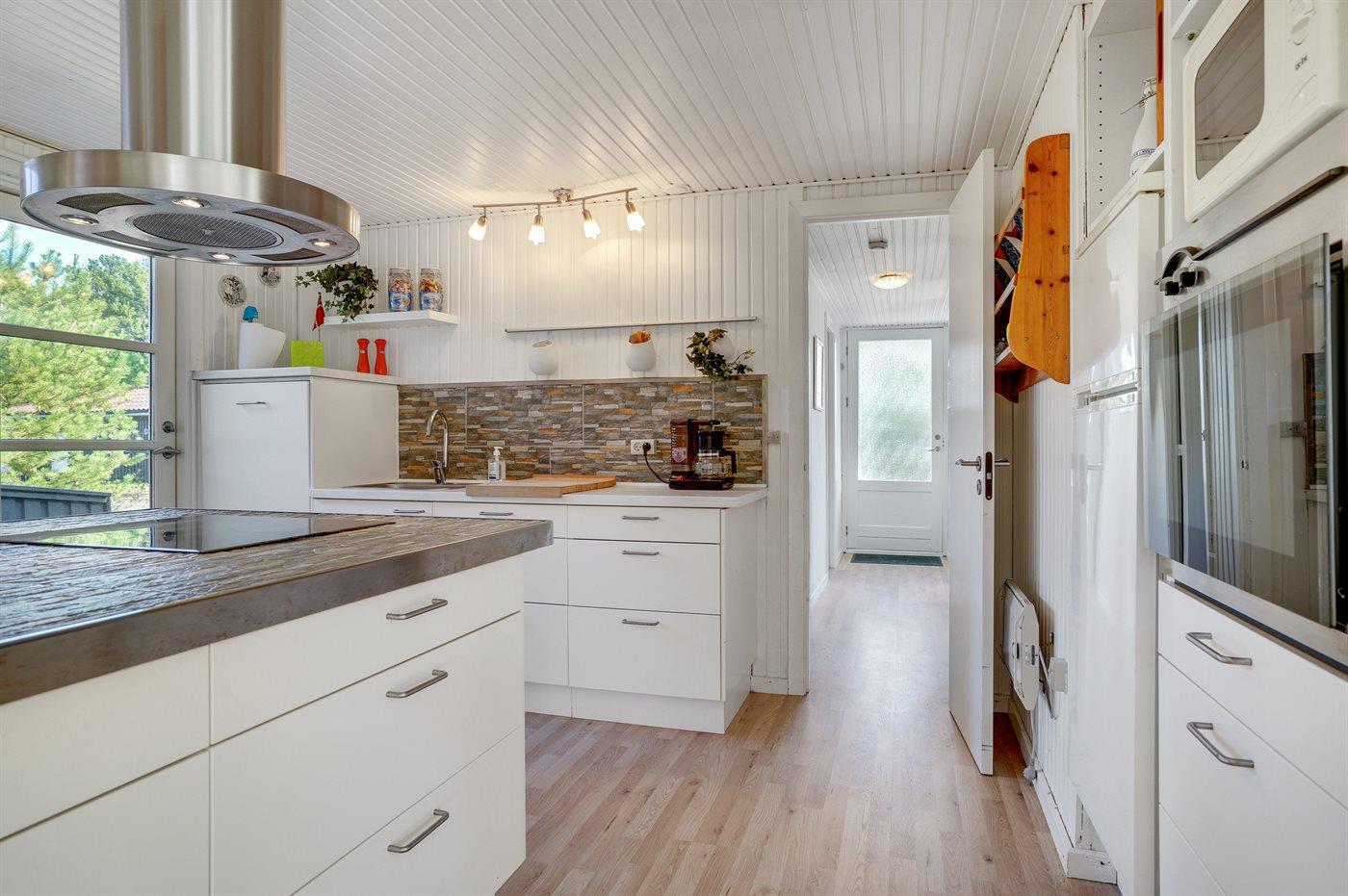 Køkkenet er udstyret med 1 køleskab. Der er 4 keramiske kogeplader, varmluftovn, mikrobølgeovn samt opvaskemaskine.