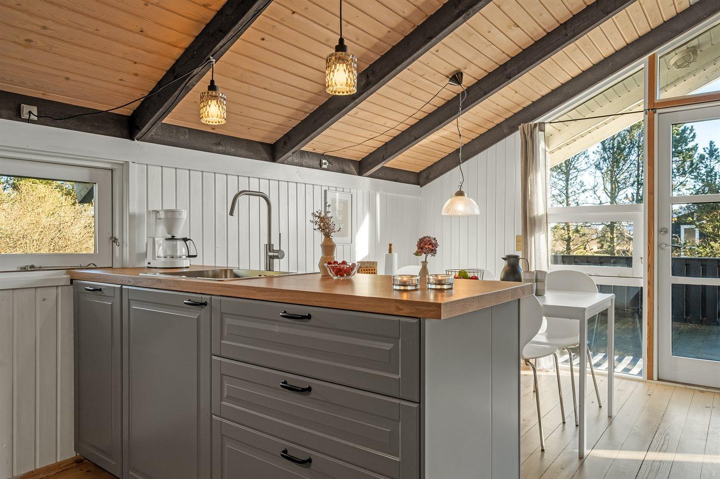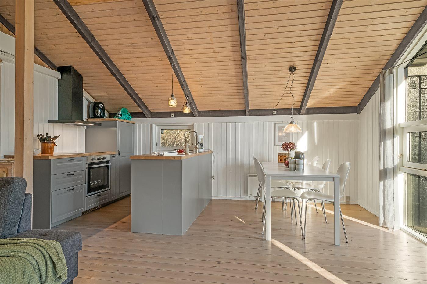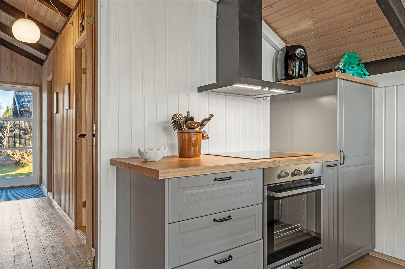 Køkkenet er udstyret med 1 køleskab. Der er 4 keramiske kogeplader, varmluftovn samt opvaskemaskine.