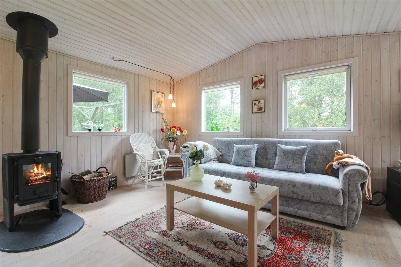 Hyggeligt sommerhus i Bratten nær havet med terrasse, brændeovn og husdyr tilladt.