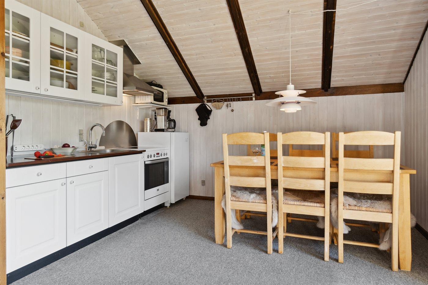 Køkkenet er udstyret med 1 køleskab. Der er 4 keramiske kogeplader, varmluftovn, mikrobølgeovn.