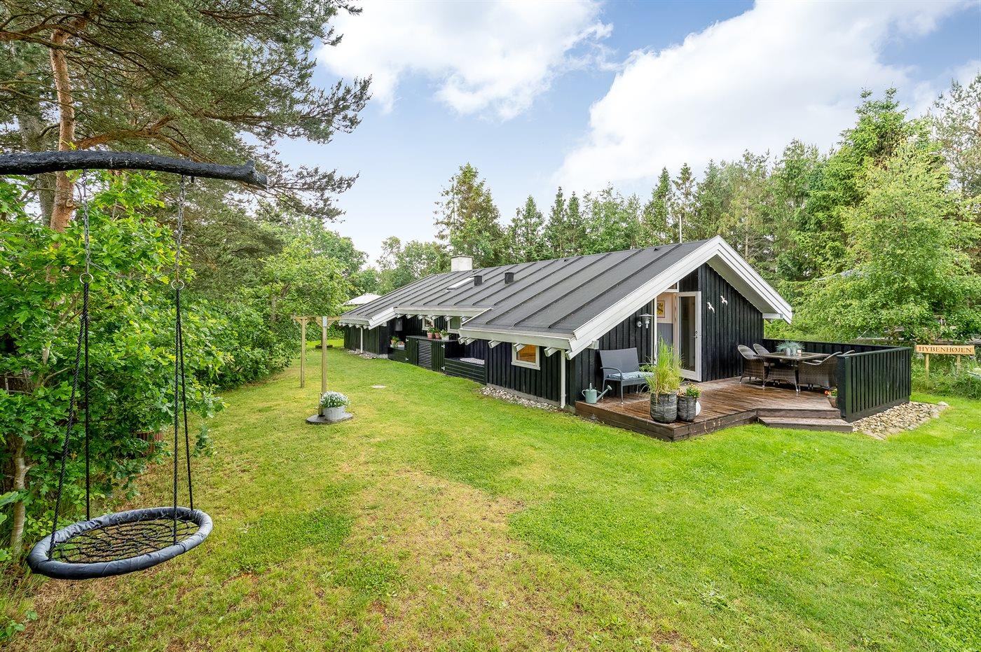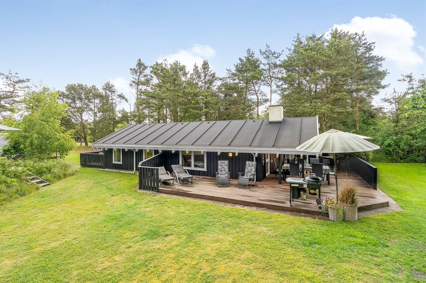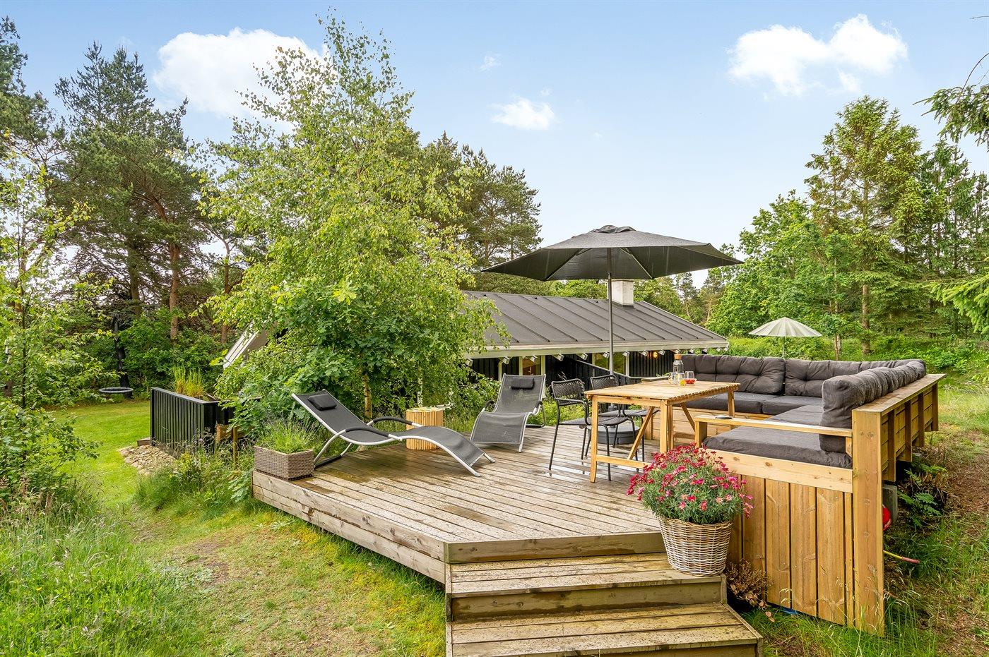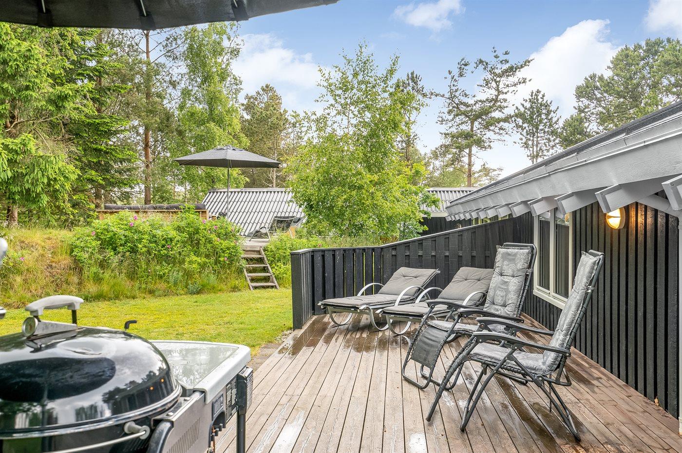 Ferieboligen er beliggende på en 2500 m² stor naturgrund. Der er 400 m til havet. Nærmeste forretning er beliggende i en afstand af 1000 m. Til ferieboligen hører åbent terrasseareal. Desuden er der overdækket terrasse. Der er redskabsrum. Sandkasse. Grill til rådighed. Der er carport til rådighed. Parkering ved ferieboligen.