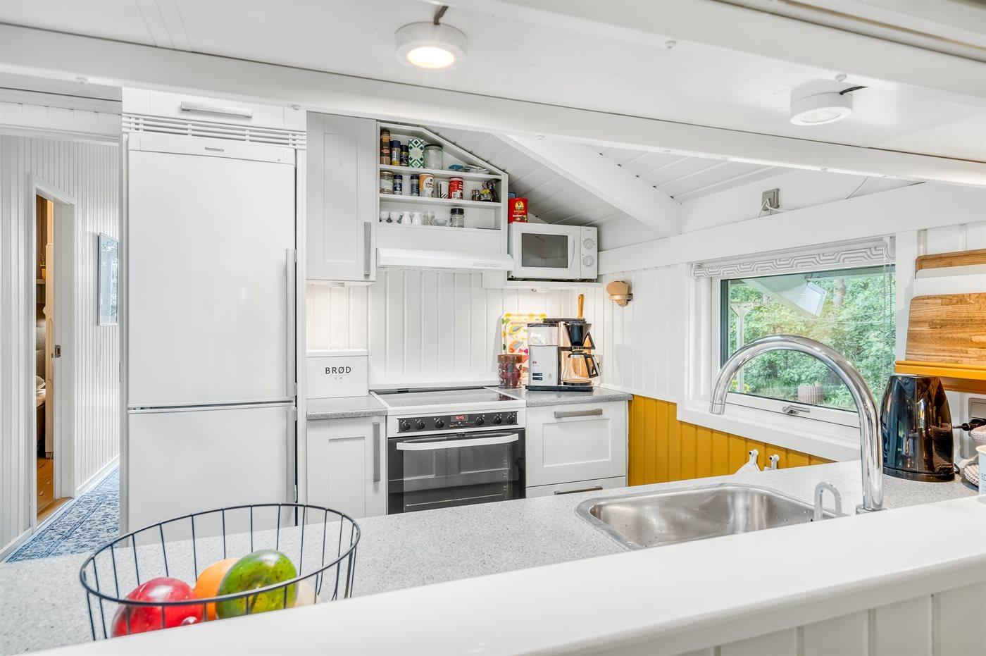 Køkkenet er udstyret med 1 køleskab. Der er 4 keramiske kogeplader, varmluftovn, mikrobølgeovn samt opvaskemaskine.